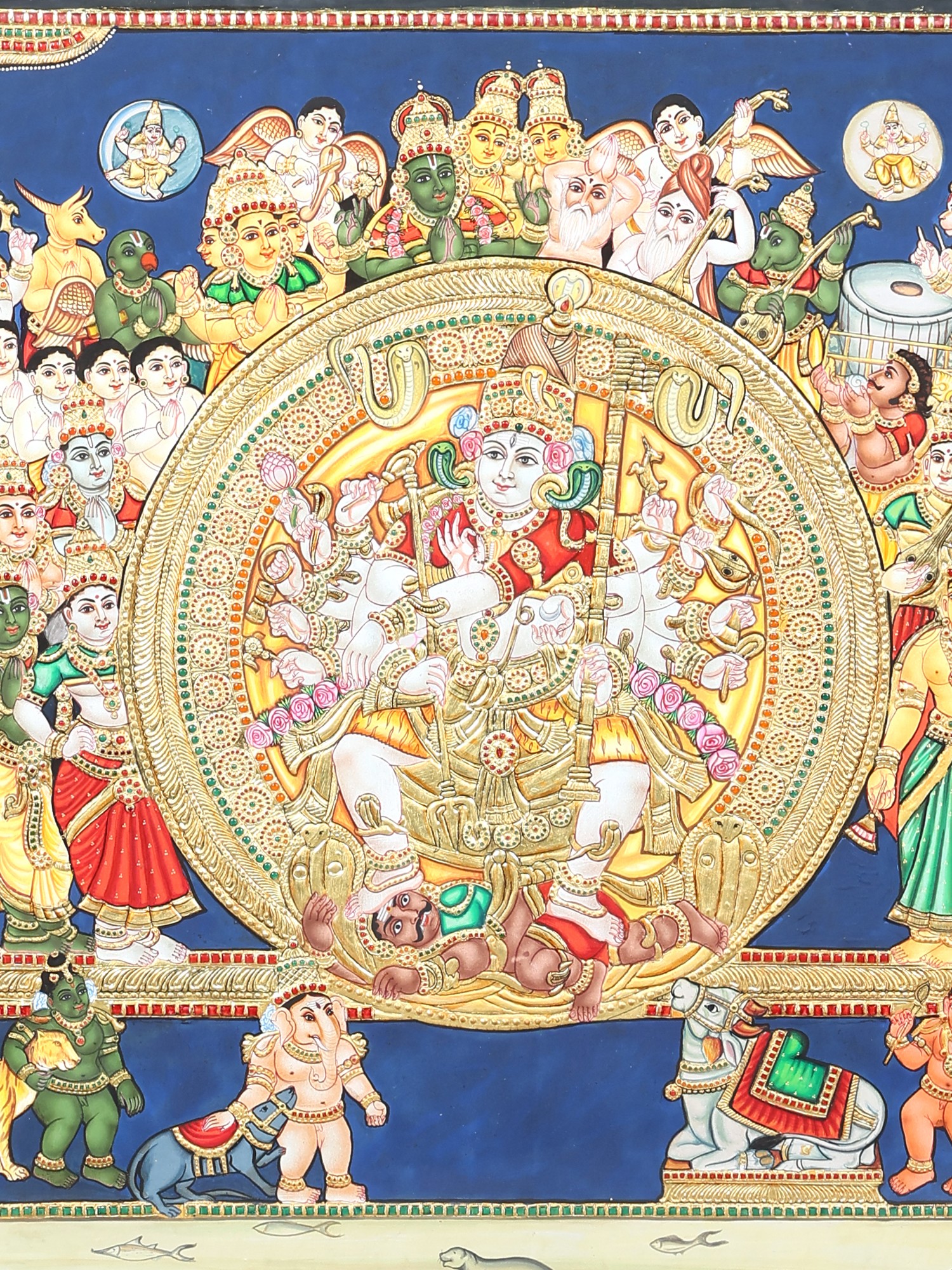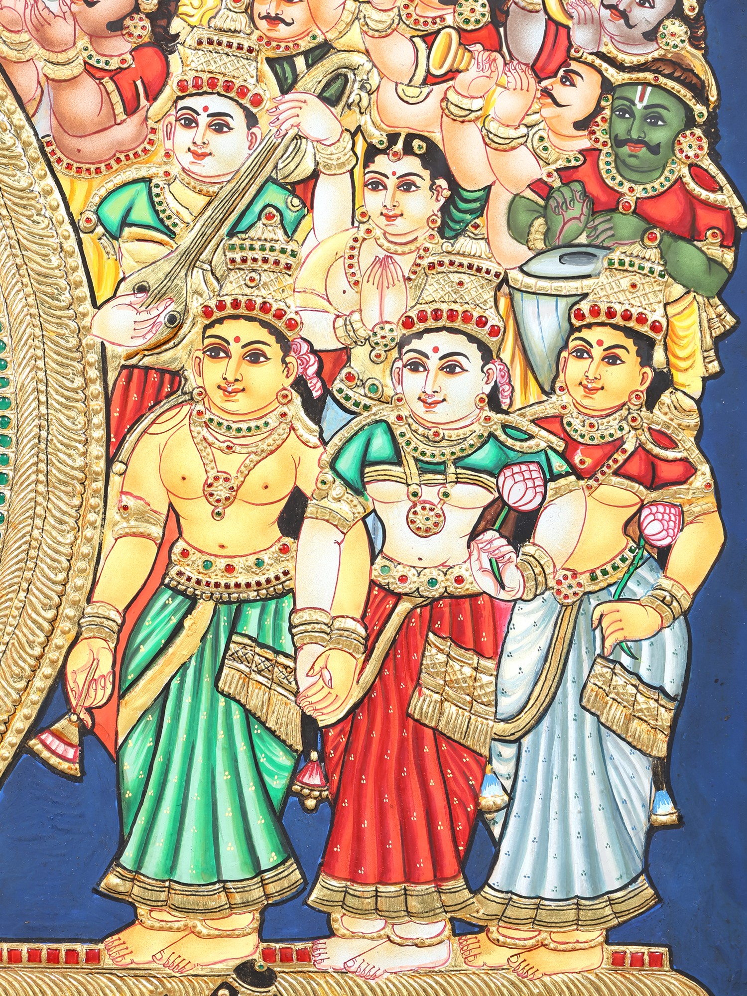Divine Nataraja Darshan: Gods and Goddesses Witnessing Shiva’s Cosmic Dance | Framed Tanjore Painting with 24 Karat Gold Work