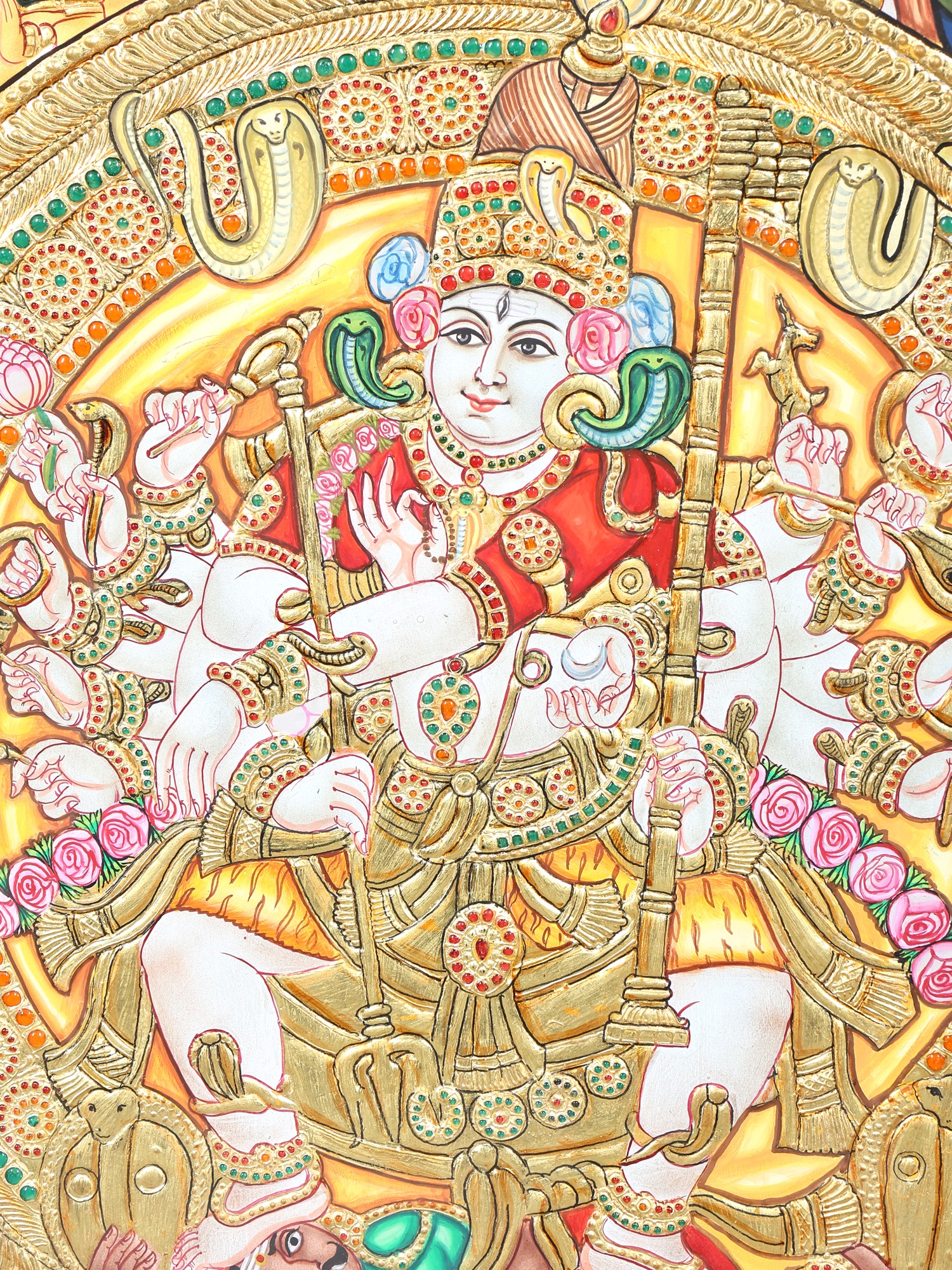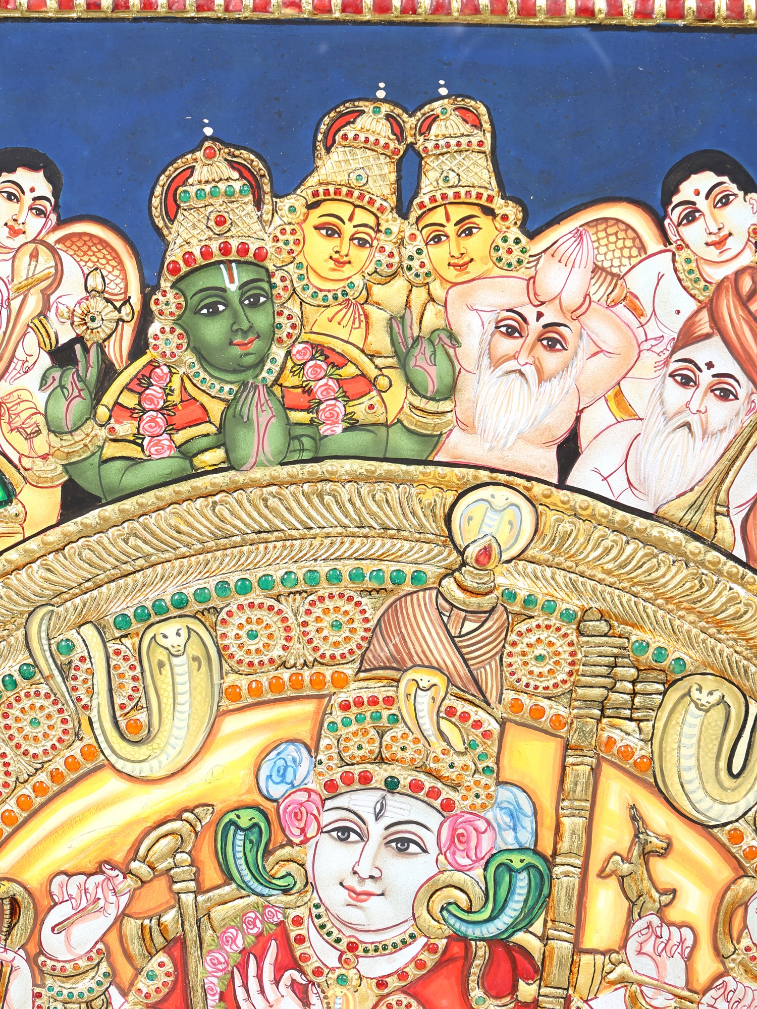 Lakshmi and Narayan Seated on Sheshnag Throne | Traditional Colors with 24 Karat Gold | Embossed Three Dimensional Vintage Tanjore Painting
