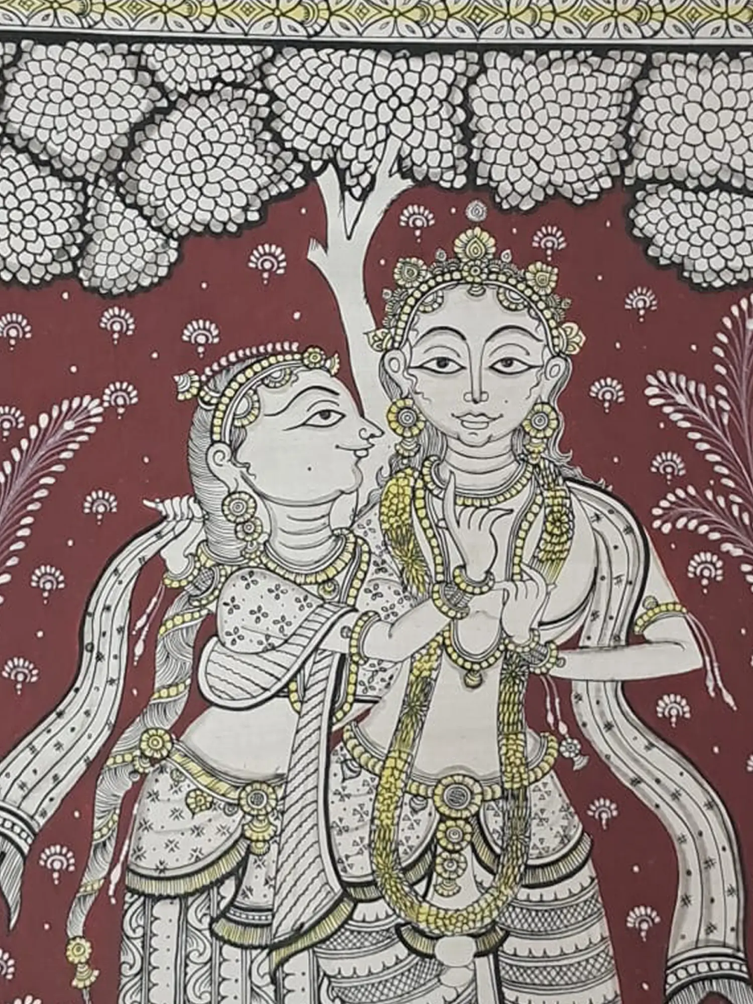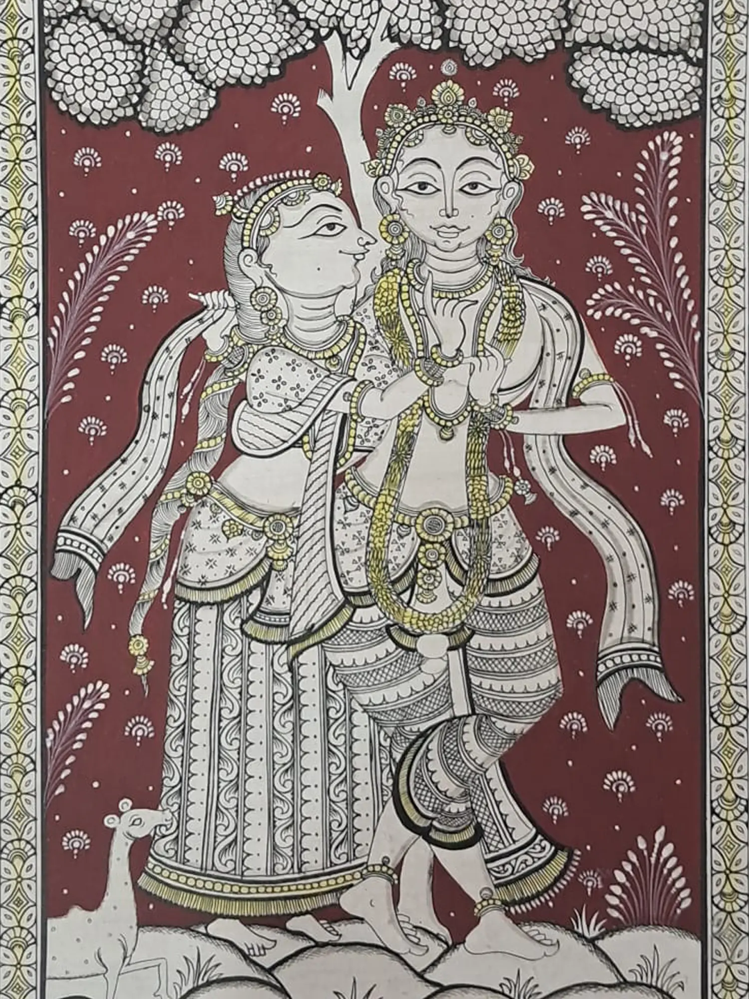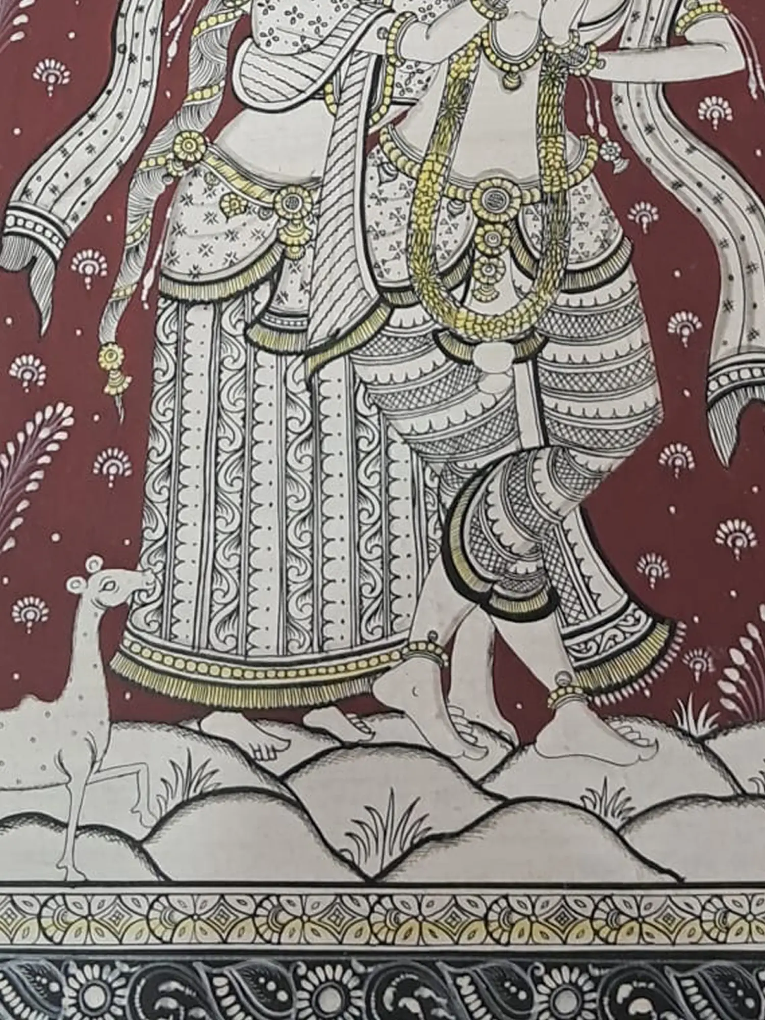 This divine depiction of Radha and Krishna in Odia style, adorned with natural stone colours, captivates with its ethereal beauty and grace. Radha's luminous presence and Krishna's divine charm intertwine in a timeless dance of love and devotion. Each pigment carries the essence of divine bliss, inviting viewers into the sacred realm of Radha-Krishna's eternal romance. The artwork resonates with the sublime poetry of devotion, inspiring hearts with the promise of divine union and spiritual ecstasy.
