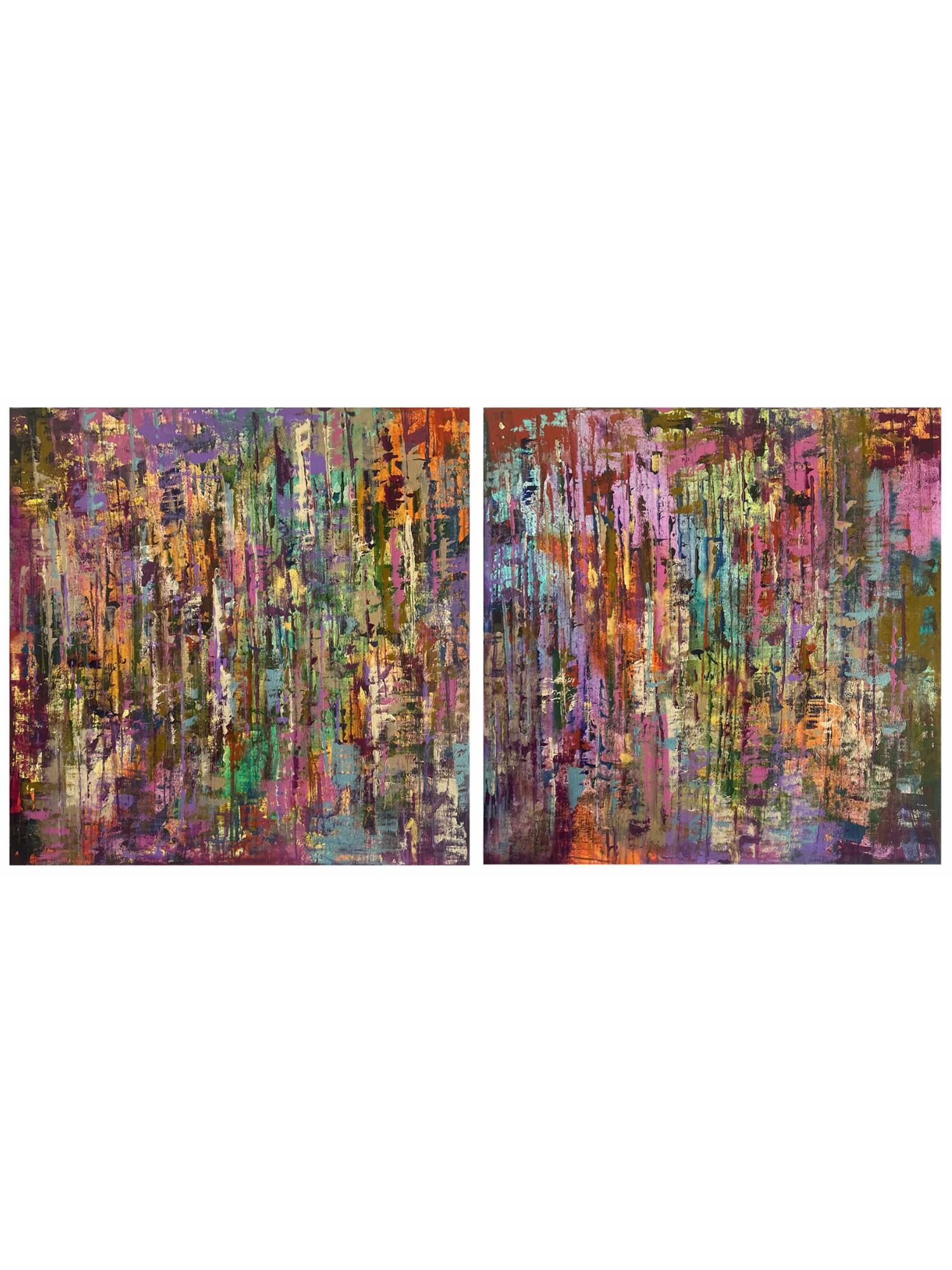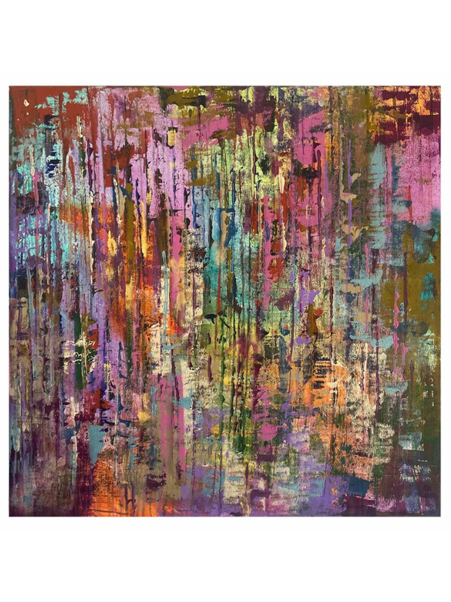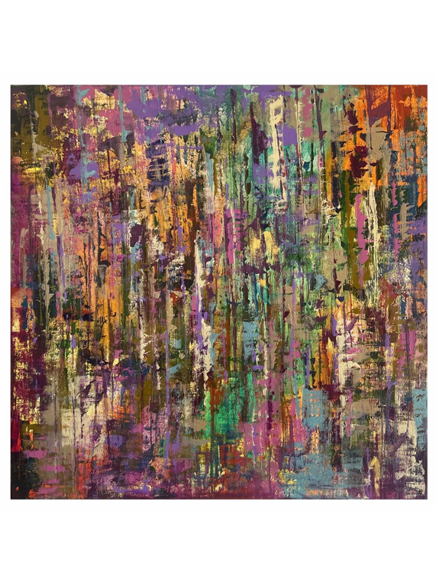 Features a dynamic interplay of vertical brushstrokes in amethyst, emerald, saffron, and crimson.