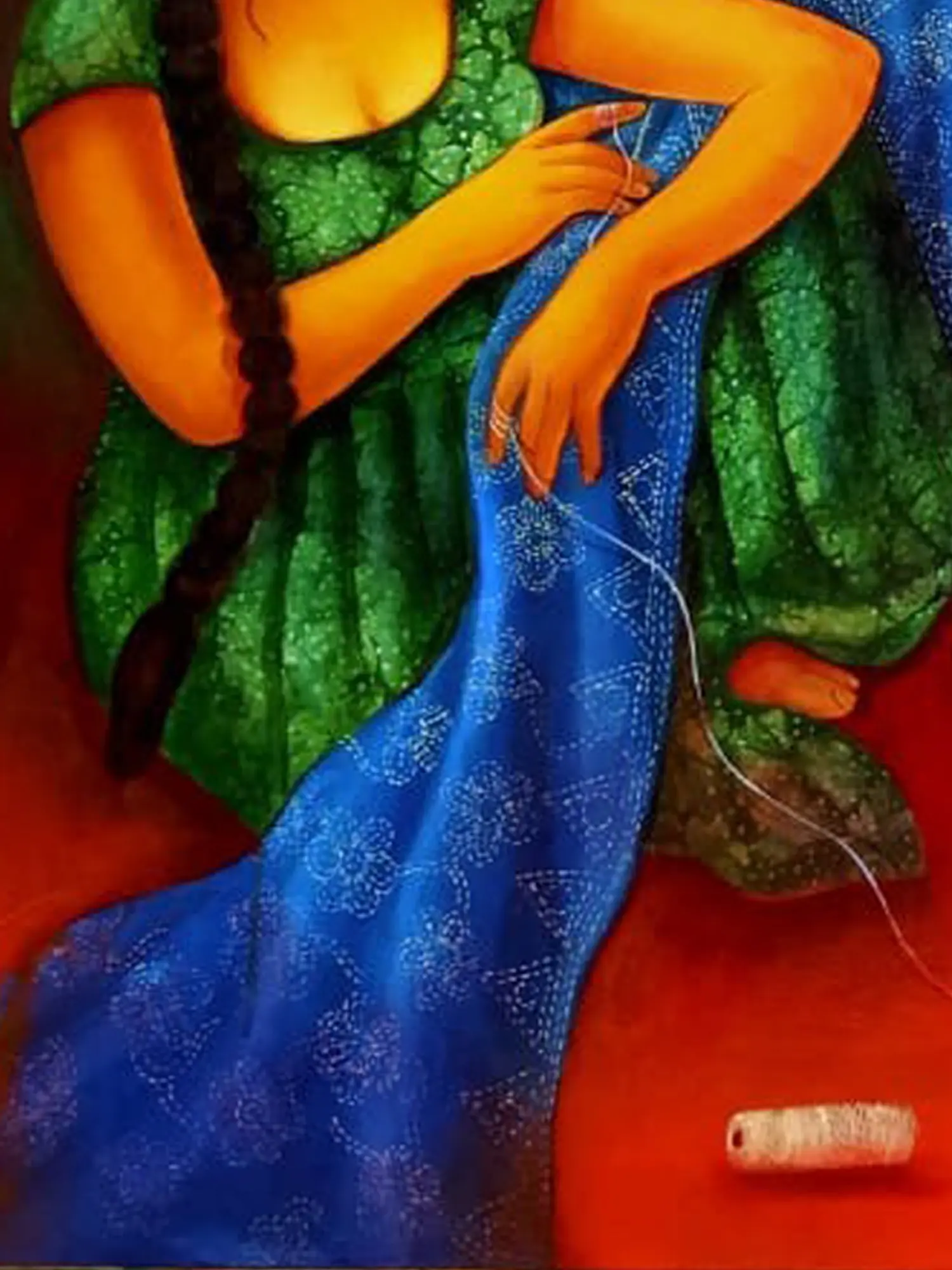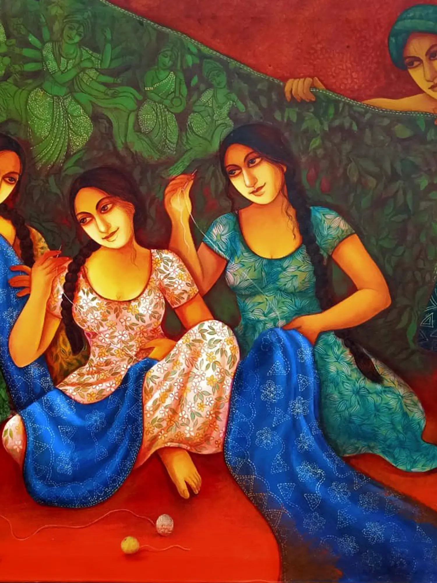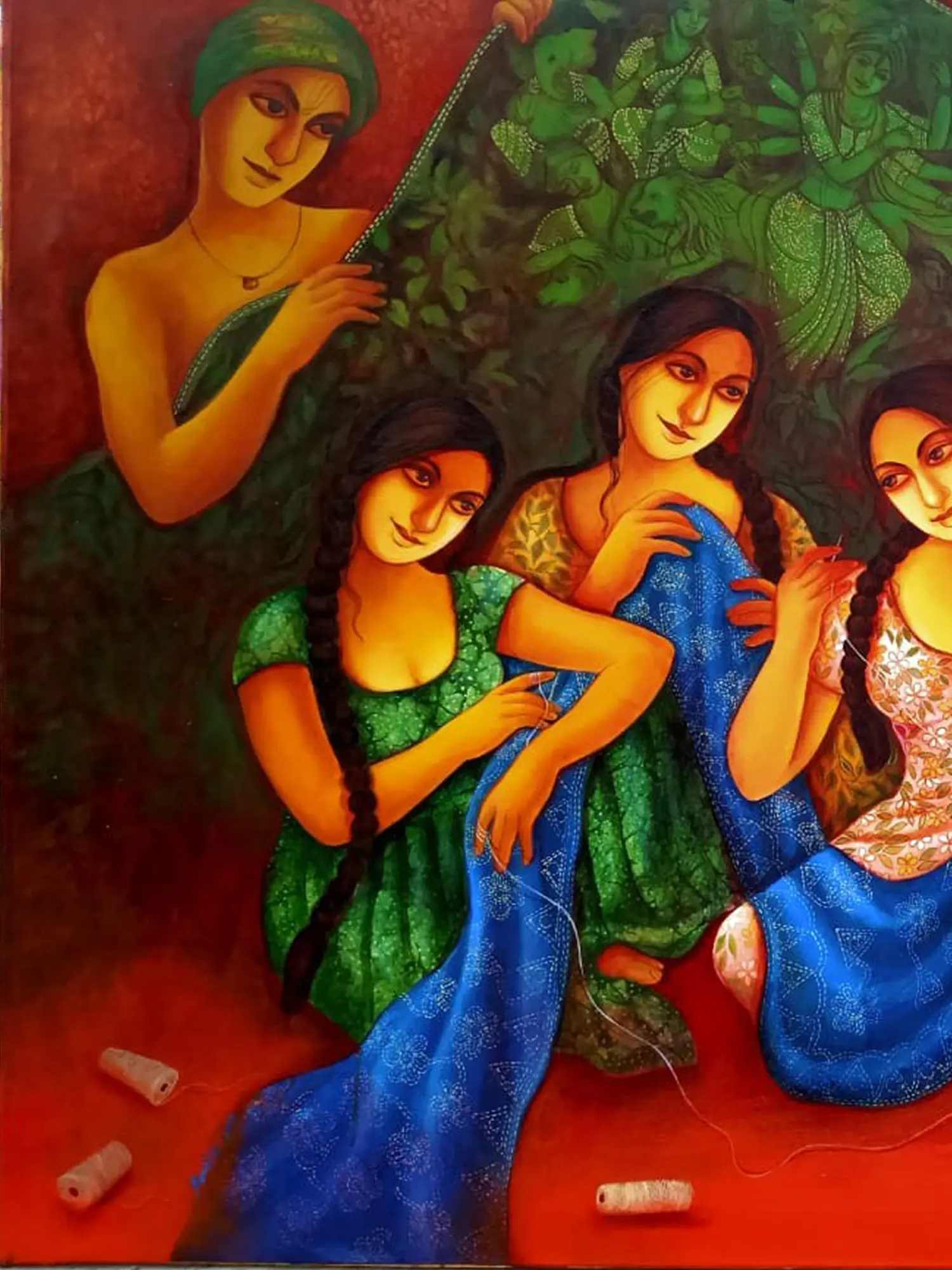 "Dreamy Nights" - Acrylic strokes on canvas unveil a heartwarming scene: a group of women engrossed in sewing. As the moon casts its gentle glow, their needles dance in rhythm, weaving threads that transcend fabric. The painting tells a tale of shared moments, where stitching becomes a symphony of connection. Through each delicate stitch, bonds are woven, and stories are whispered, creating an intricate tapestry of sisterhood. Amidst laughter and tales, the women find solace in each other's company, stitching not just cloth, but also memories and dreams. The canvas imparts a message of togetherness - in each stitch, love, and camaraderie, dreams are sewn, and nights become magical.
