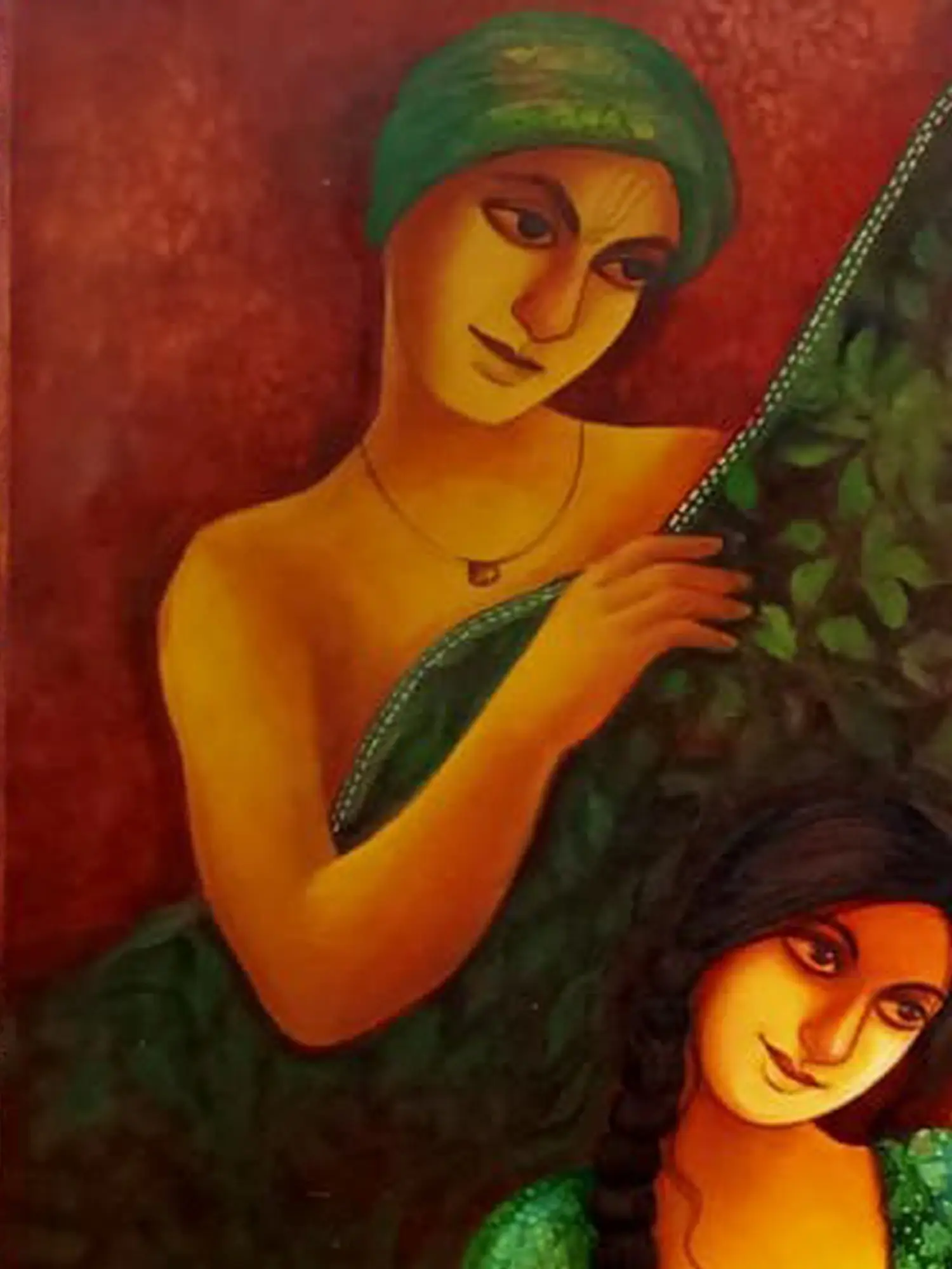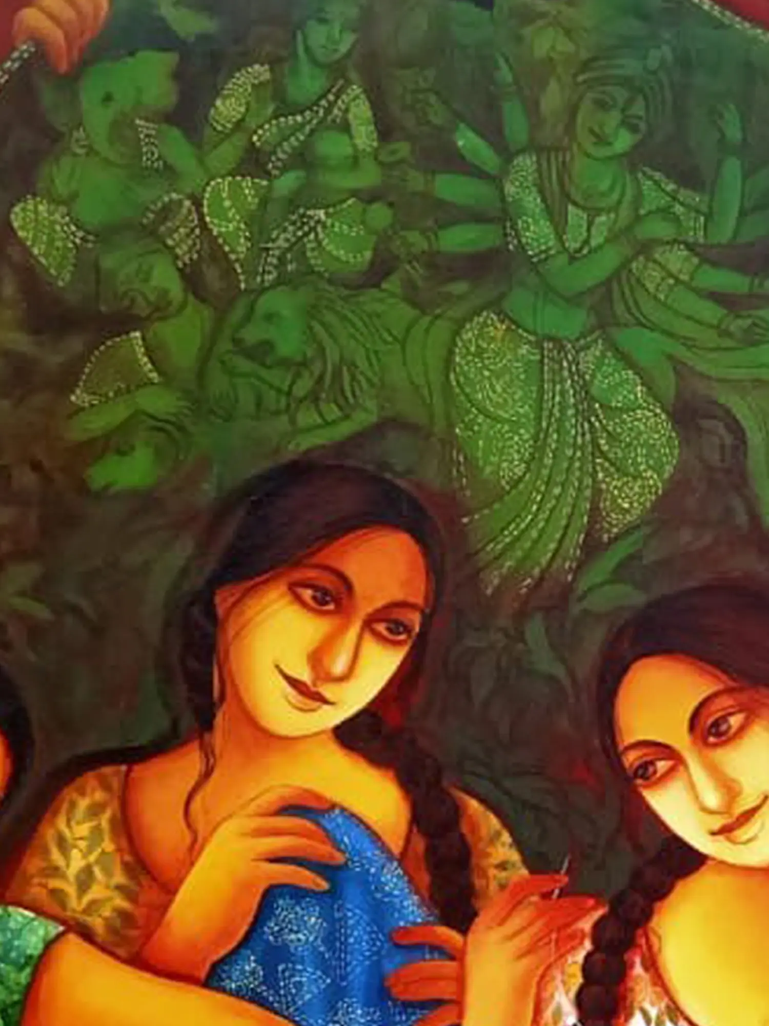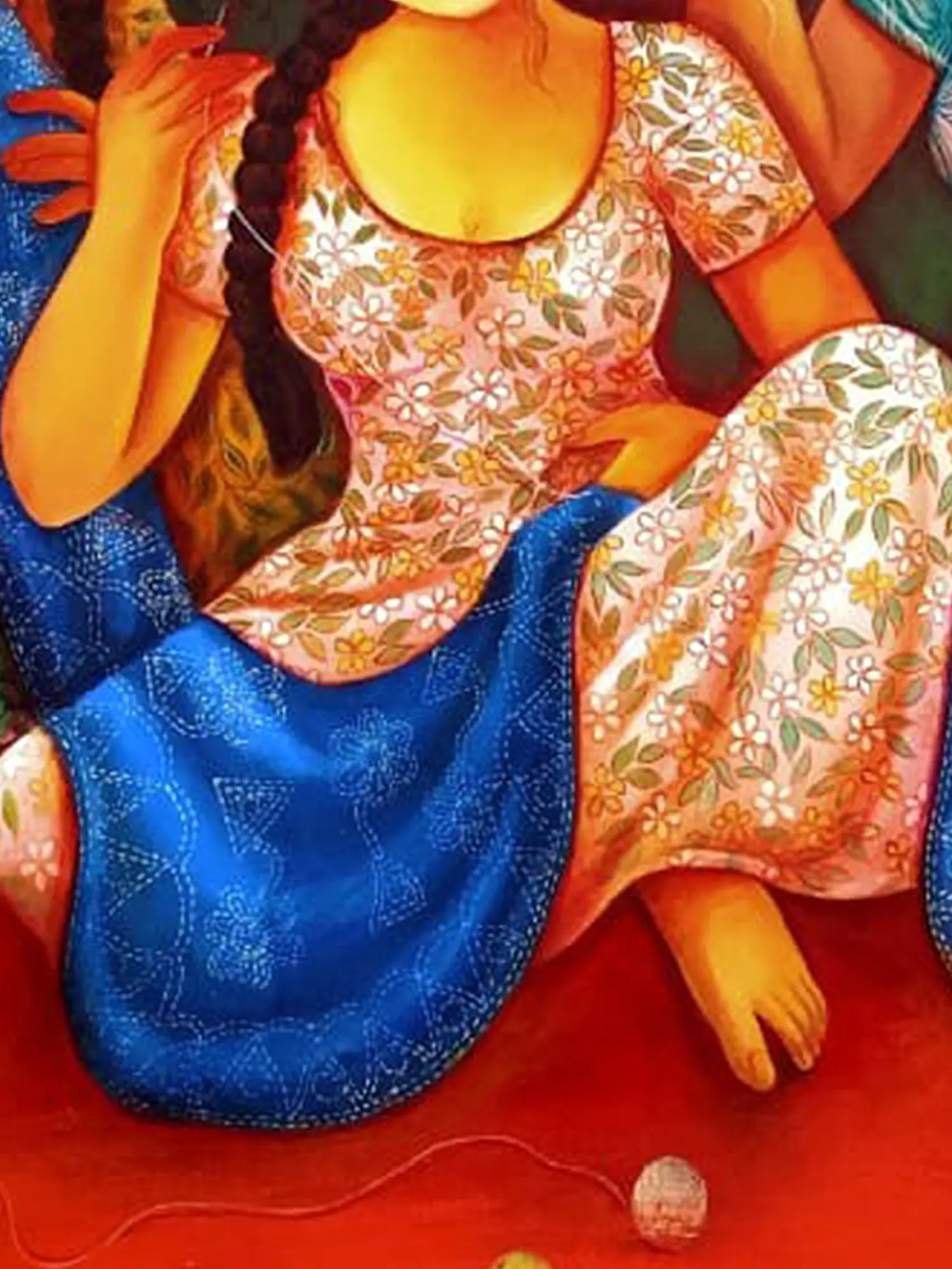 "Dreamy Nights" - Acrylic strokes on canvas unveil a heartwarming scene: a group of women engrossed in sewing. As the moon casts its gentle glow, their needles dance in rhythm, weaving threads that transcend fabric. The painting tells a tale of shared moments, where stitching becomes a symphony of connection. Through each delicate stitch, bonds are woven, and stories are whispered, creating an intricate tapestry of sisterhood. Amidst laughter and tales, the women find solace in each other's company, stitching not just cloth, but also memories and dreams. The canvas imparts a message of togetherness - in each stitch, love, and camaraderie, dreams are sewn, and nights become magical.