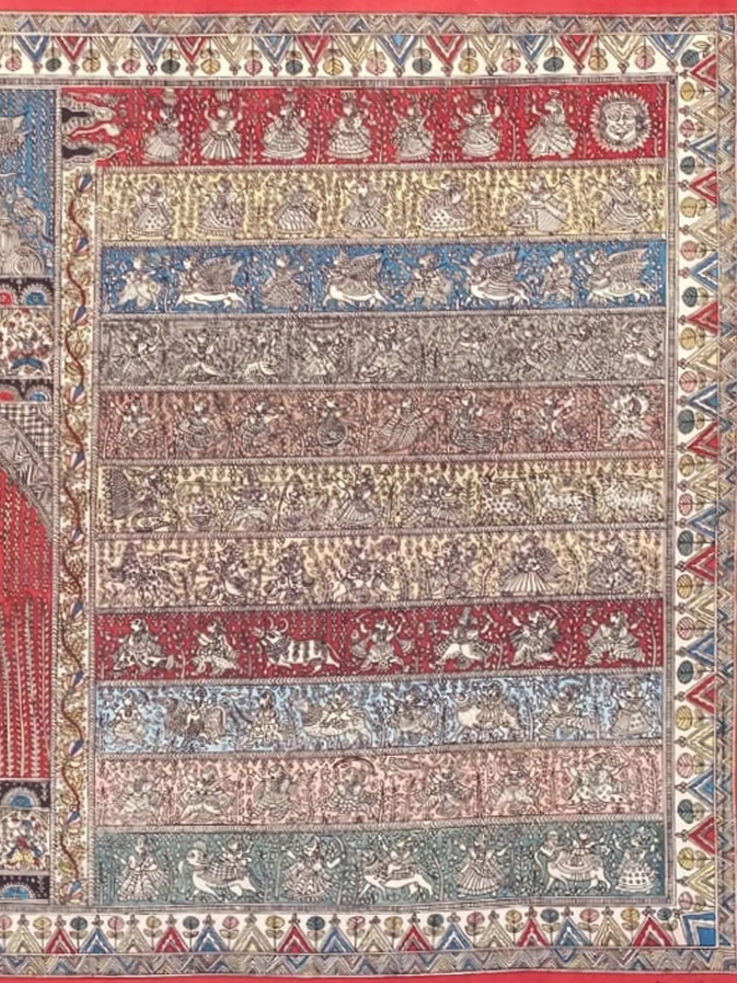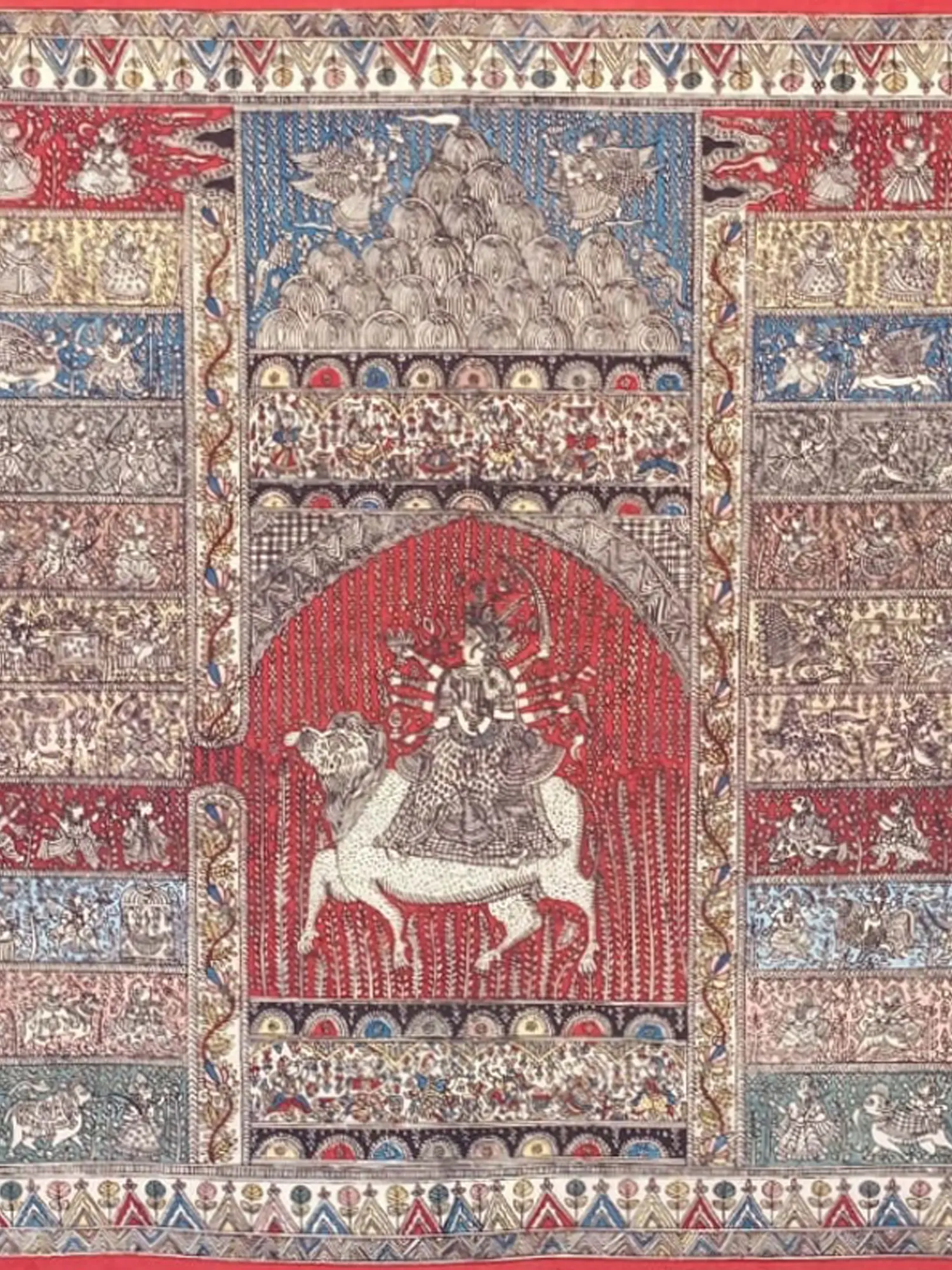 Spanning a generous 26 inches in height and 48 inches in width, this artwork commands attention through its scale and intricate detail. The central motif, depicting the formidable Durga, is rendered with striking clarity, surrounded by meticulously illustrated vignettes that expand the narrative. You will find yourself drawn into the countless figures and scenes, each telling a part of a larger epic. The vibrant border frames the composition, enhancing its dramatic presence.