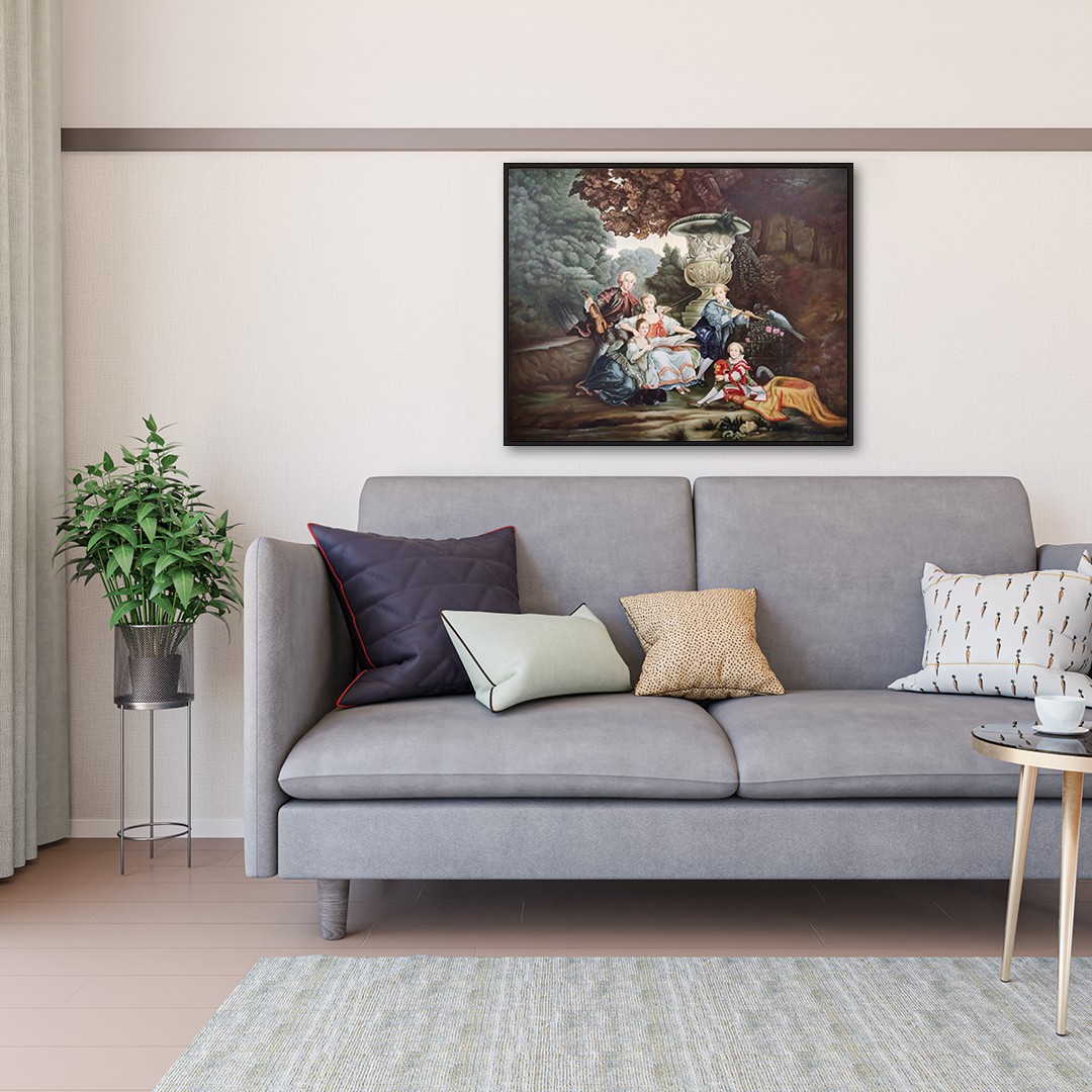 The idyllic setting of the painting evokes the classical gardens of antiquity, reminiscent of the paradisiacal landscapes often depicted in Greek and Roman mythology. The ornate urn at the center, adorned with cherubic figures, serves as a focal point, hinting at themes of abundance, prosperity, and the enduring power of family. This motif is consistent with classical depictions of family life, where the strength of the family unit was considered fundamental to societal stability. The inclusion of a parrot, a creature often associated with wisdom and communication in various cultures, further enhances the symbolic richness of the composition. The painting acts as a visual poem on the beauty of family unity and the artistic expression of the time.