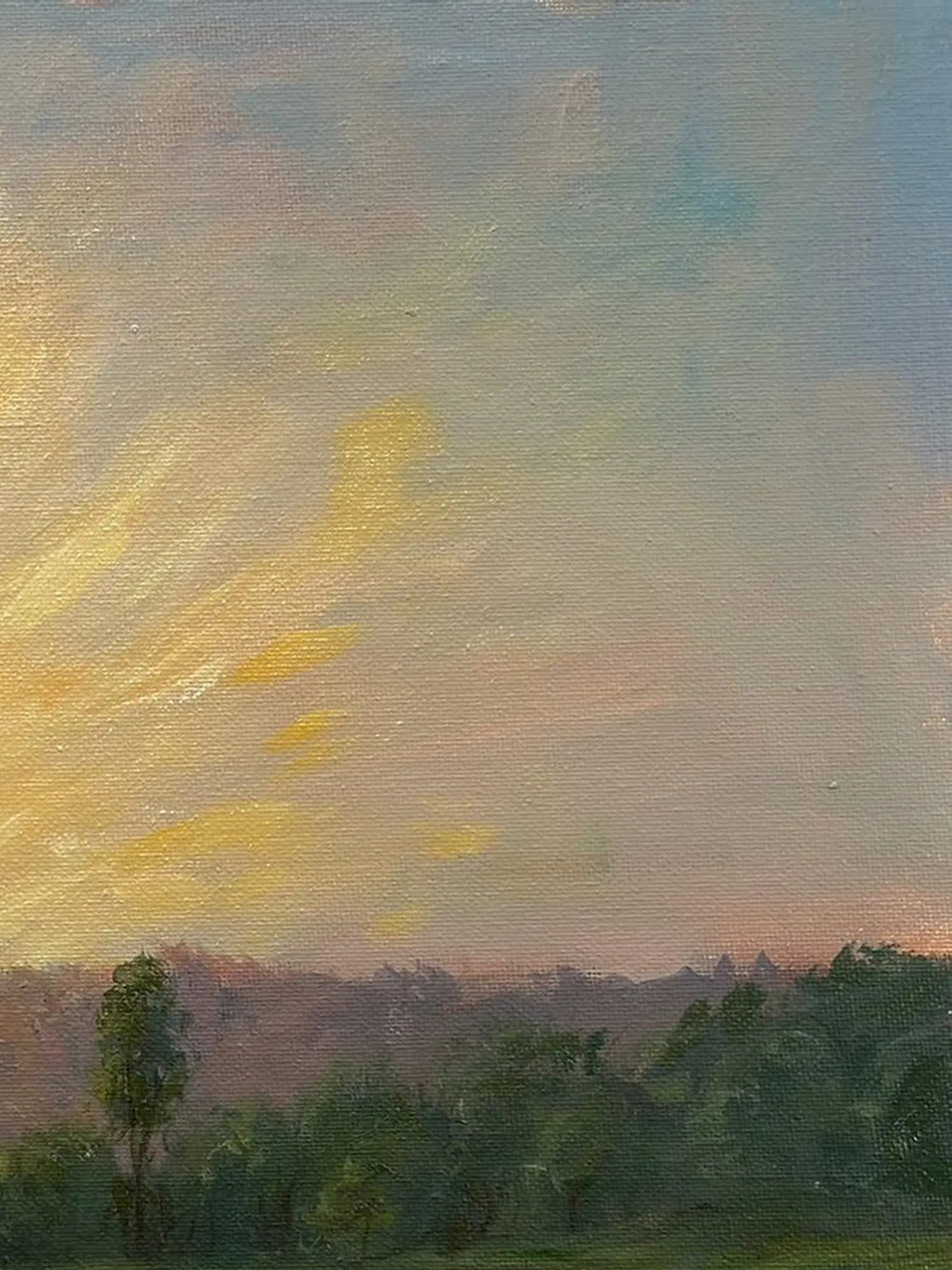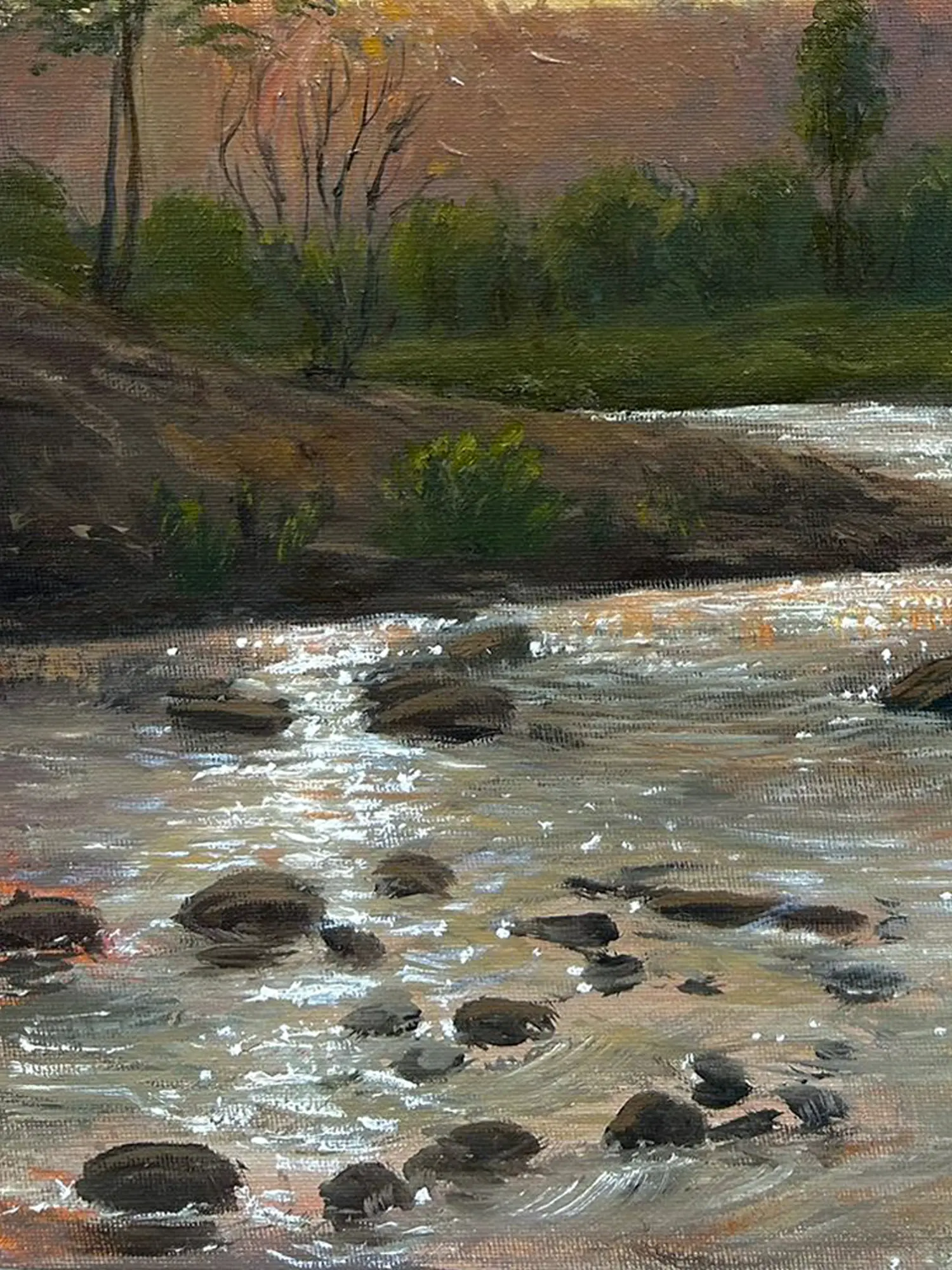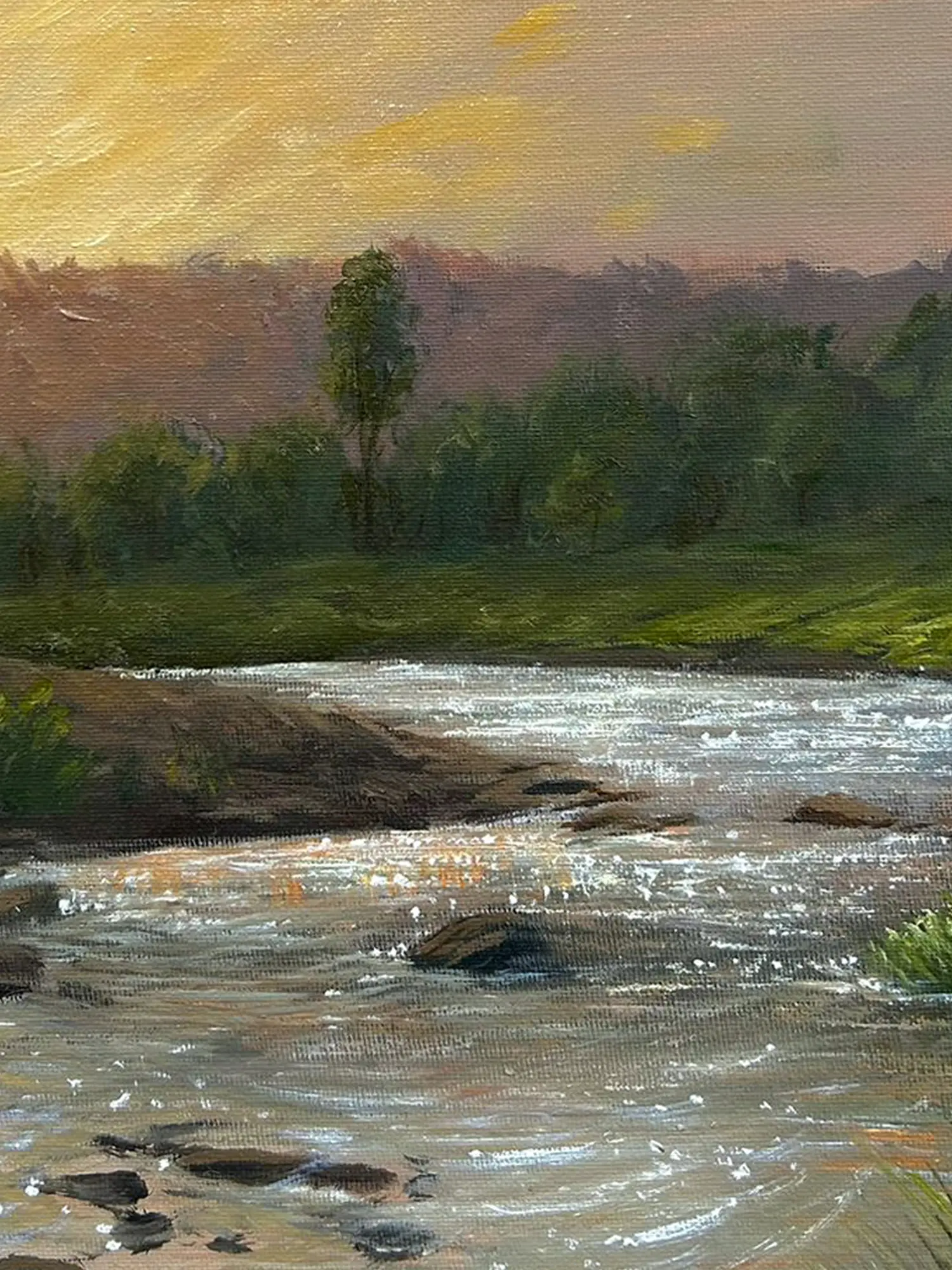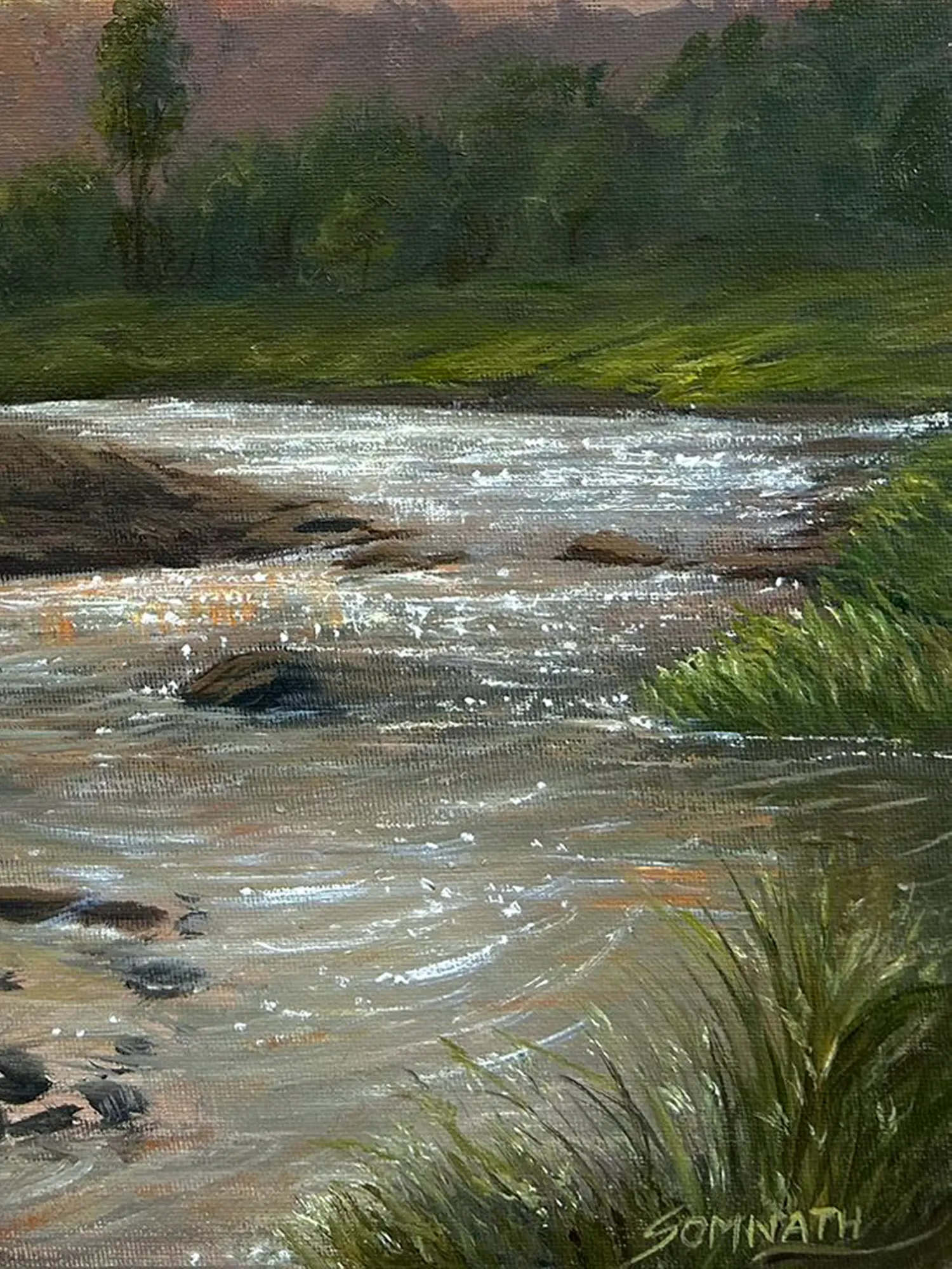 Somnath Harne's Evening View on the River, an oil painting, transforms the canvas into a serene panorama of twilight magic. The artist's skilled brushstrokes conjure the tranquil beauty of a river at dusk. A palette of soft, muted tones captures the gentle transition from daylight to the hushed hues of the evening. Reflections dance on the water's surface, mirroring the sky's enchanting transformation. Harne's meticulous attention to detail, particularly in the play of light, infuses the scene with a serene ambiance. "Evening View on the River" becomes a lyrical ode to the sublime moments where nature's quiet majesty unfolds along the tranquil banks of the river.