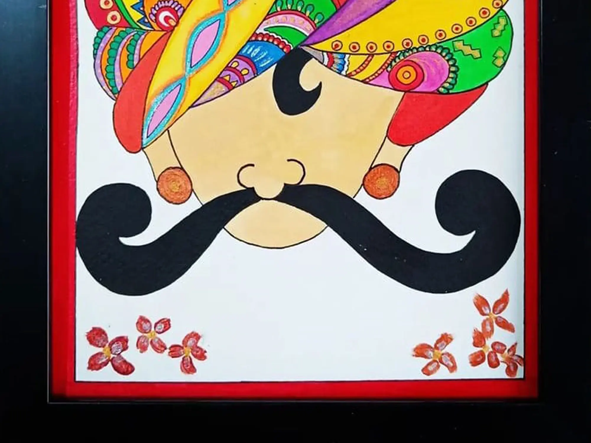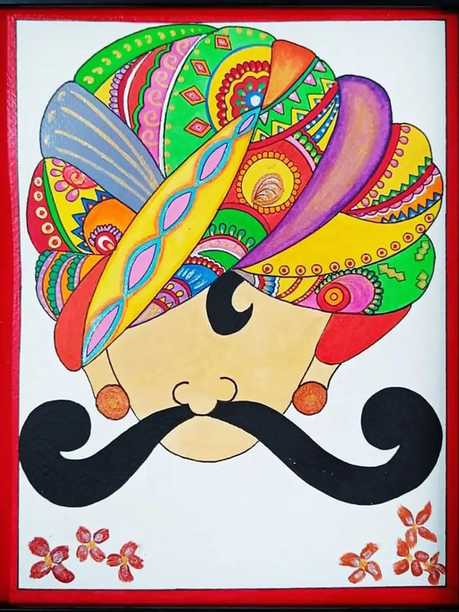 The composition, painted with meticulous detail, showcases a visage adorned with a distinguished mustache and turban, embodying cultural richness. The turban is colorful and brings forth the colorful culture of Rajasthan. The frame encapsulates this distinctive portrayal, turning it into a timeless piece. Anshu Tripathi's work not only preserves the aesthetics of facial adornment but also becomes a visual narrative that celebrates the nuanced elegance of cultural diversity.