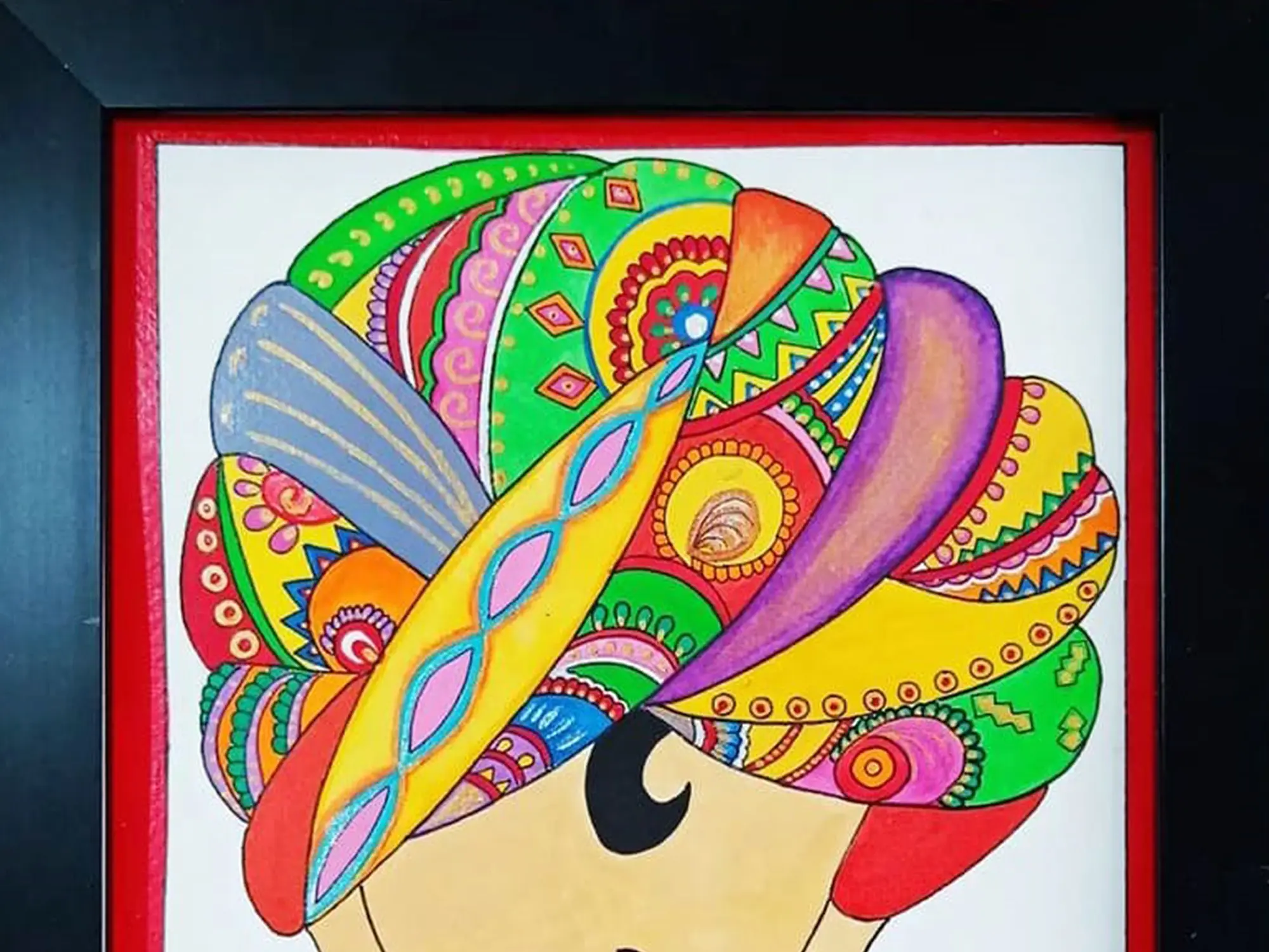 If there is one object that instantly brings to mind Rajasthan, it is the 'Rajasthani Pagri'. It goes under several names, including 'Rajasthani Safa', 'Paaga', and 'Marwari Pagri'. A person wearing the safa and wearing goggles has become synonymous with a chic style that mixes tradition and glamour. This "Face Painting with Mustache and Turban," presented on paper and framed, is a cultural tableau that merges tradition with artistic flair and is done by Anshu Tripathi.