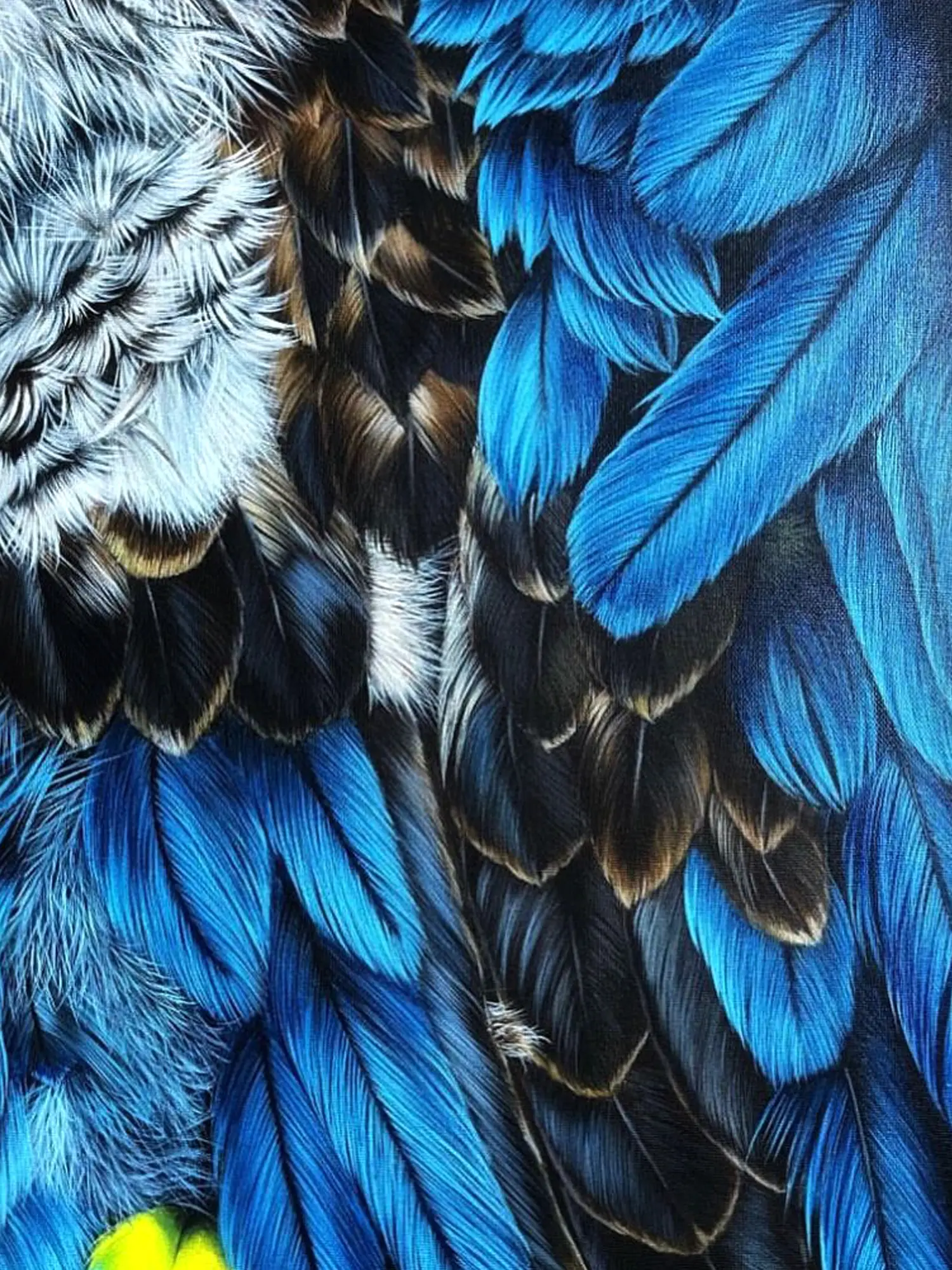 The composition, measuring 16 by 12 inches, presents an intimate view of overlapping feathers. You’ll appreciate the subtle gradations of color within each quill, the sharp definition of their edges, and the soft, ethereal quality of the downy underlayers. The interplay of brilliant blues, earthy browns, stark whites, and a surprising flash of yellow creates a dynamic visual experience that draws the eye across the canvas.