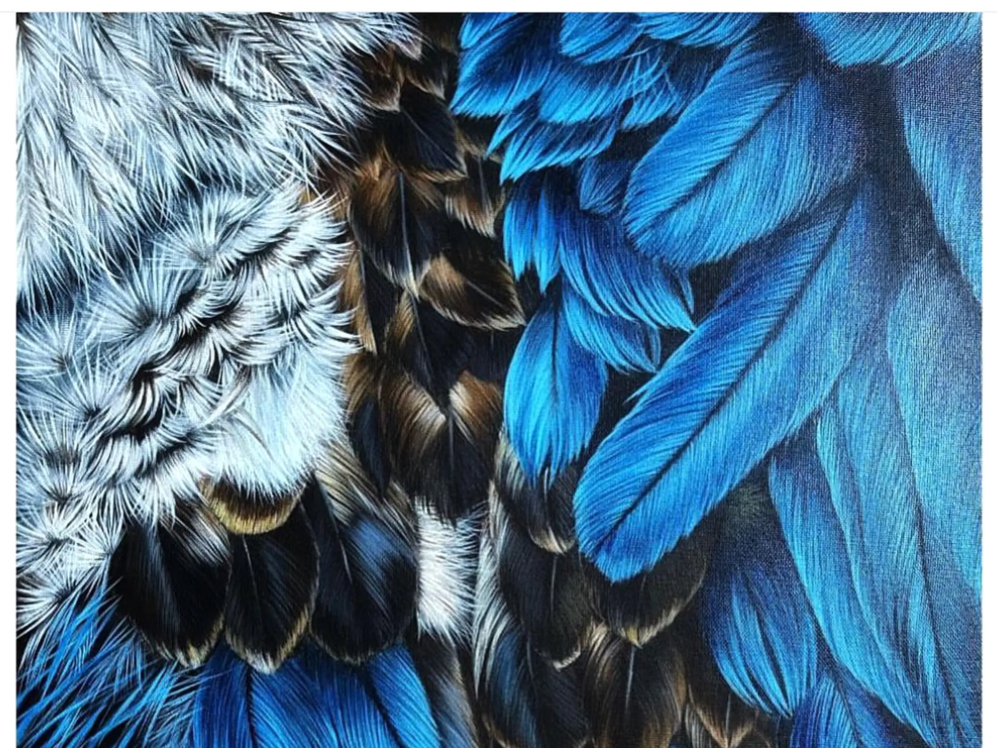 Created with meticulous attention on premium linen canvas, this piece is rendered in rich acrylics. Each stroke is a testament to the artist’s dedication to capturing the lifelike essence of feathers, from the delicate down of an owl to the vibrant plumage of a parrot and the powerful presence of an eagle. The layered application of paint ensures depth and luminosity, bringing the subject to life with an almost tactile quality.