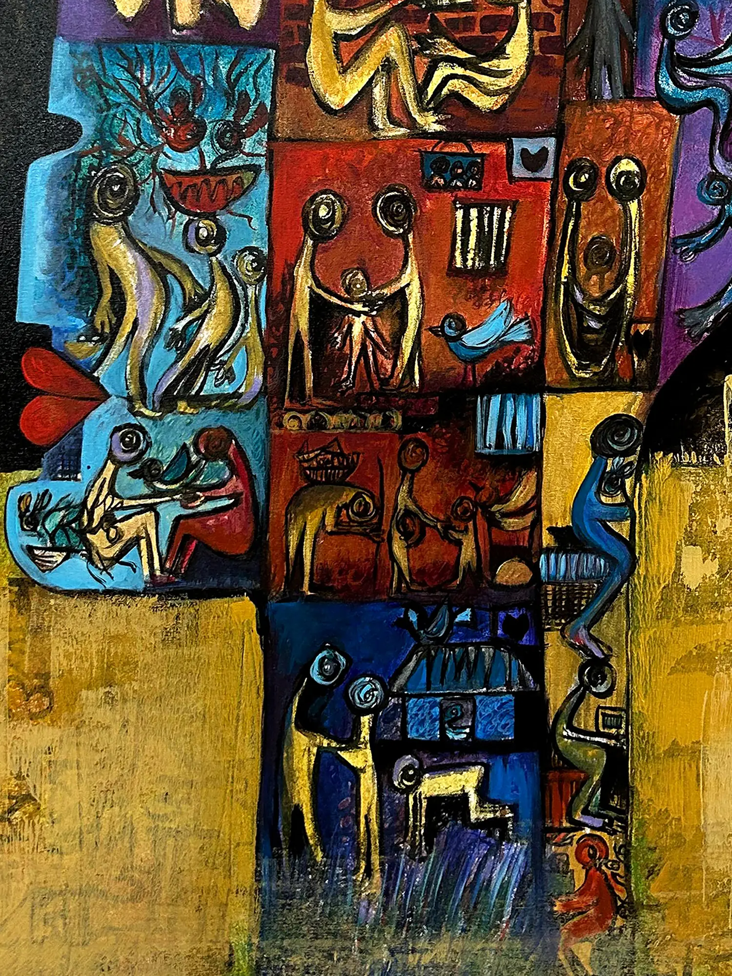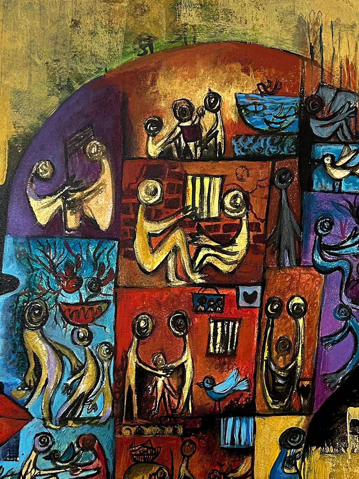 Features a rich tapestry of motifs reminiscent of folk art and ancient storytelling, integrated into a modern abstract framework.