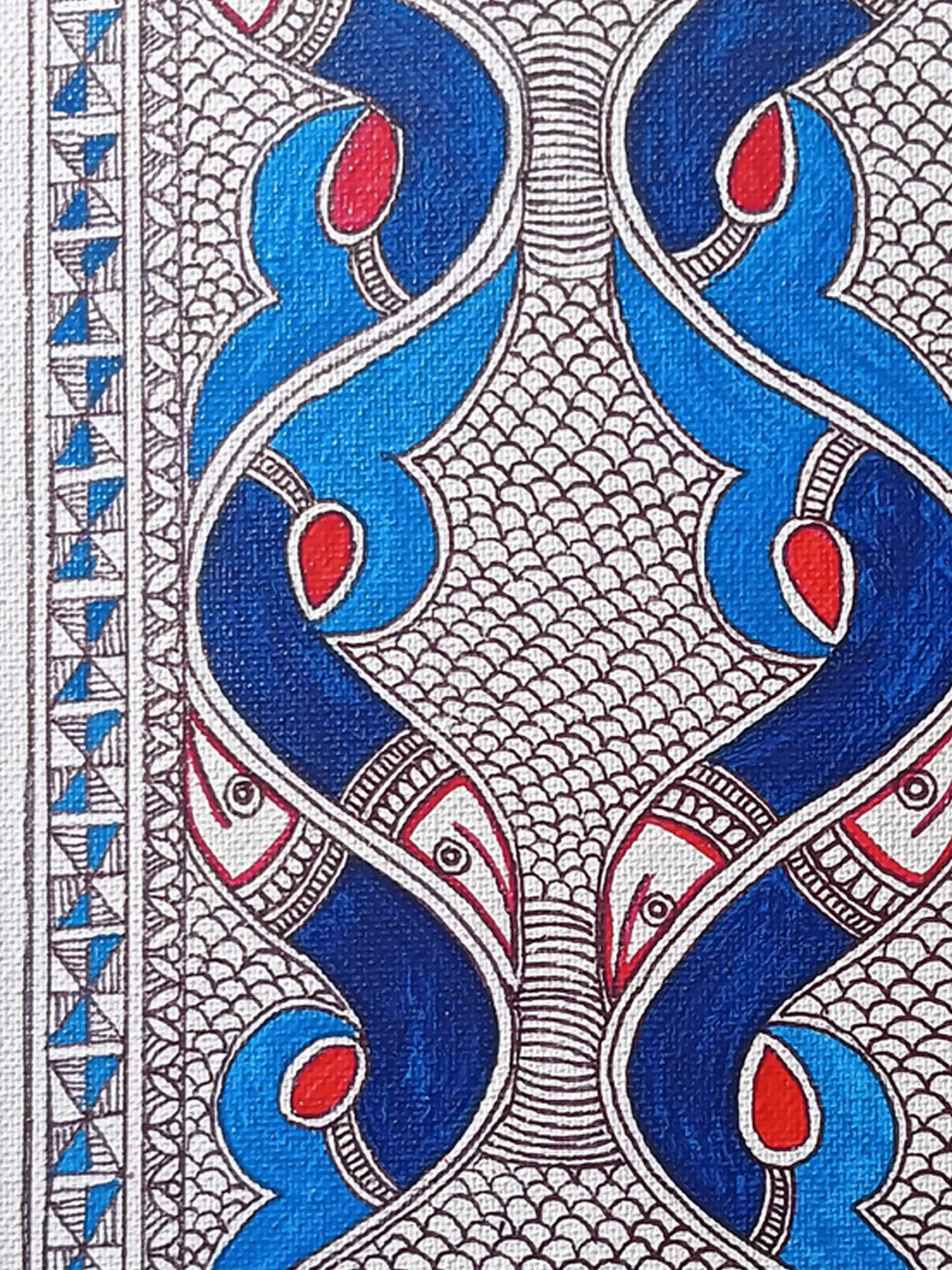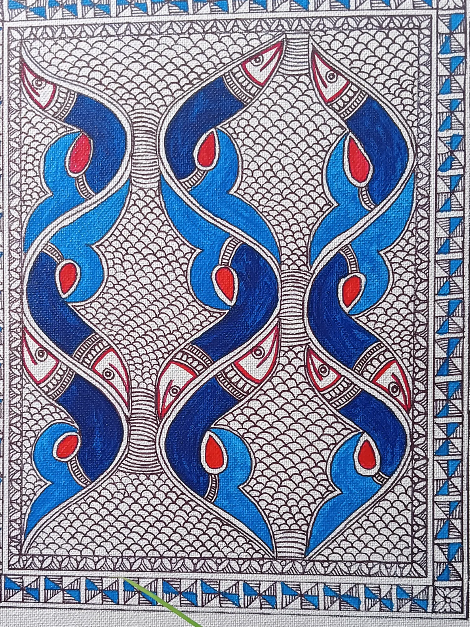 Rina Patwa's "Fish Harmony" on Acrylic and Canvas showcases exquisite Madhubani style, portraying fish with stylish patterns. The use of soothing blue and dark blue tones creates a serene aquatic ambiance. The fishes, elegantly coiled like snakes, convey a sense of fluidity and movement.