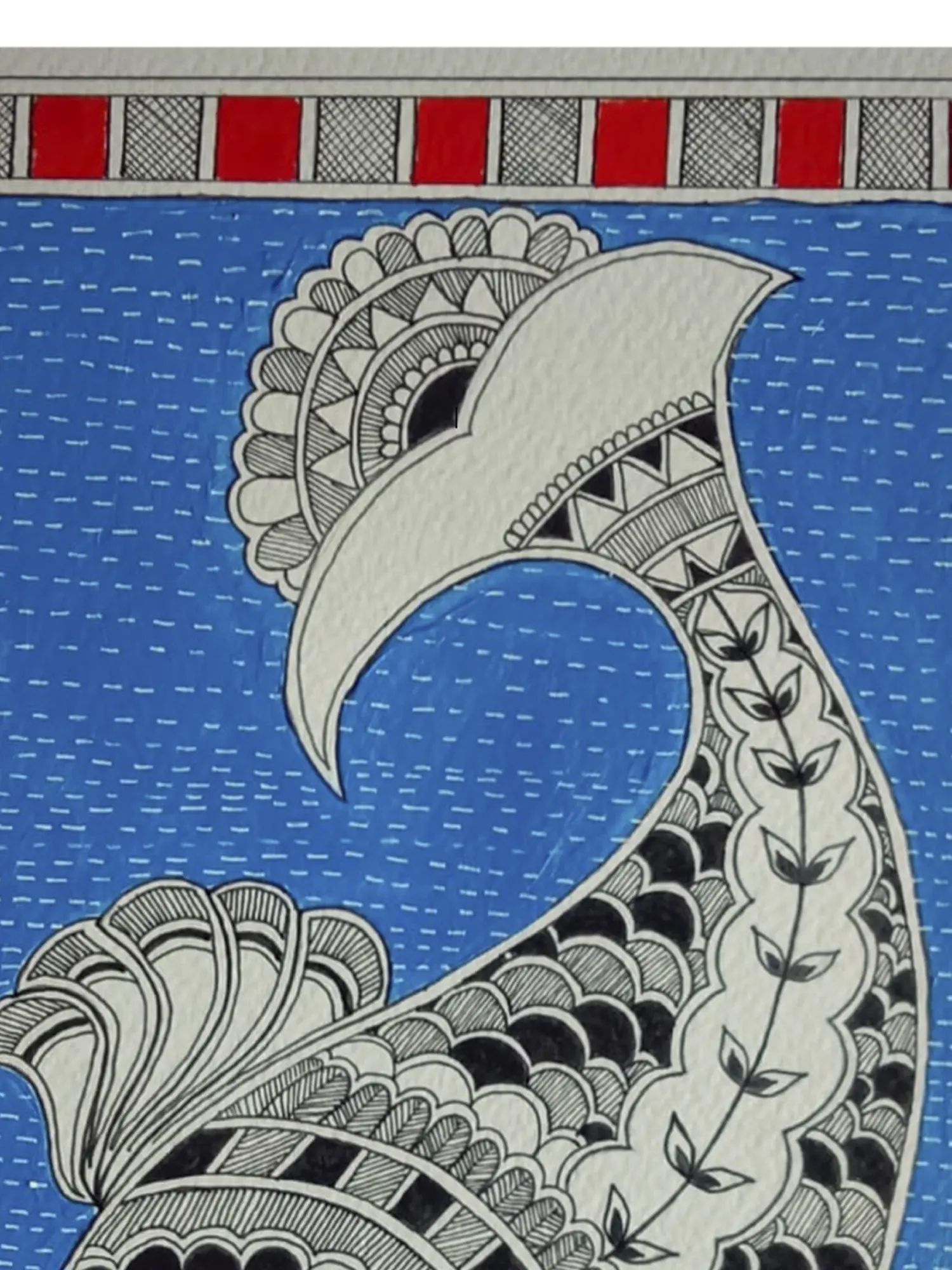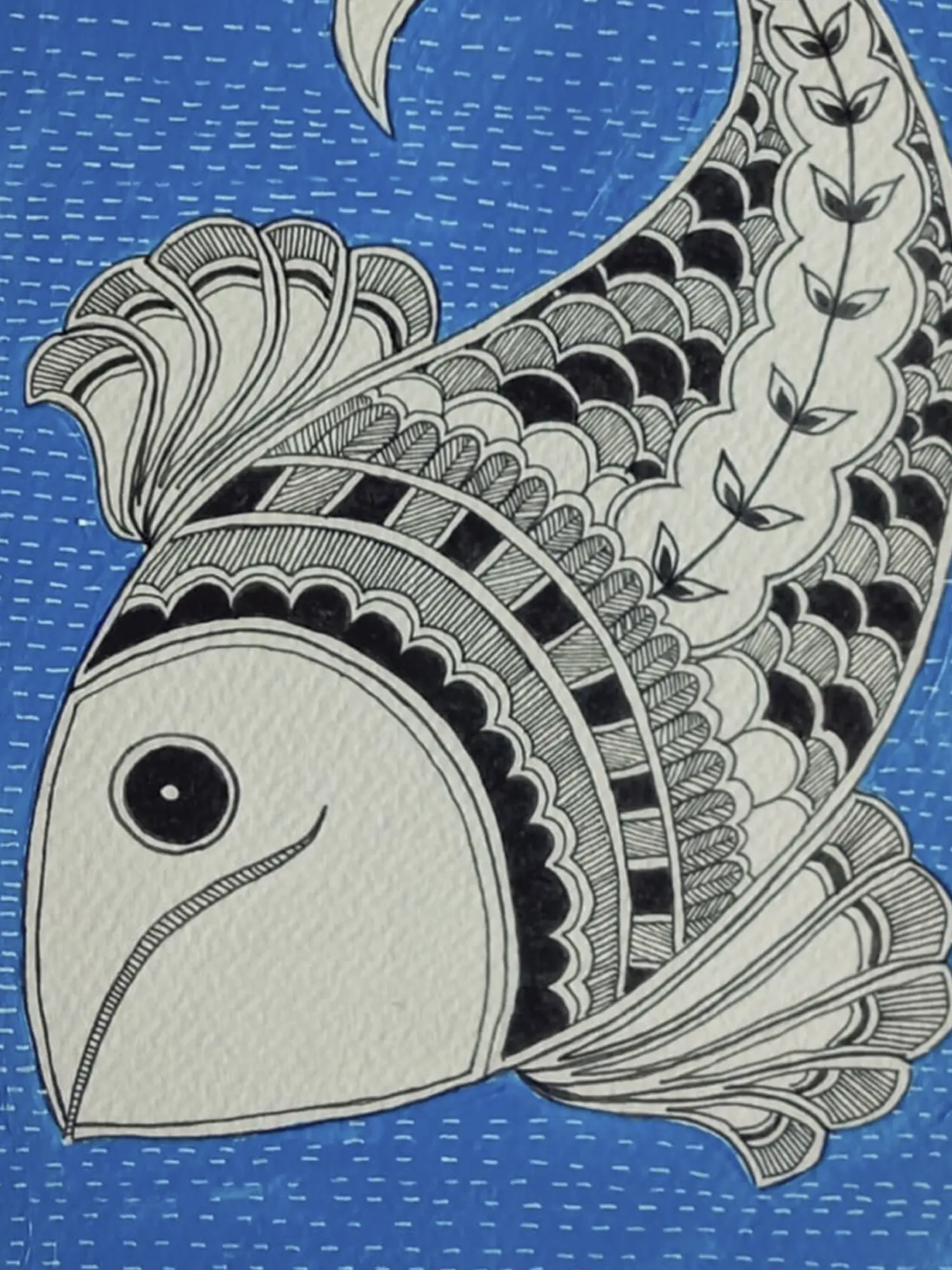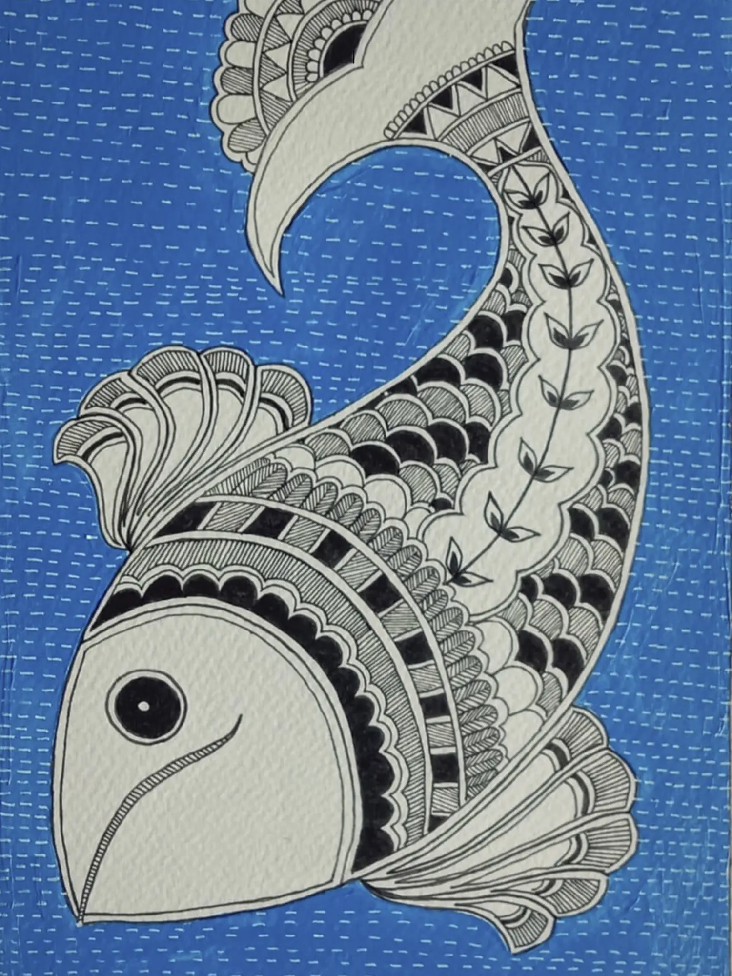 In Madhubani paintings, fish are used to symbolize fertility and prosperity. They represent riches and abundance. This Madhubani style painting titled, Floating Fish is a Watercolor on Canvas Sheet by Krishna Joshi and also a representation of the same traditional values associated with the image of the fish. Here in this painting, one big fish captures the maximum space of the painting surrounded by the blue waters.