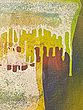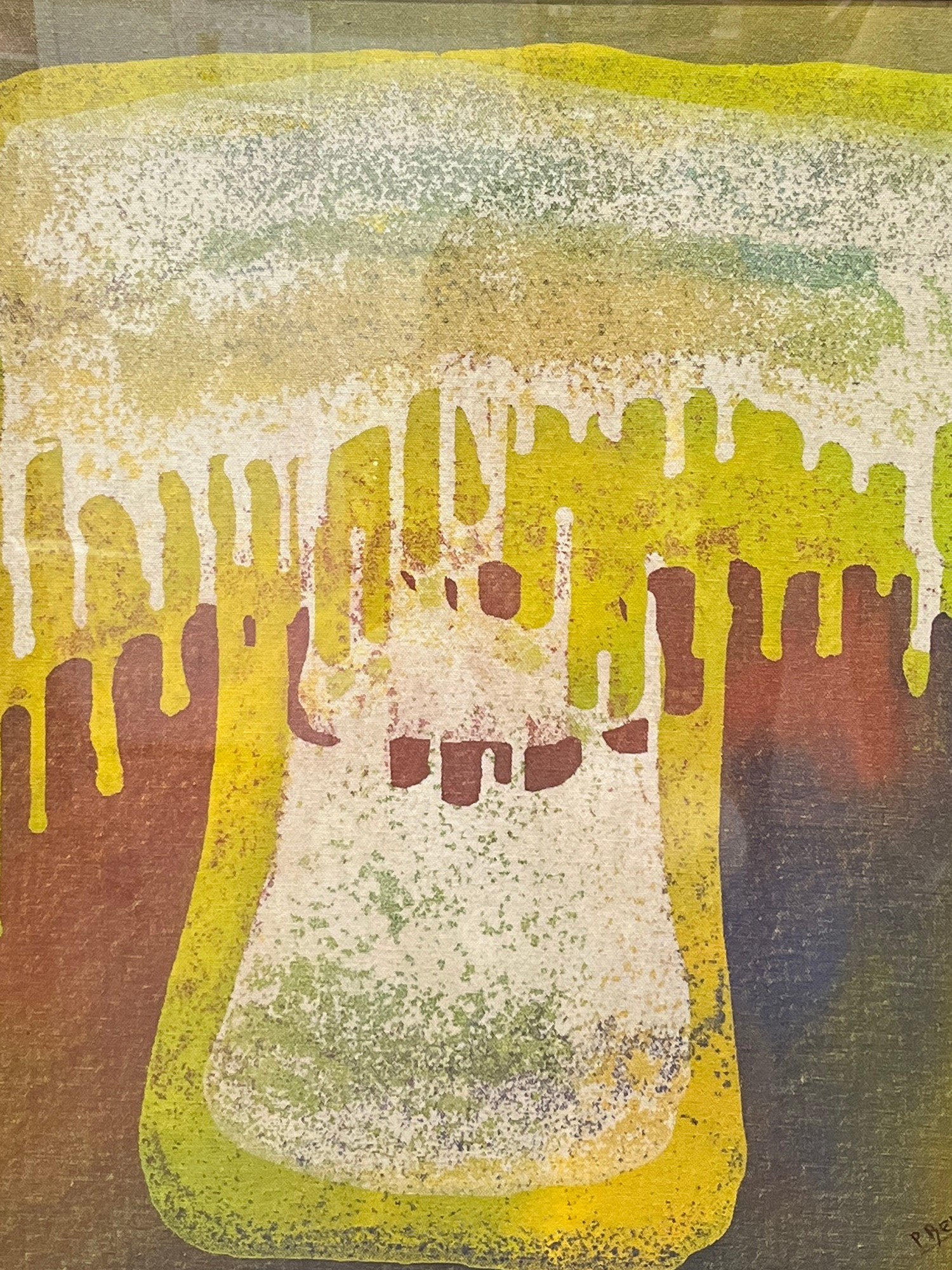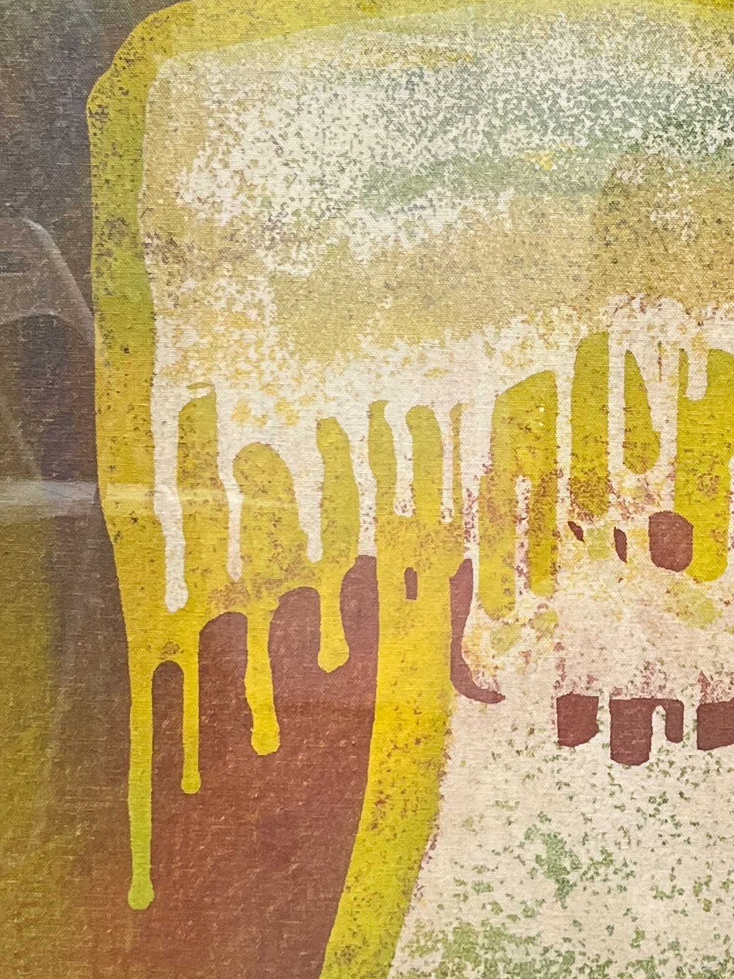 The composition is anchored by a central form defined by a bold, bright yellow outline, against which layers of white, green, and muted earthy tones coalesce. The dramatic descent of yellow streaks mimics liquid in motion, creating a compelling visual rhythm. Measuring twenty-four inches in height and twenty-four inches in width, its square format provides a balanced yet dynamic presence, ideal for showcasing its abstract narrative.