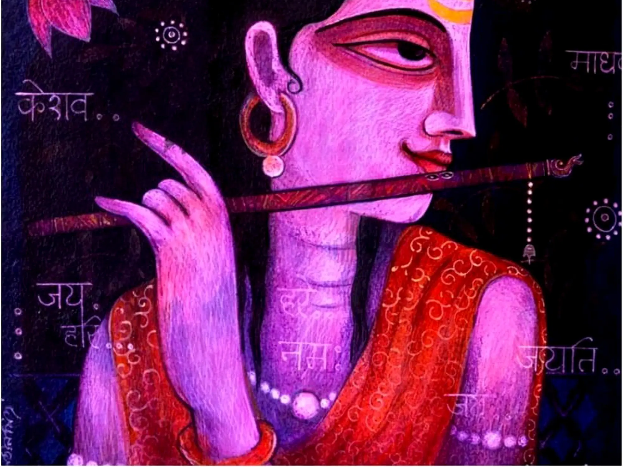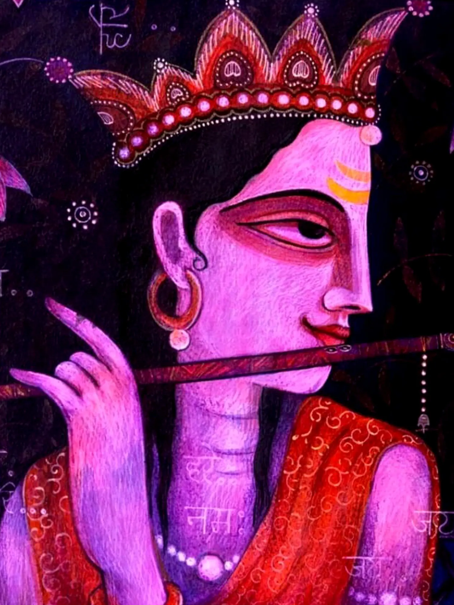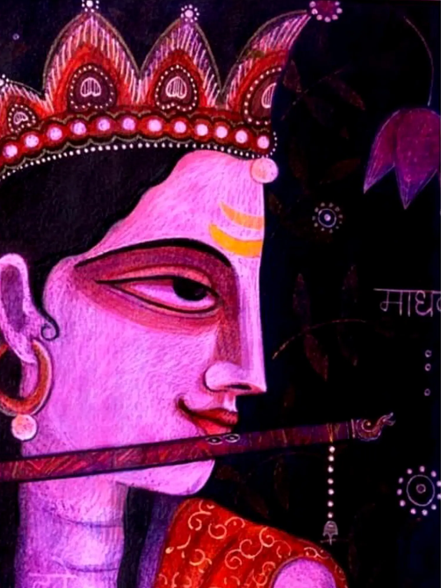 The painting of Fluting Krishna harmonises the distinctive styles of Kishangarh and Bangla art, capturing the divine charm and celestial grace of Lord Krishna as the divine flautist - the artwork evokes the timeless allure of Krishna's melodious flute and enchanting presence. Krishna's divine form radiates with ineffable beauty and spiritual resonance. Through its fusion of artistic styles and cultural motifs, the painting celebrates the universal appeal and enduring legacy of Krishna's divine leelas.