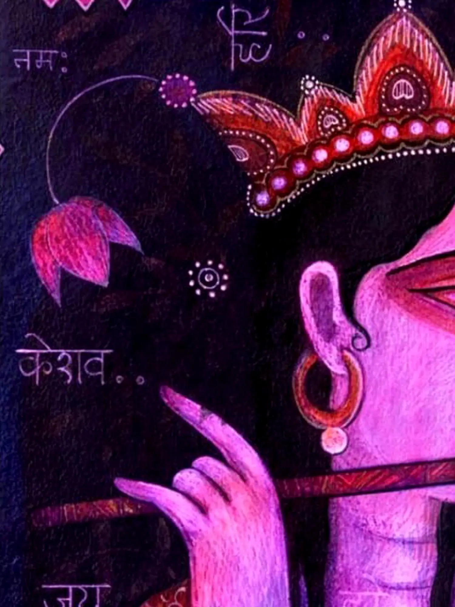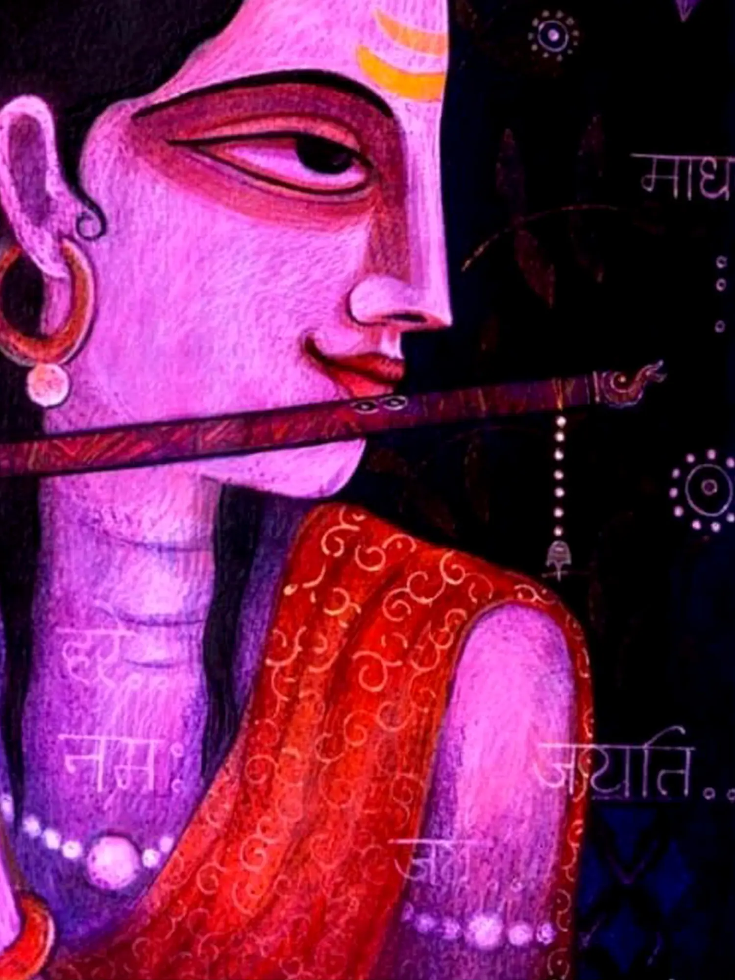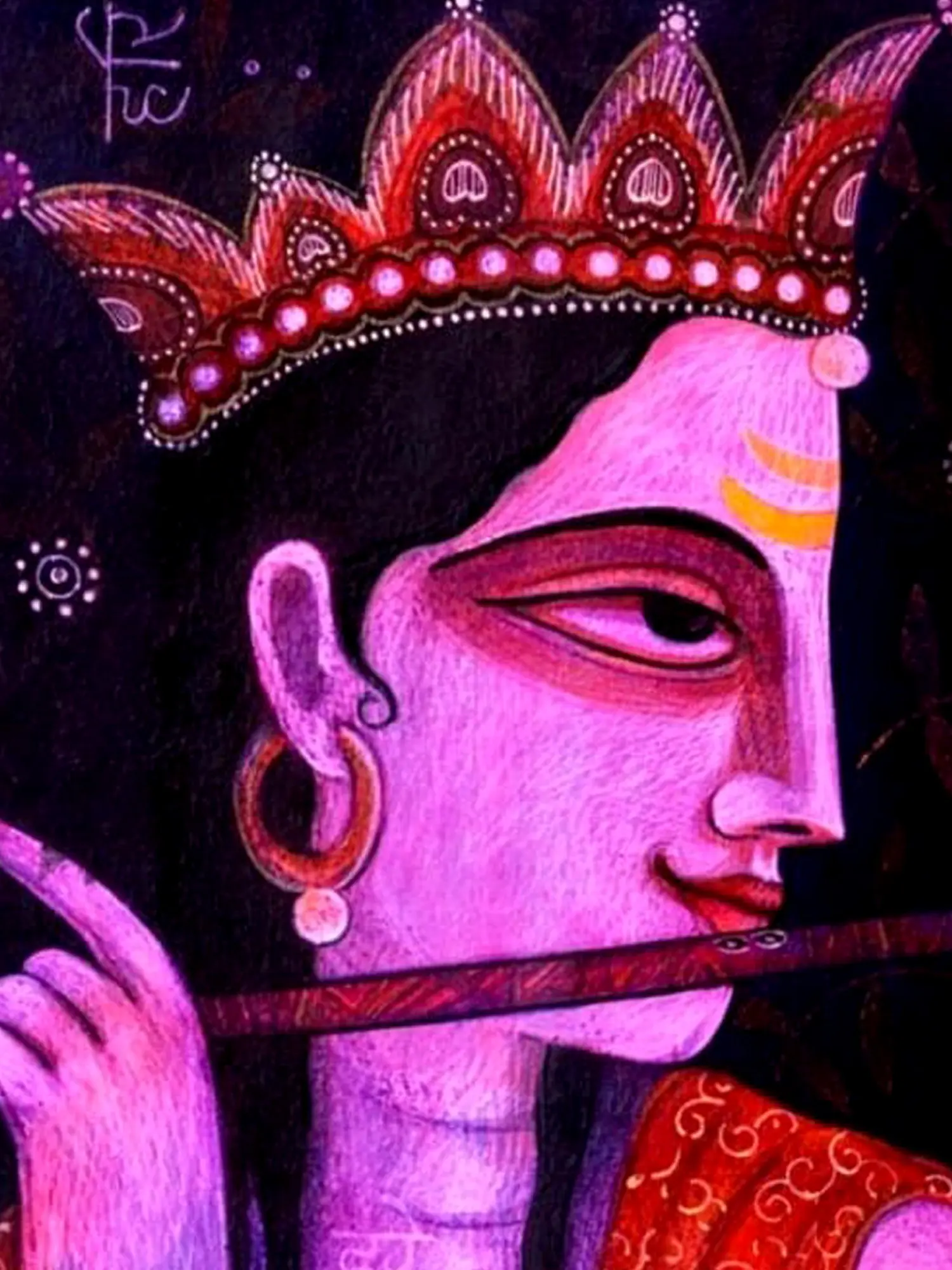 The painting of Fluting Krishna harmonises the distinctive styles of Kishangarh and Bangla art, capturing the divine charm and celestial grace of Lord Krishna as the divine flautist - the artwork evokes the timeless allure of Krishna's melodious flute and enchanting presence. Krishna's divine form radiates with ineffable beauty and spiritual resonance. Through its fusion of artistic styles and cultural motifs, the painting celebrates the universal appeal and enduring legacy of Krishna's divine leelas.