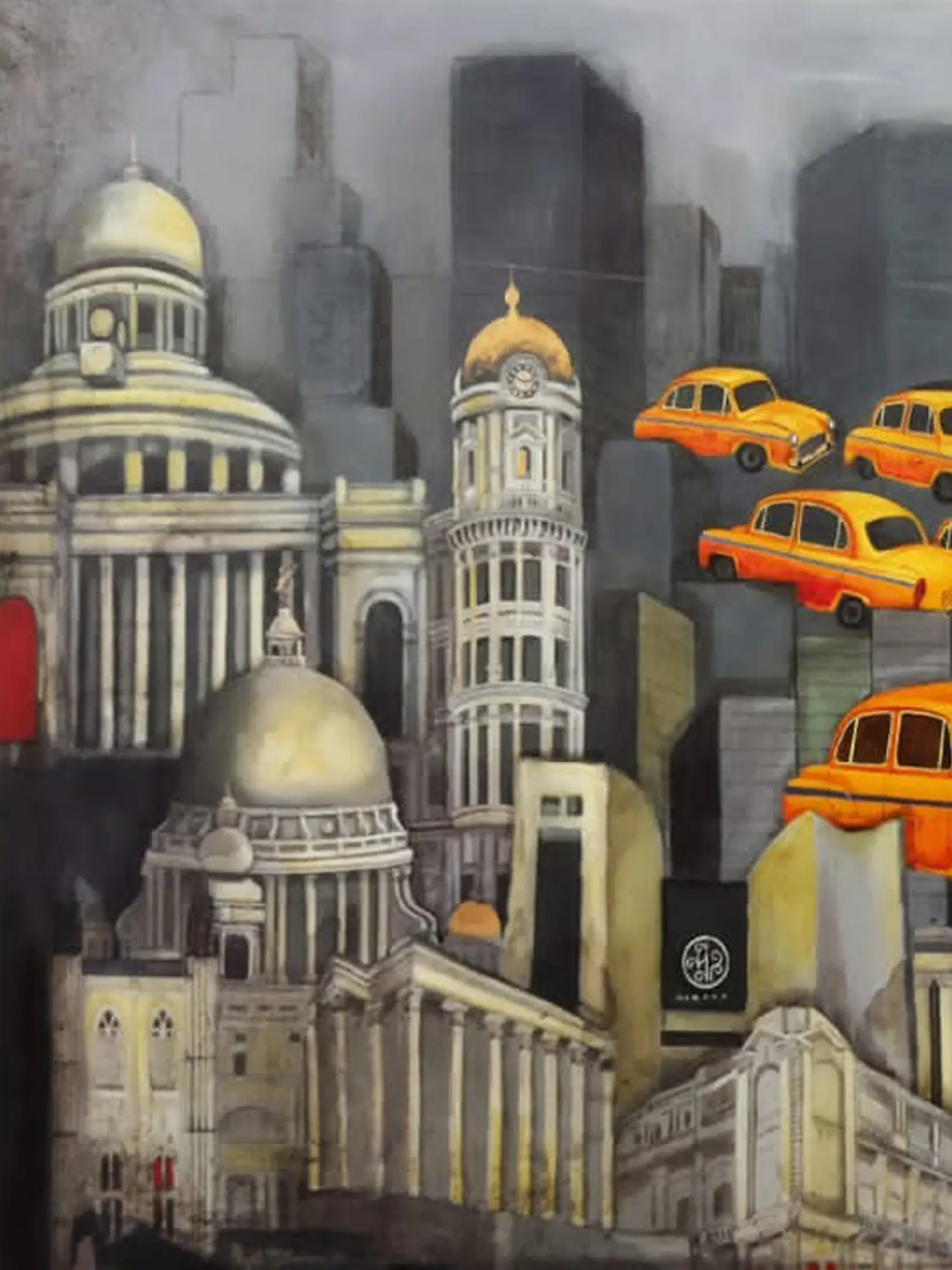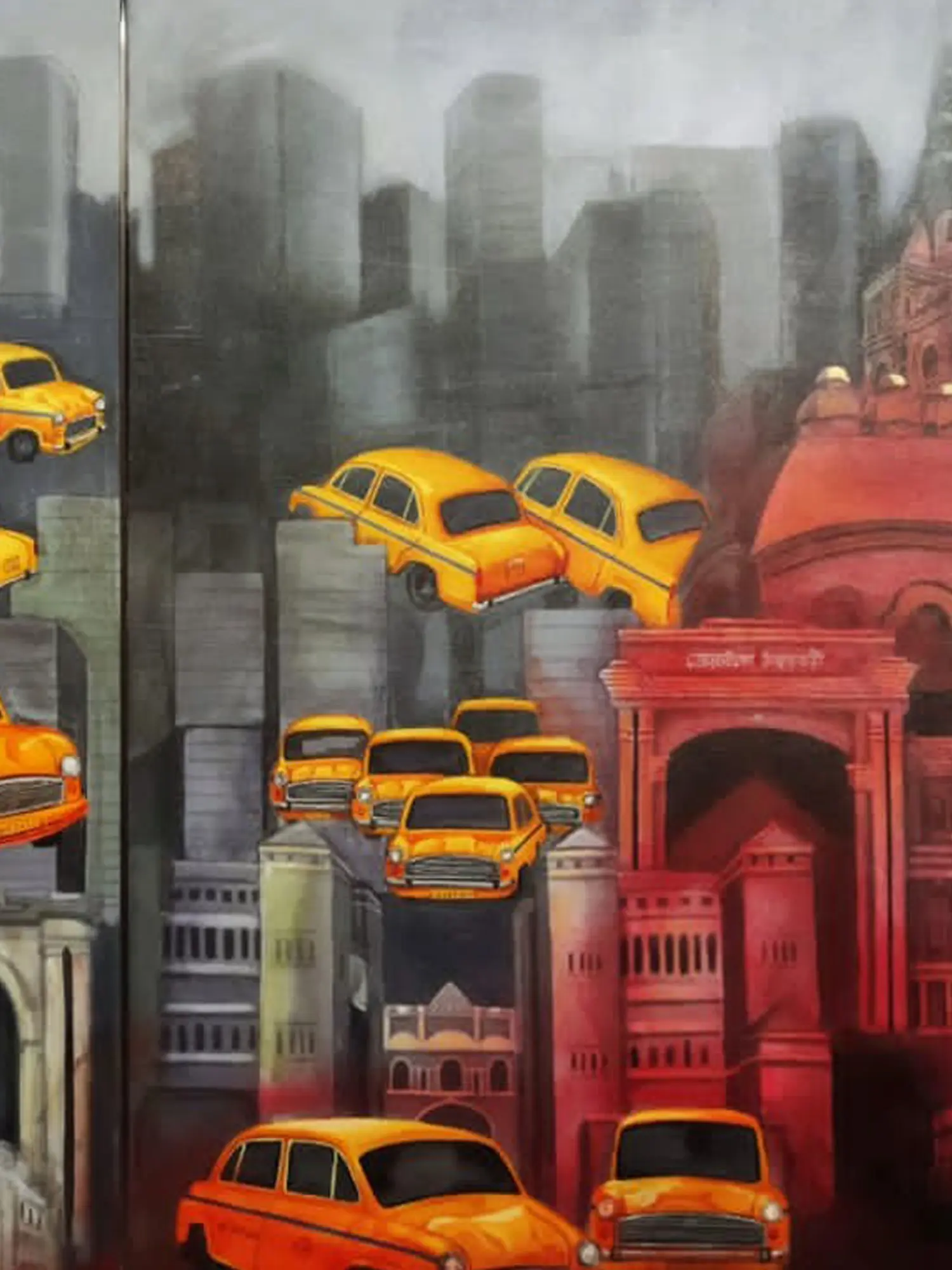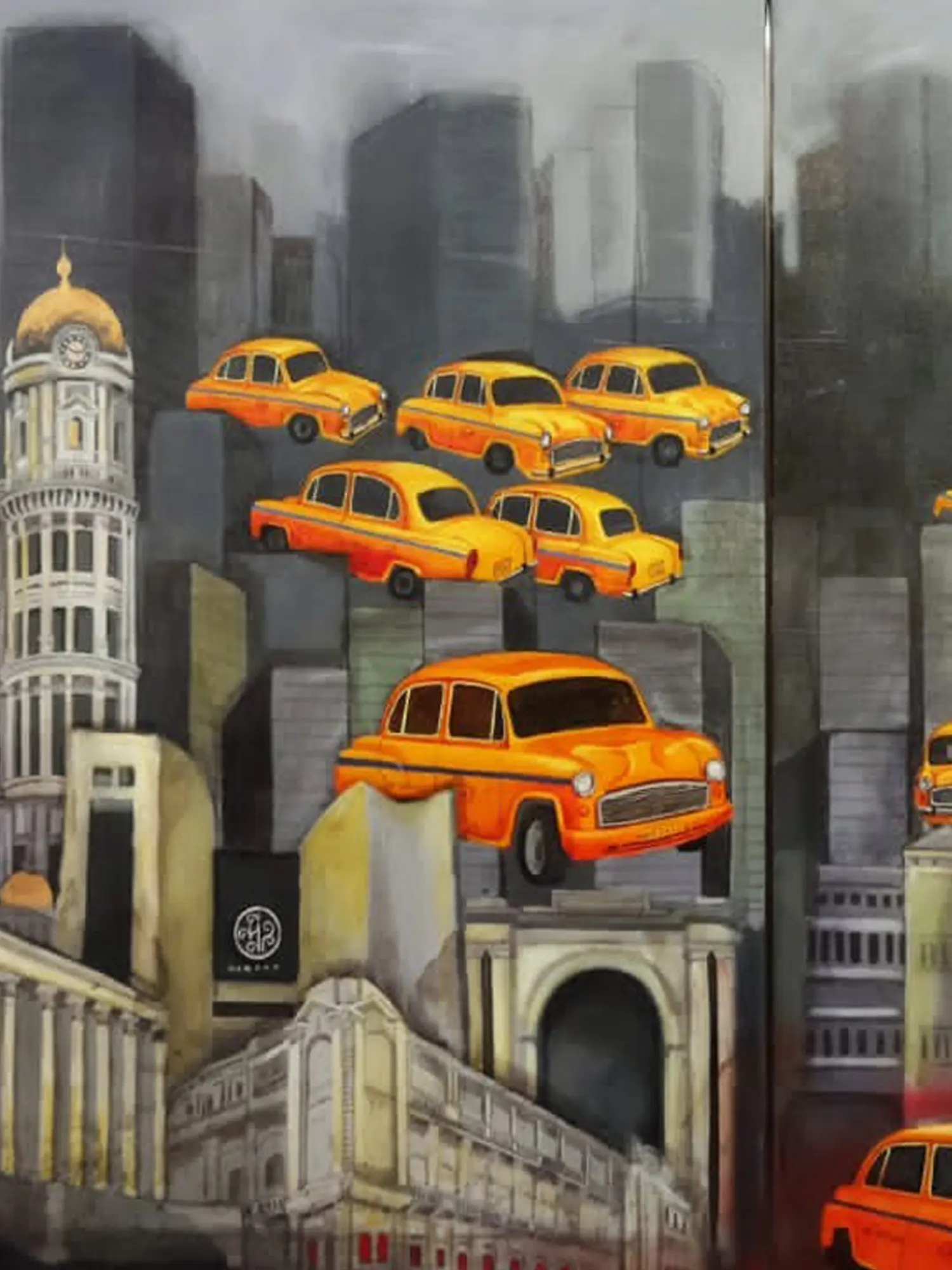 This captivating diptych by Payel Mitra transports the viewer to the heart of Kolkata, a city steeped in history and brimming with life. The artist masterfully captures the essence of this dynamic metropolis, where ancient architecture stands shoulder to shoulder with modern skyscrapers, creating a stunning visual narrative. The iconic yellow taxis, a symbol of Kolkata's vibrant street life, are depicted as if soaring through the cityscape, adding a touch of magical realism to the scene. Their bright yellow hue provides a striking contrast to the muted tones of the buildings, drawing the eye and enhancing the dynamism of the composition. The scale of the taxis, relatively larger than in reality, imbues them with a sense of importance, as if they were mythical chariots traversing the urban landscape.