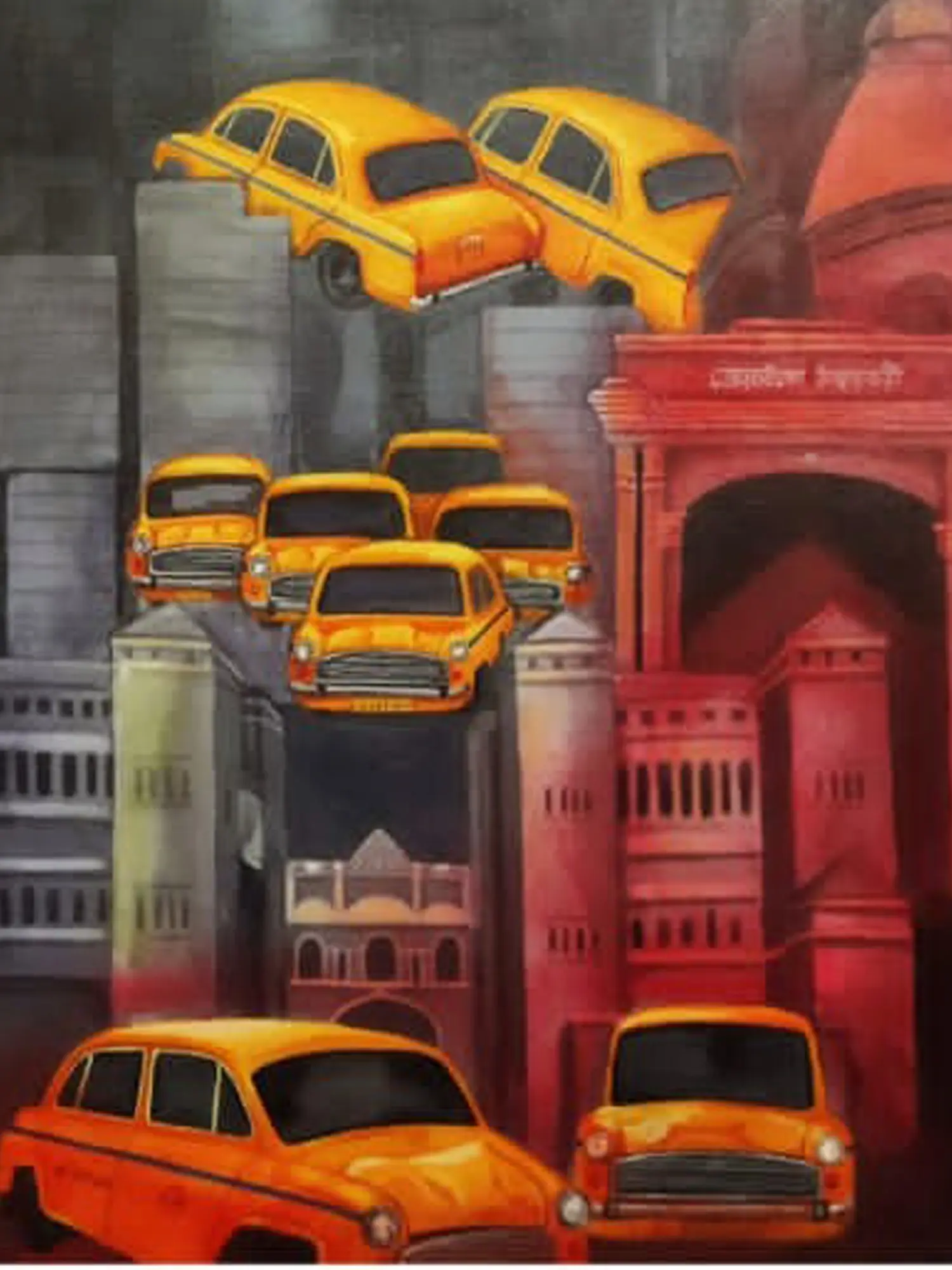 Taxis On Kolkata Road | Acrylic On Canvas | By Payel Mitra
