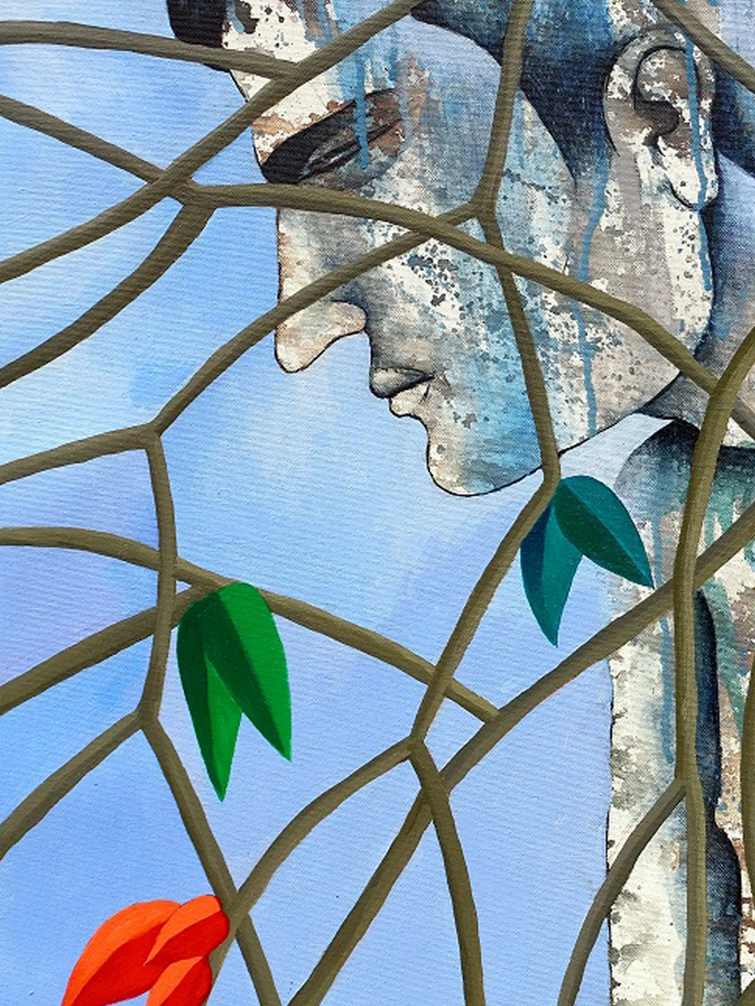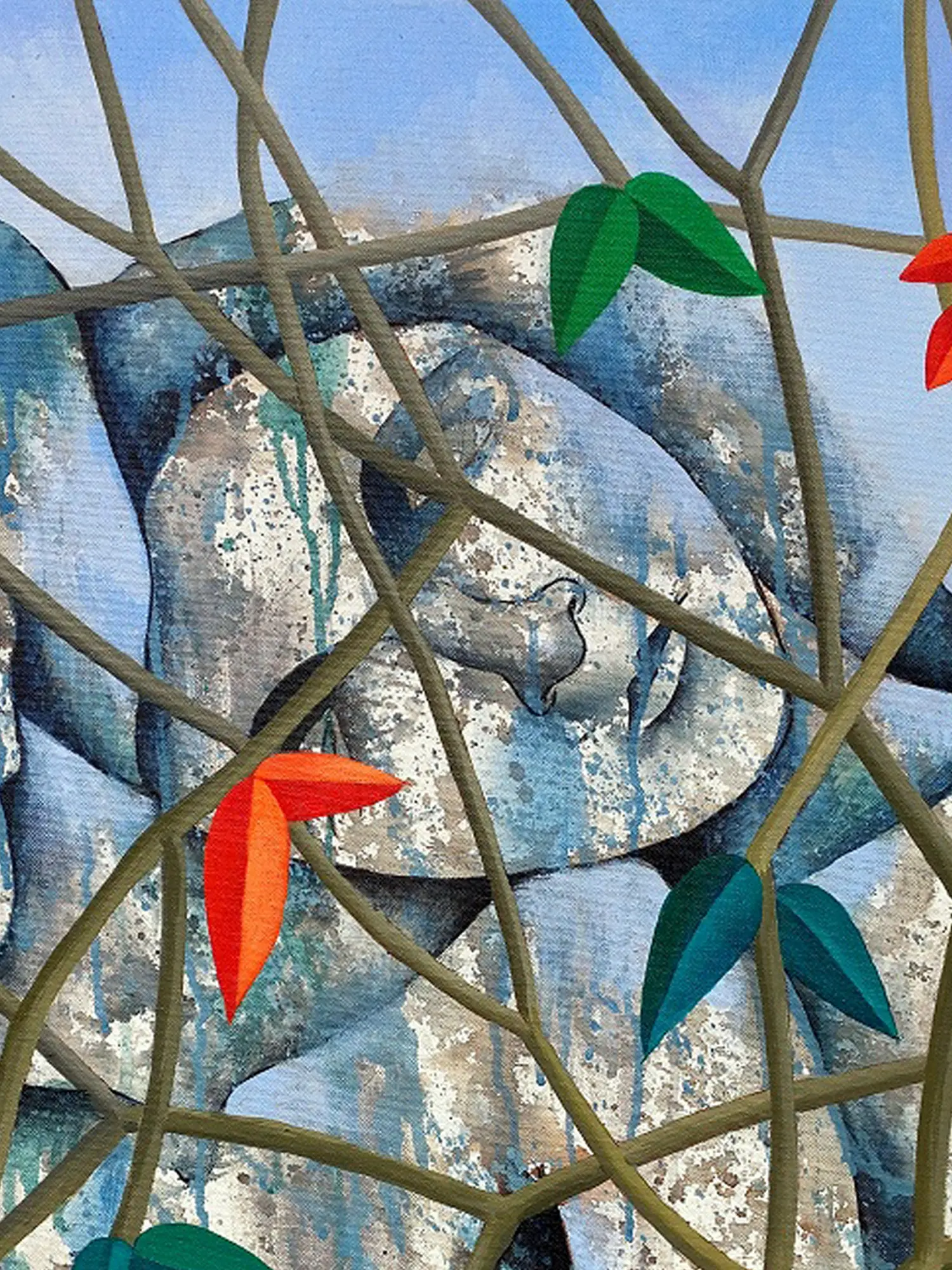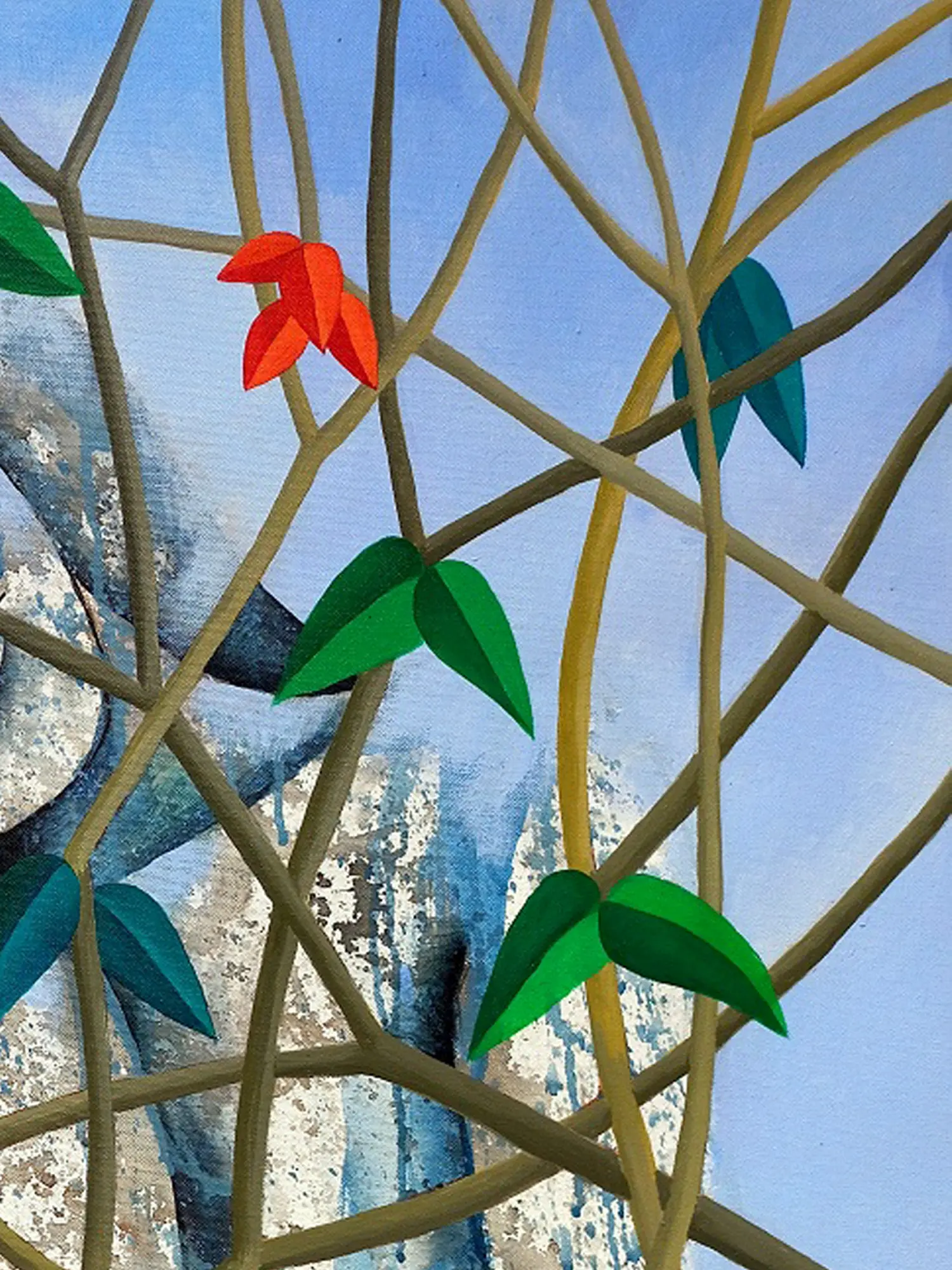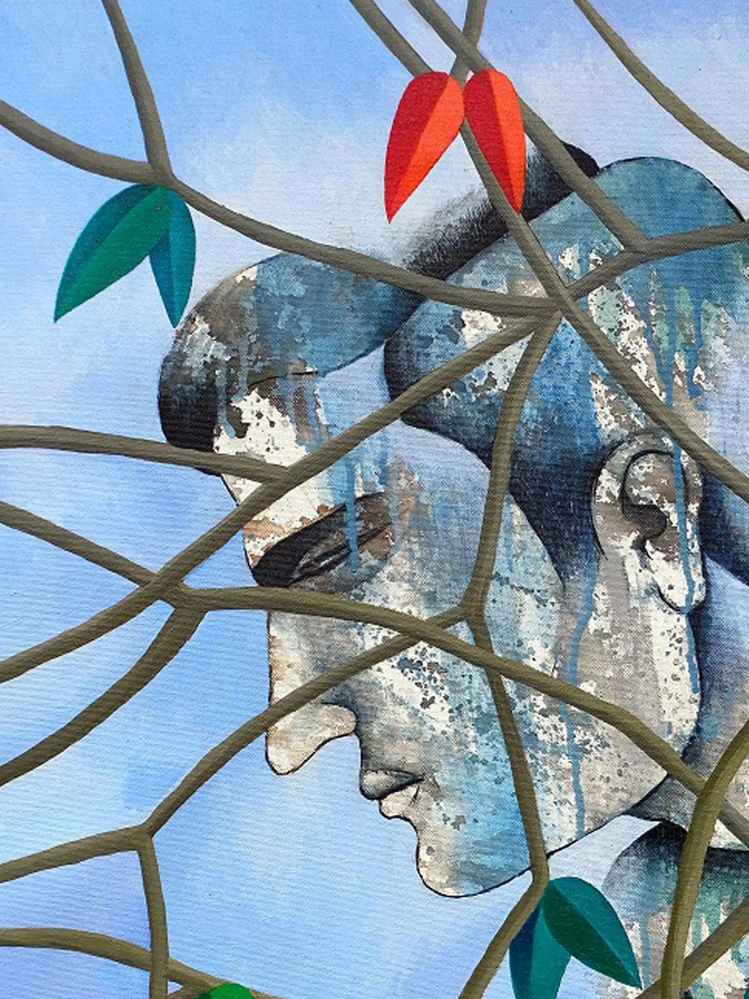 The composition presents an intriguing interplay of forms and elements, measuring 30 inches in height and 40 inches in width. A gentle, cerulean sky serves as the backdrop, allowing the intertwined branches and abstract figures to command attention. The contrasting tones, from the cool blues and grays of the figures to the warm oranges and greens of the foliage, create a dynamic visual experience that is both engaging and harmonious. You will appreciate the subtle yet impactful use of light and shadow that adds a sense of depth.