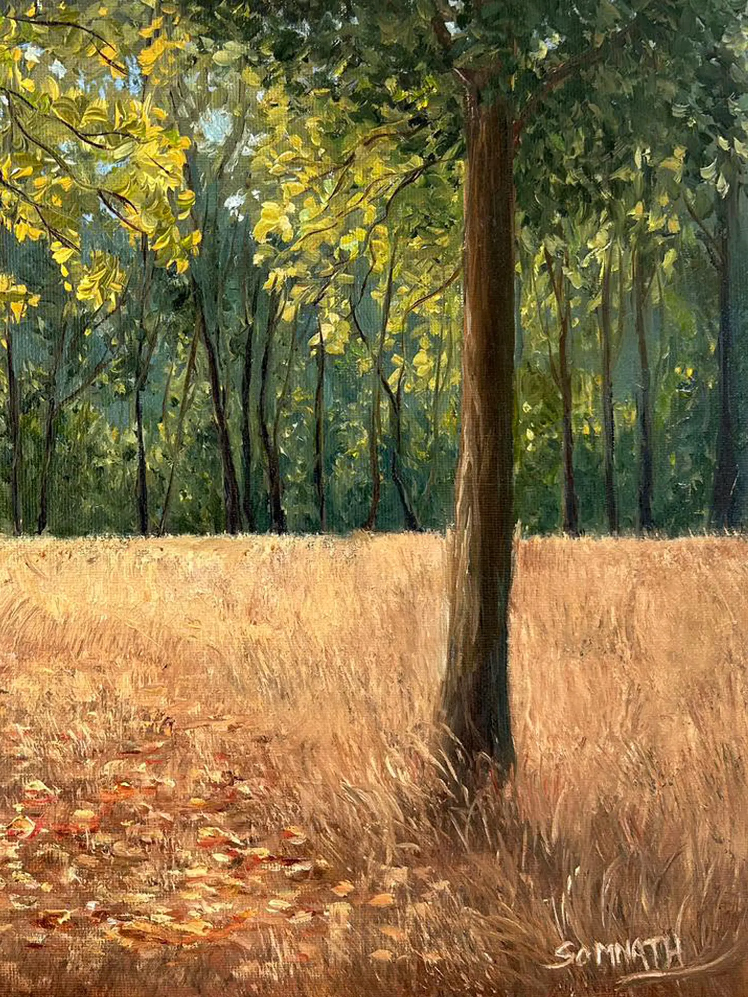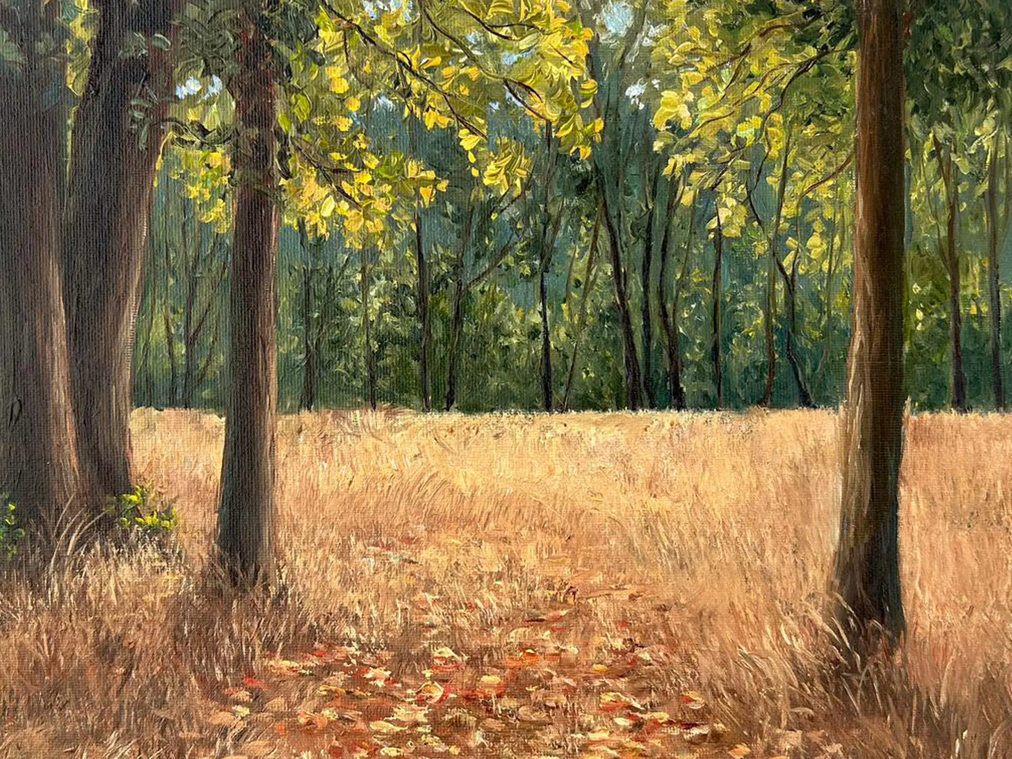 The oil painting capturing a forest view transports viewers to a realm of natural beauty and tranquil serenity. With sweeping strokes, the artwork portrays the lush foliage and dappled sunlight of the forest canopy. Through the interplay of light and shadow, the scene exudes a sense of mystery and enchantment, inviting viewers to explore the hidden wonders of nature's sanctuary. The forest vista becomes a sanctuary for reflection and introspection, where the timeless rhythms of the natural world.