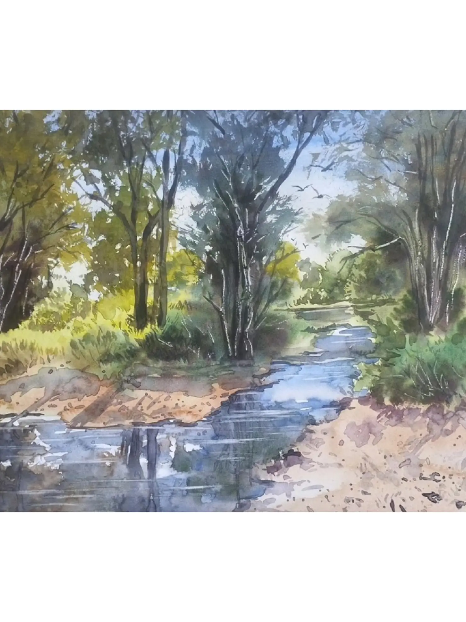 In this captivating Watercolor on Fabriano Paper, the artist masterfully captures the tranquil allure of a deep jungle with a meandering river. The skillful use of dark, wet-on-wet watercolors adds a touch of drama, creating a rich and immersive atmosphere. The interplay of deep hues infuses the jungle scene with mystery, evoking the untamed beauty of nature.