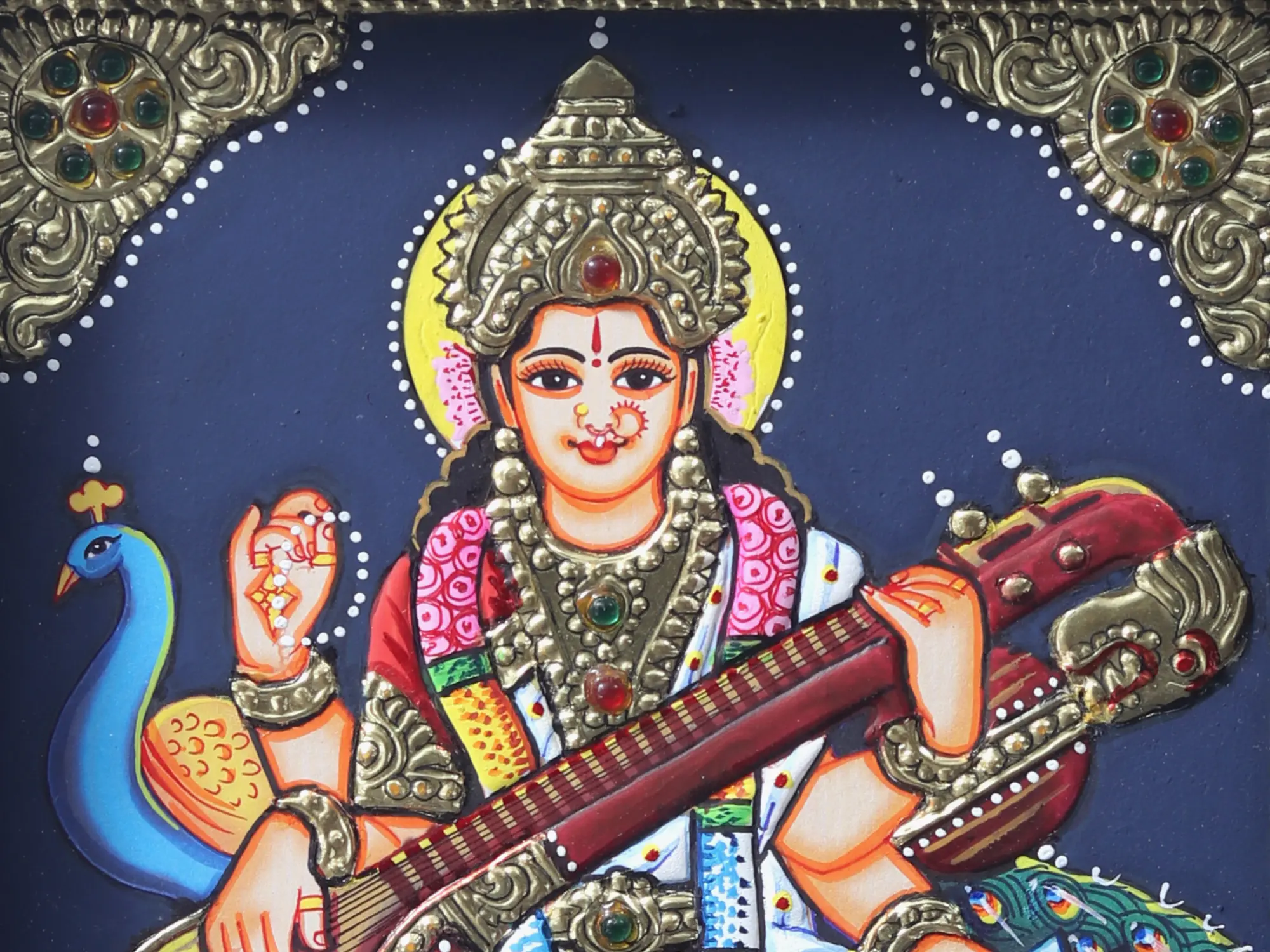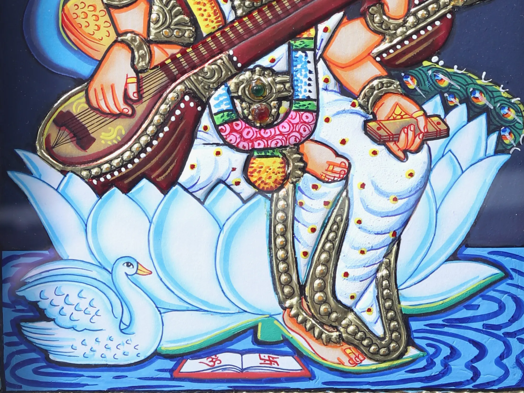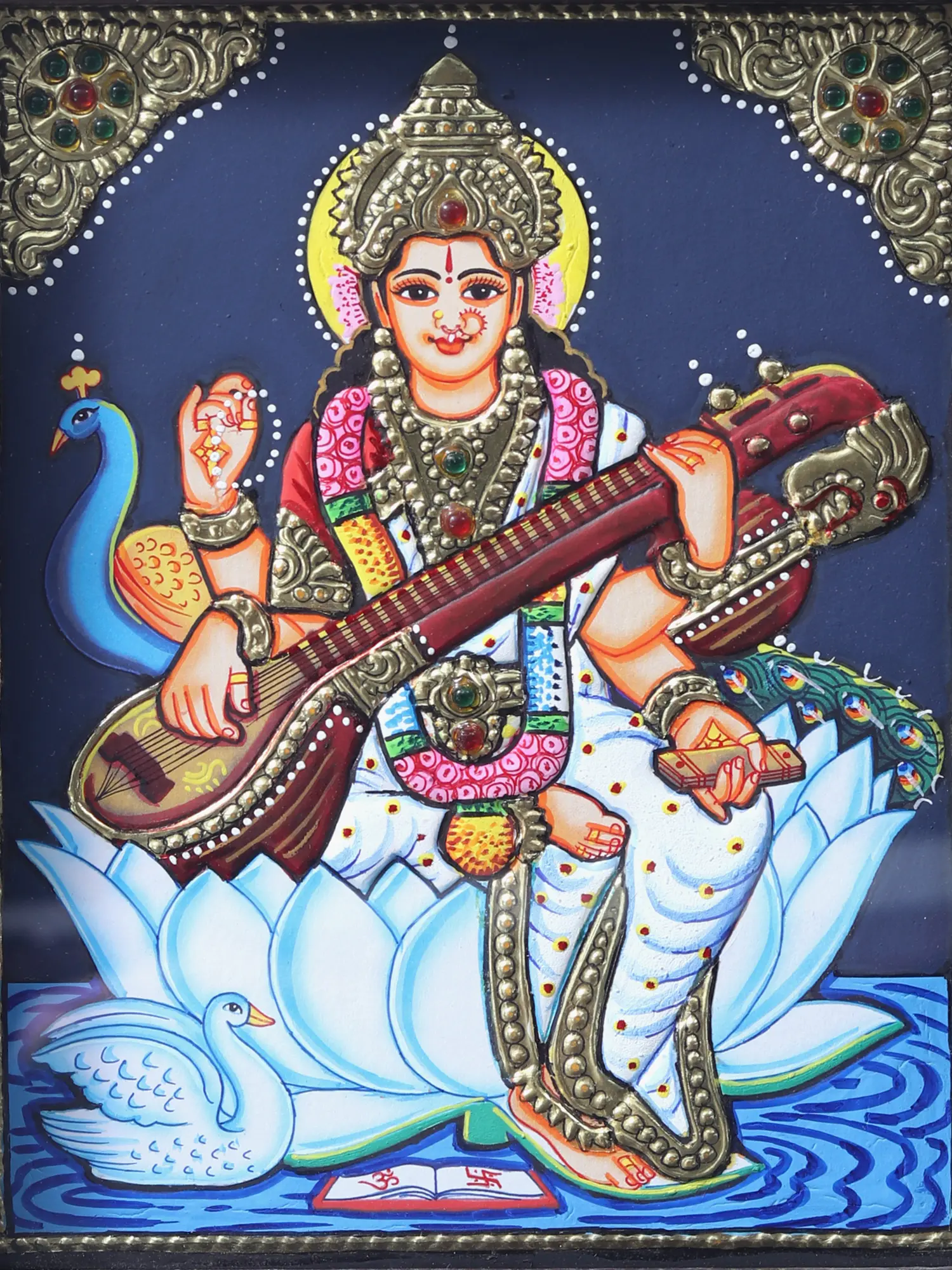Sarwaswati - mother goddess of arts, wisdom, and everything flowing from the inspiration of creativity sits in a lalitasana on a white Pamda accompanied by her Vahana\Mount - Hamsa\Swan and a Mayura\Peacock. Draped in white fabric, she personifies purity in this Chaturbhuja form holding a Japamala, Veena, and Gyana Pustak. At her feet are prime spiritual icons of Aum and Swastika representing the base of all spiritual truths we learn.