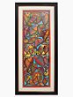 Each fish is a beauteous element with extended finnage on the sides. Whichever one you look at is a more eye-catching colour than the other - every single one of the bitone fish is a combination of grey, yellow, red, brown, ochre, green, and peach. Some of the larger fish are turned upside down because of the momentum of the school, but they are all unidirectionally headed. Note the random yellow-coloured eye-cones between fish, which look vibrant against the blue of the riverine background and the solid scarlet of the edges of the composition.
