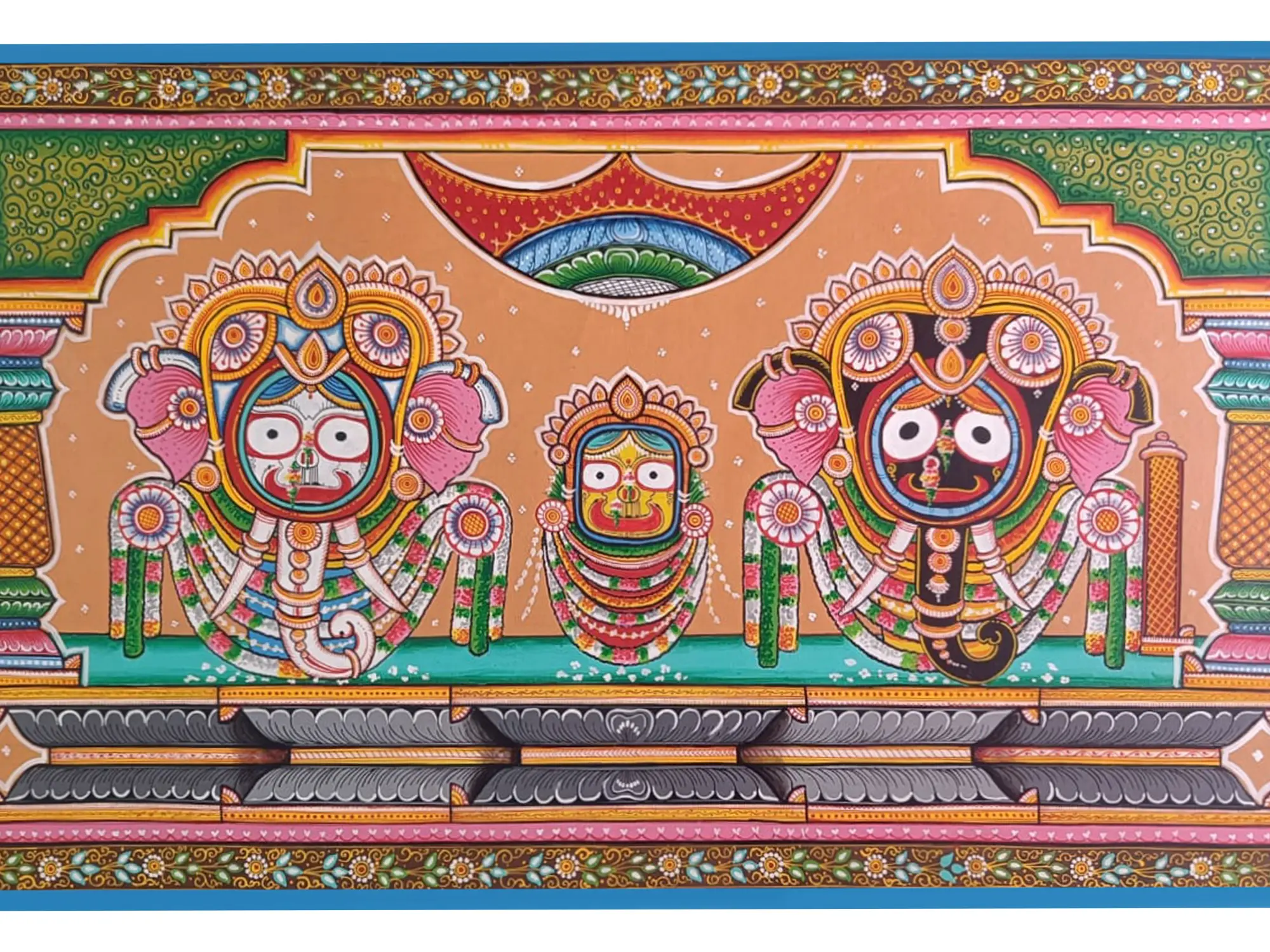 The divine trio of Lord Jagannath, Subhadra, and Balarama embodies profound spiritual significance and celestial grace in Hindu mythology. Lord Jagannath, revered as the lord of the universe, stands at the centre, radiating divine benevolence and cosmic harmony. His serene countenance and majestic presence symbolise the eternal cycle of creation, preservation, and dissolution. Beside him stands Subhadra, the embodiment of divine love and sisterly affection.