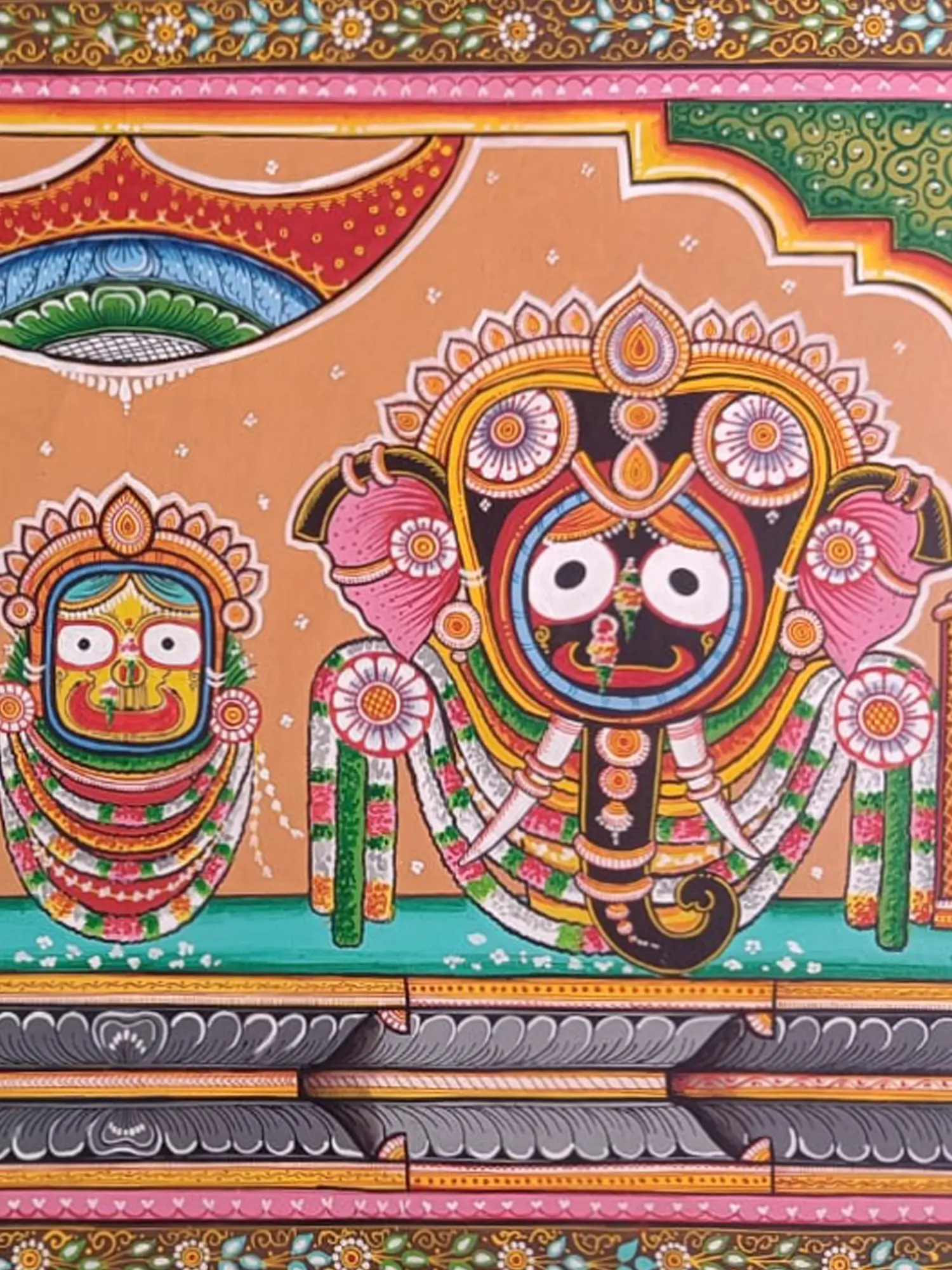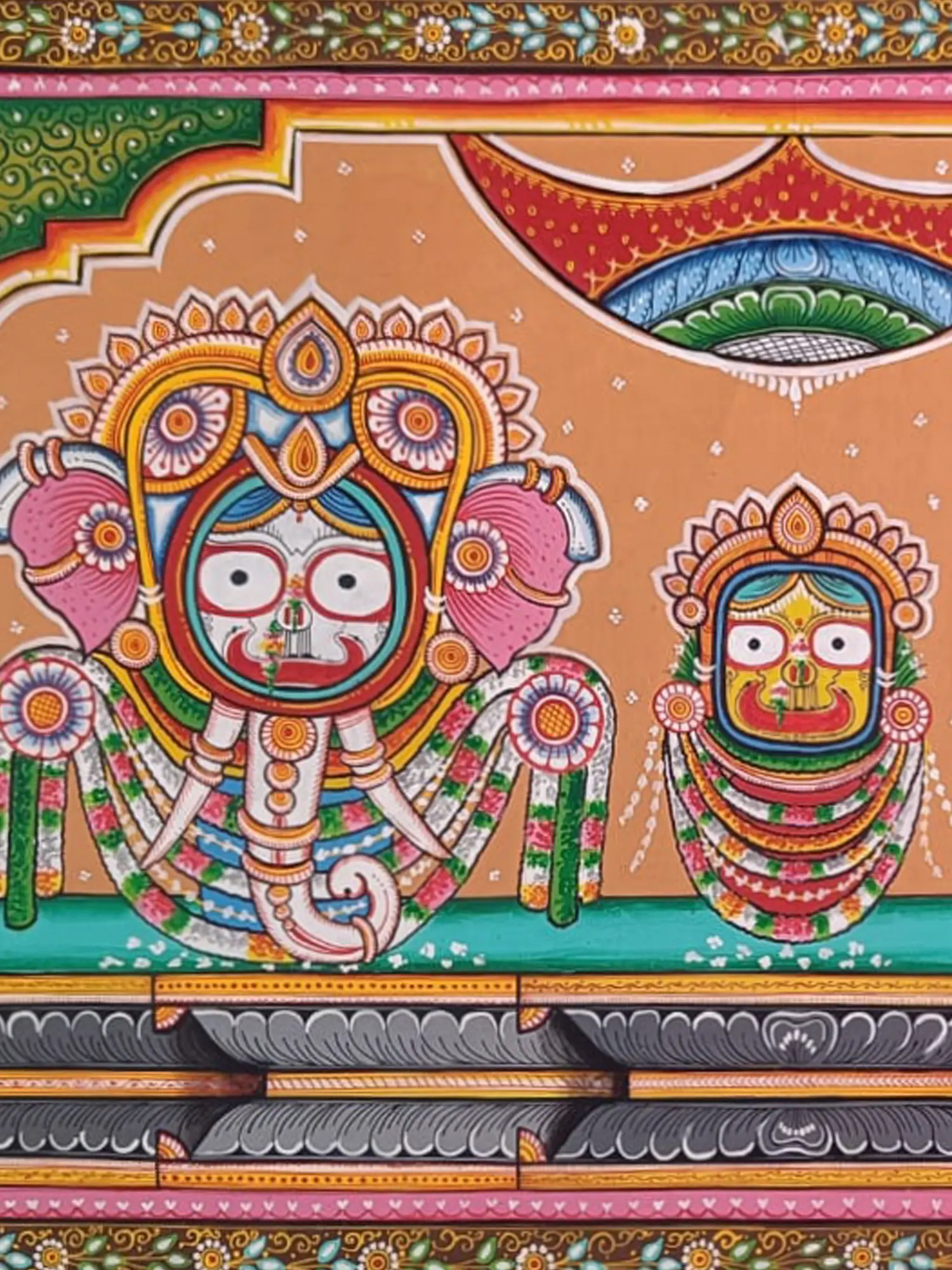 With gentle grace and tender devotion, she compliments Jagannath's divine aura, symbolising the inseparable bond of familial love and spiritual devotion. On the other side stands Balarama, the epitome of strength and righteousness. As Jagannath's steadfast companion and protector, Balarama embodies the virtues of valour and loyalty, standing tall as a pillar of strength and support.