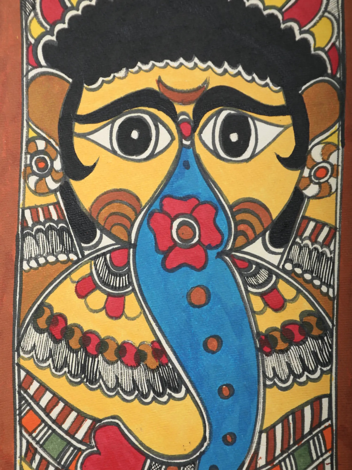 This exquisite Madhubani painting captures the essence of Lord Ganesha, the beloved Hindu deity revered as the remover of obstacles and the bestower of good fortune. Ganesha, with his elephant head and endearingly chubby form, is a symbol of wisdom, prosperity, and auspicious beginnings. Depicted here in vibrant Madhubani style, his presence exudes both power and charm. The artist, Ashutosh Jha, masterfully employs the traditional techniques of this ancient folk art, creating a piece rich in detail and symbolic meaning. The bright colours and intricate patterns characteristic of Madhubani paintings perfectly complement the revered subject, adding to the artwork's spiritual and aesthetic impact. His large, expressive eyes and gentle expression invite contemplation and devotion, embodying the benevolent nature of the god. The painting's rich symbolism extends to the elaborate crown, clothing, and other decorative elements, each laden with meaning and significance within the context of Hindu mythology.
