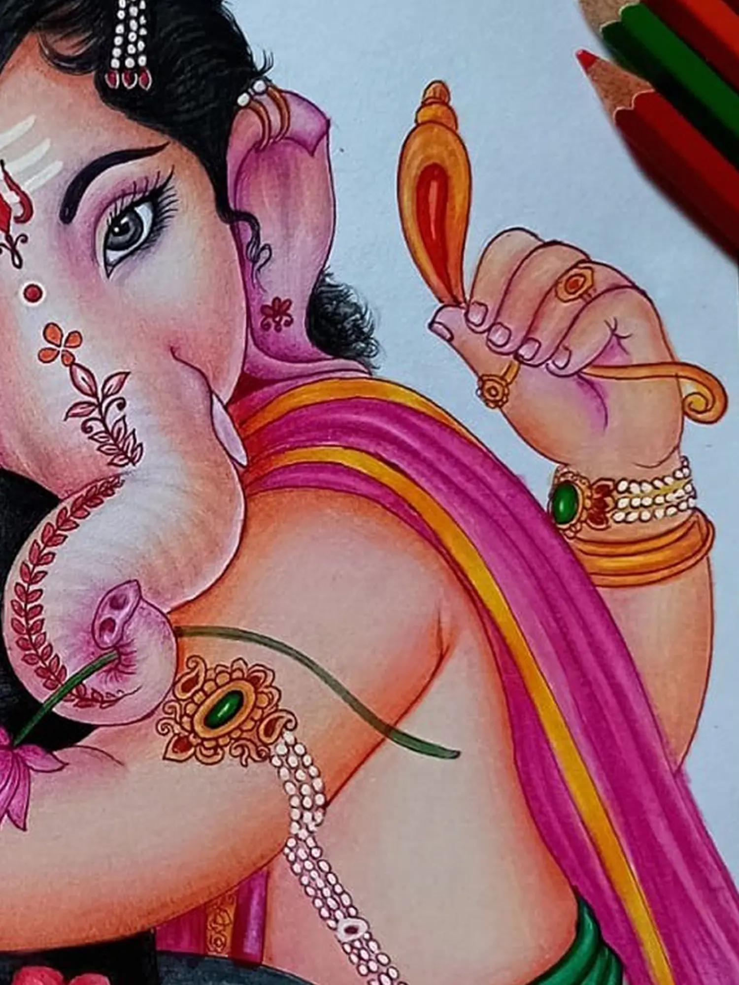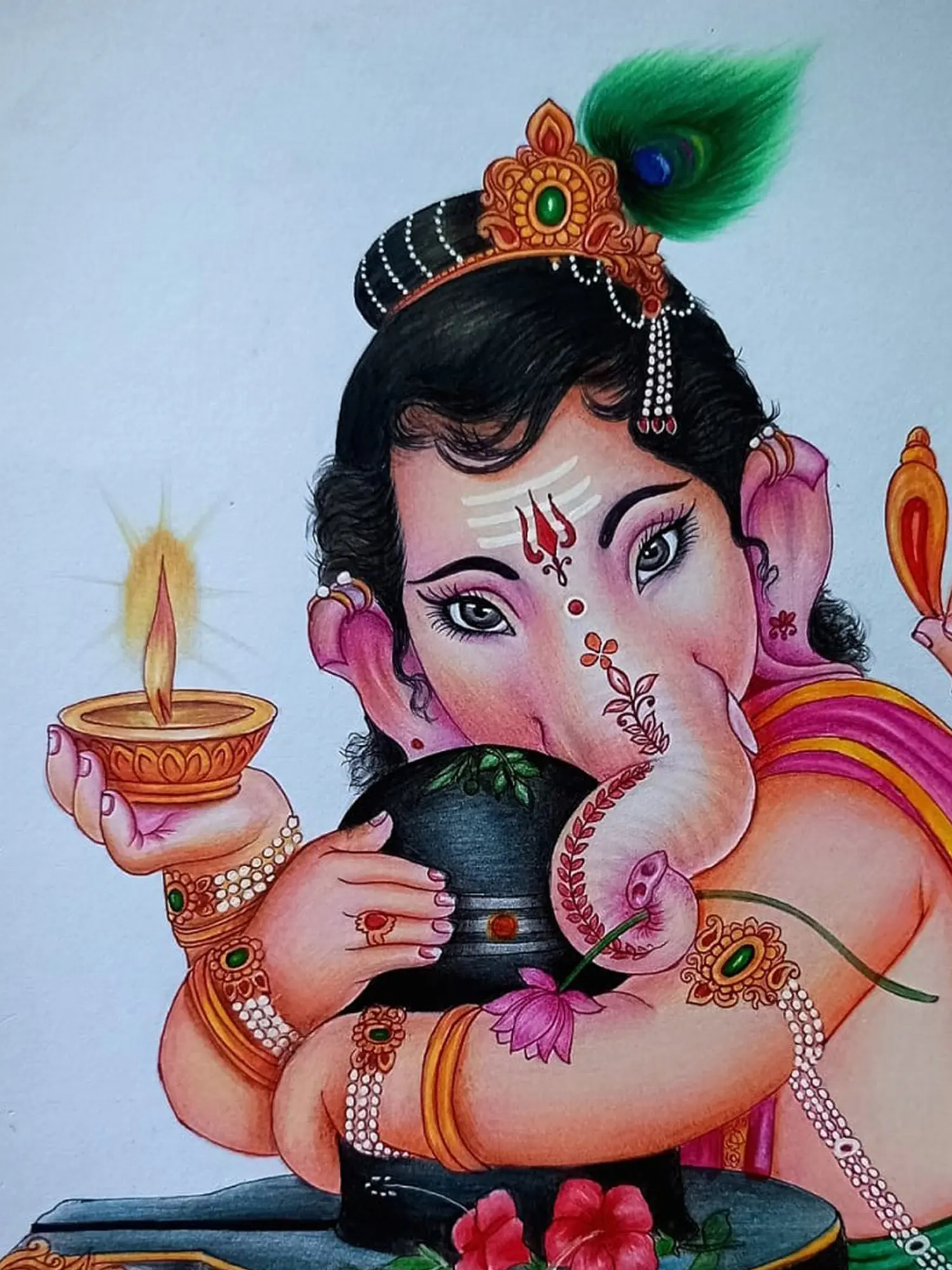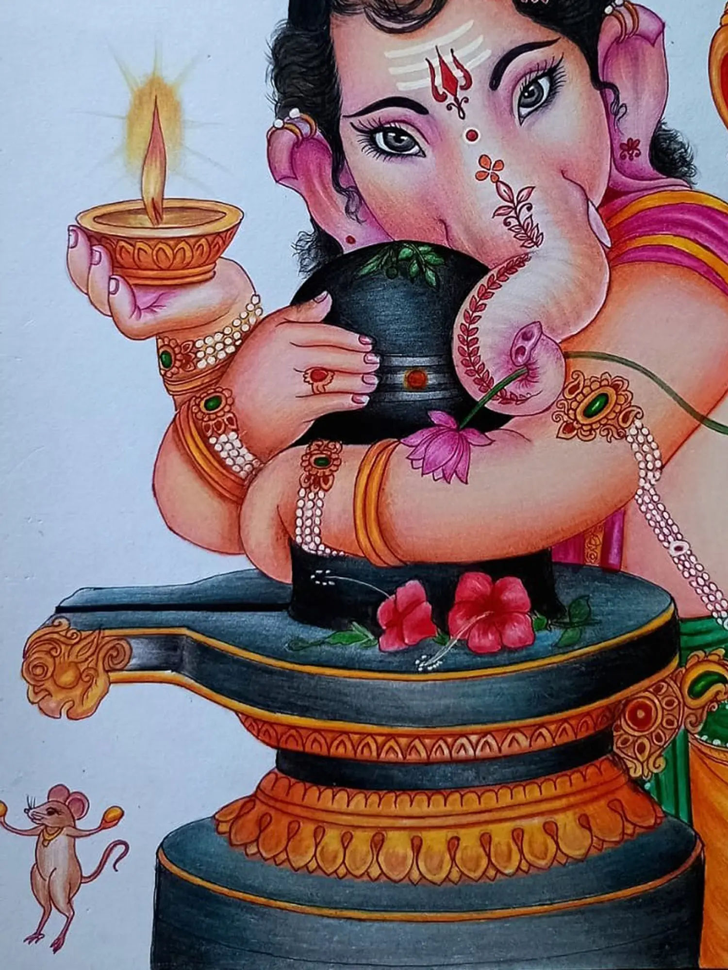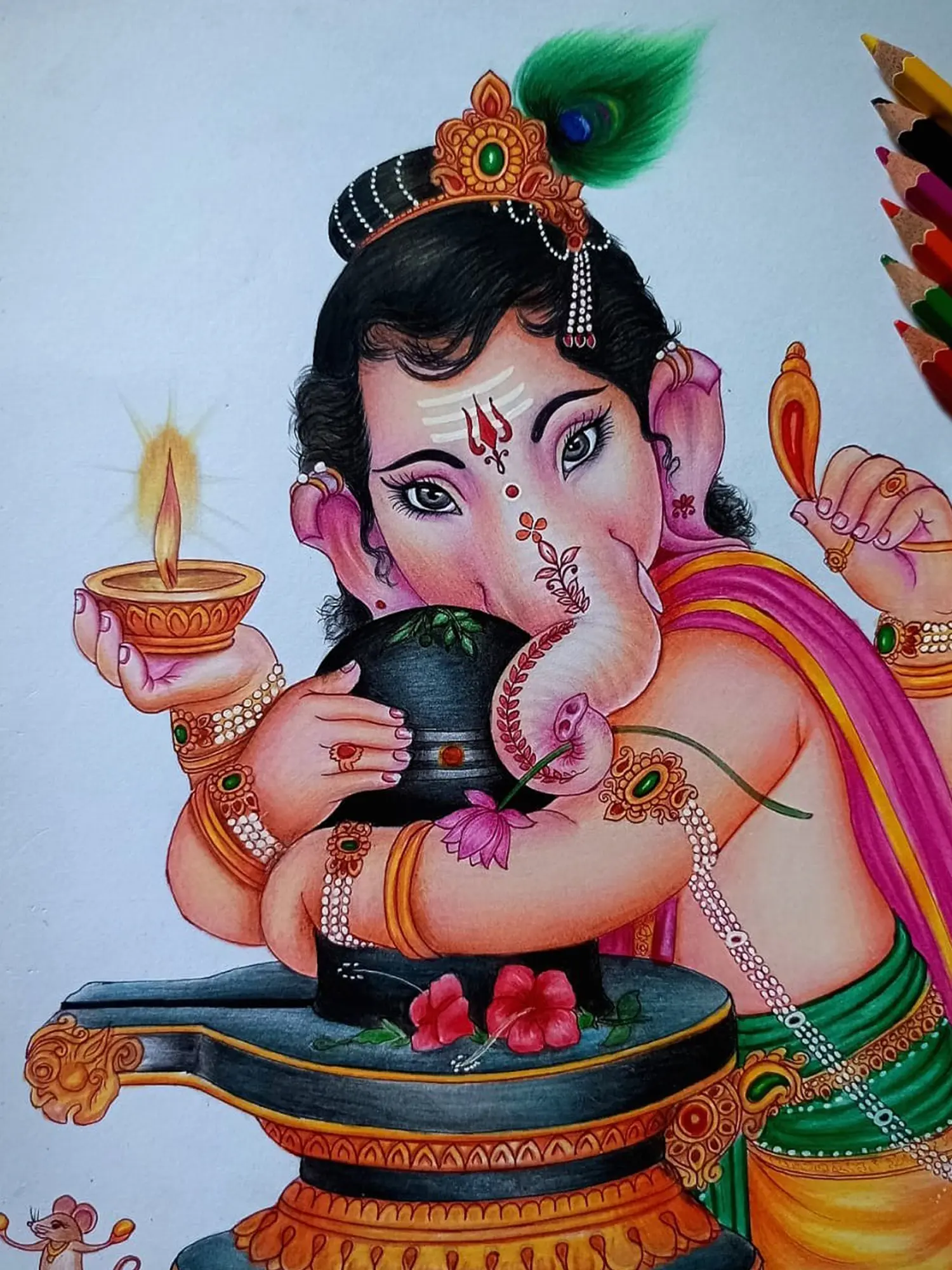 With delicate strokes of colour pencil, Sunil Kumar portrays the ethereal moment of Lord Ganesha embracing the sacred Shivling.