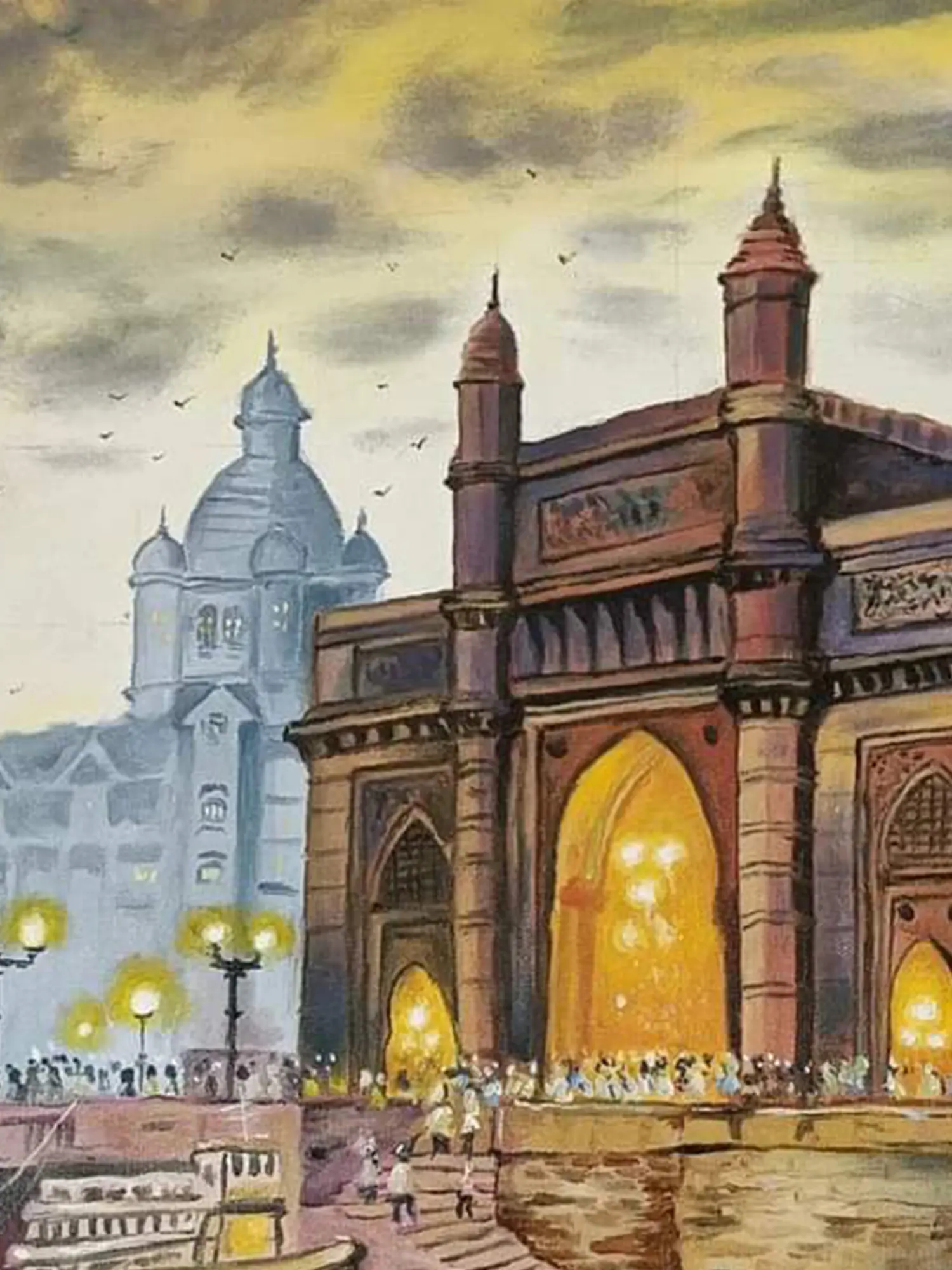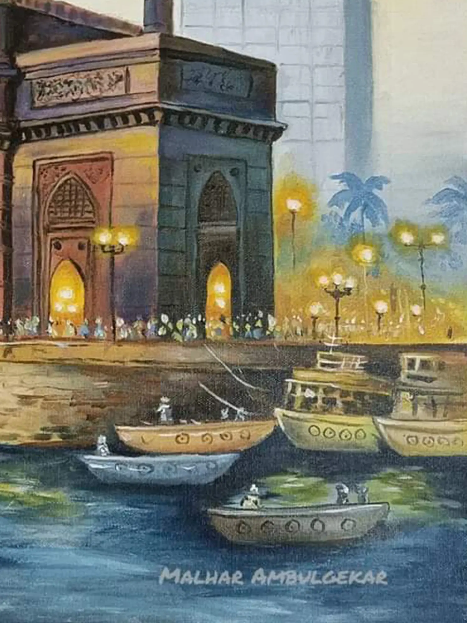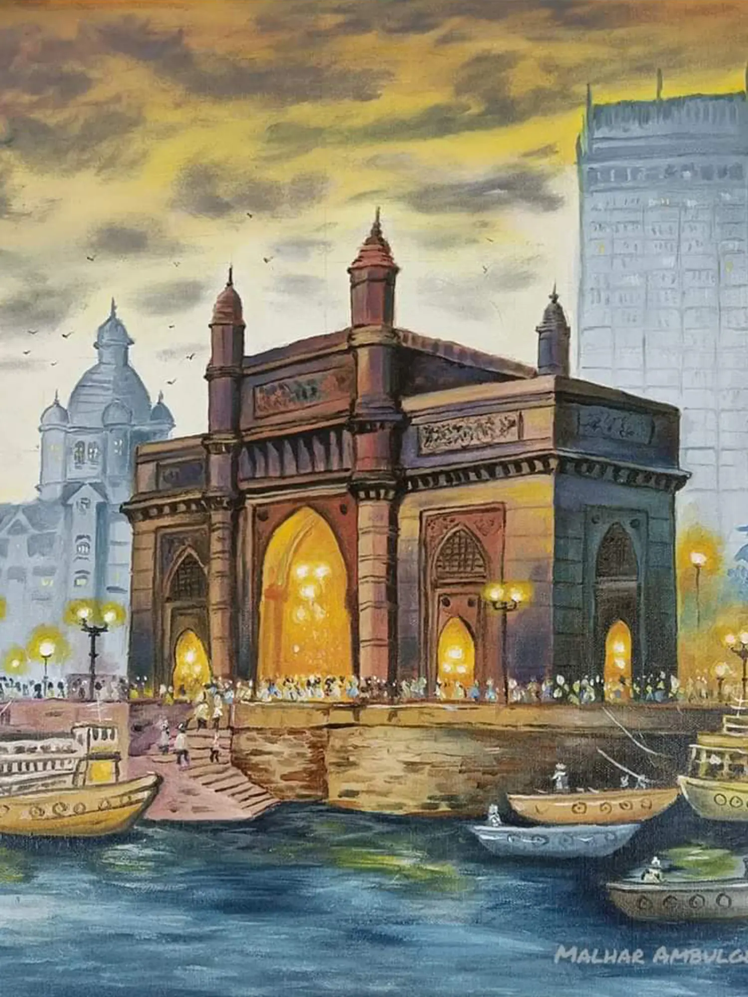 This captivating oil on canvas painting by Malhar Ambulgekar transports you to the heart of Mumbai, India, capturing the iconic Gateway of India in all its glory. The artist masterfully renders the architectural details of this majestic arch, a testament to the city's rich history and colonial past. The warm hues of the setting sun cast a magical glow on the structure, highlighting the intricate carvings and imposing presence of the Gateway. The scene is further enriched by the bustling activity around the monument: ferries gently bobbing on the water, people strolling along the promenade, and the silhouette of modern skyscrapers in the background, showcasing Mumbai's fascinating blend of old-world charm and contemporary dynamism. The painting's size (24" x 24") makes it a striking focal point for any room.