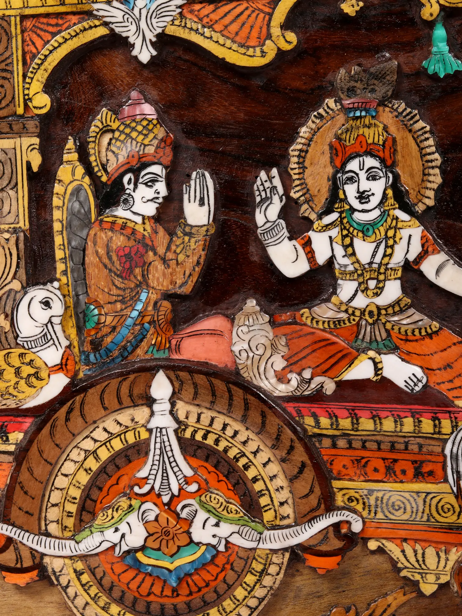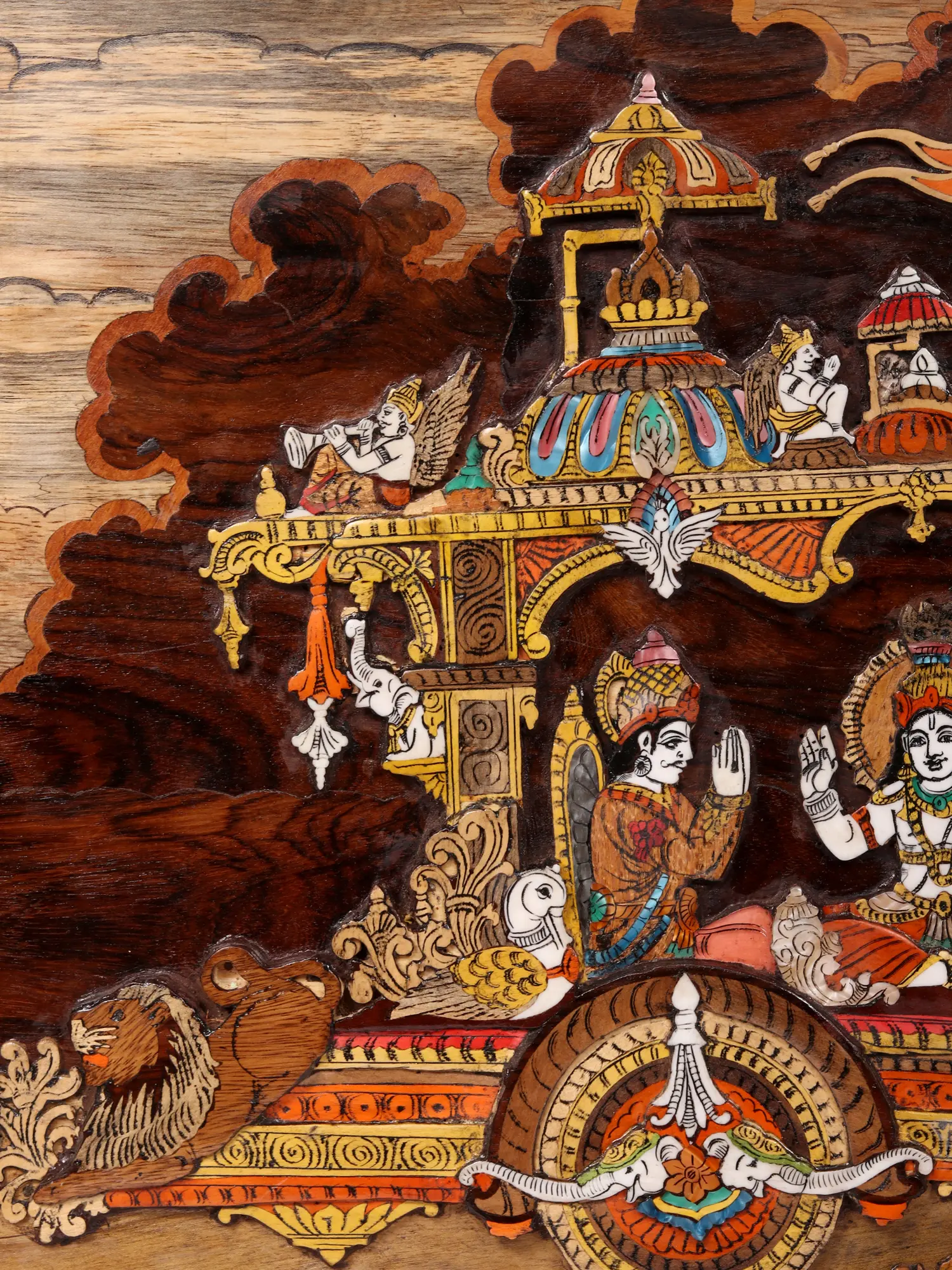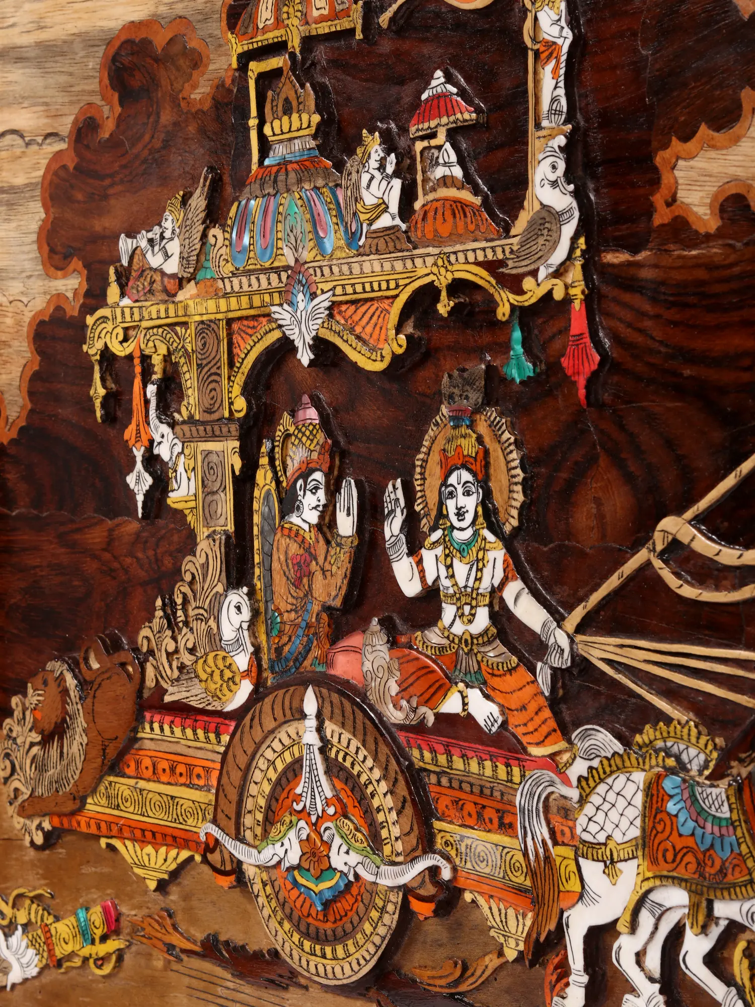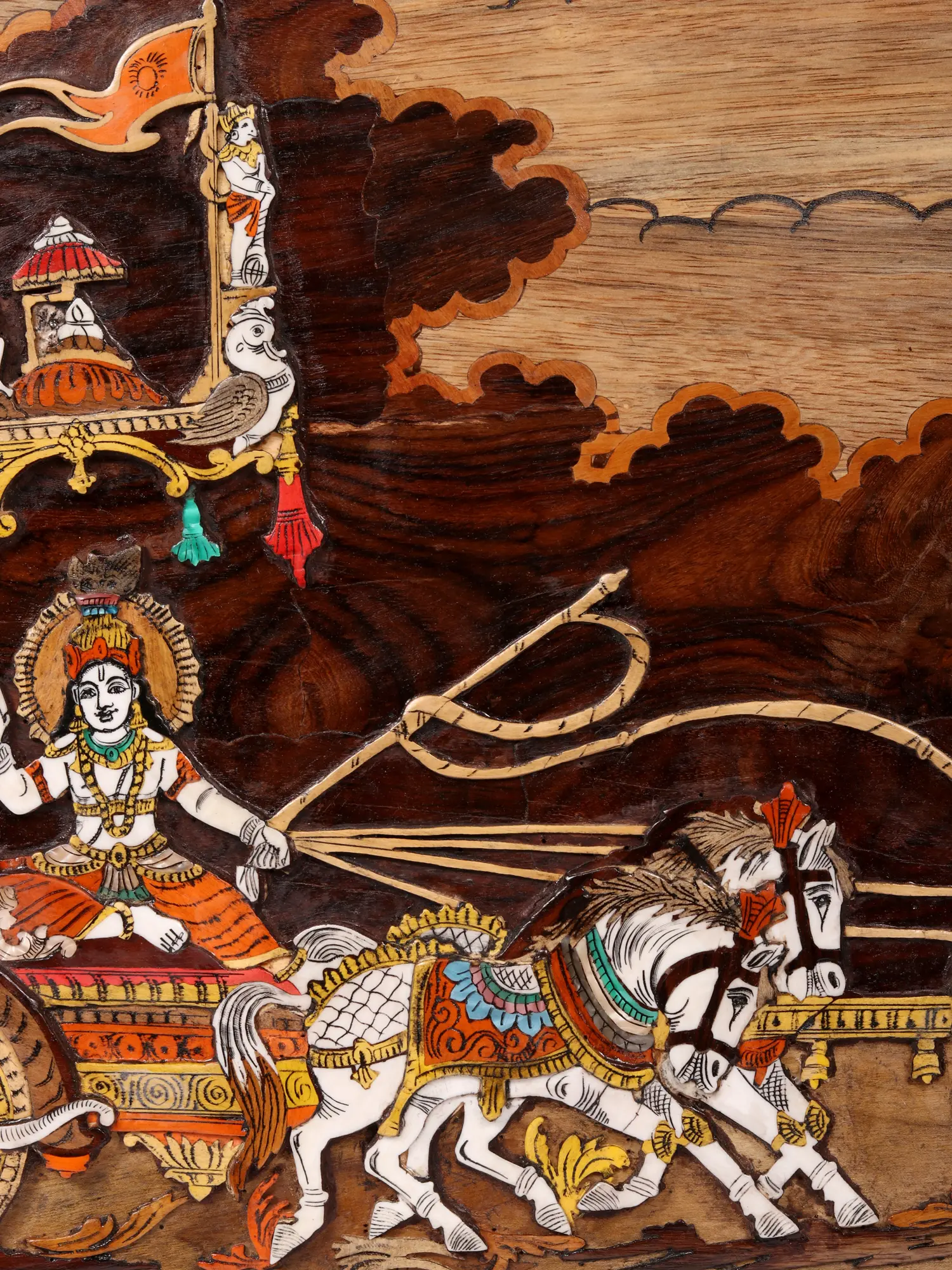 The composition draws you into the heart of the battlefield, with Lord Krishna at the reins of a magnificent chariot pulled by spirited horses. You'll observe the divine aura surrounding Krishna as he imparts his teachings to a thoughtful Arjuna. The background evokes a sense of grandeur and solemnity, with richly textured wooden clouds and earthly tones that frame the central figures. This piece, measuring 24 inches in height and 36 inches in width with a 3-inch depth, commands attention and draws the viewer into its detailed story.