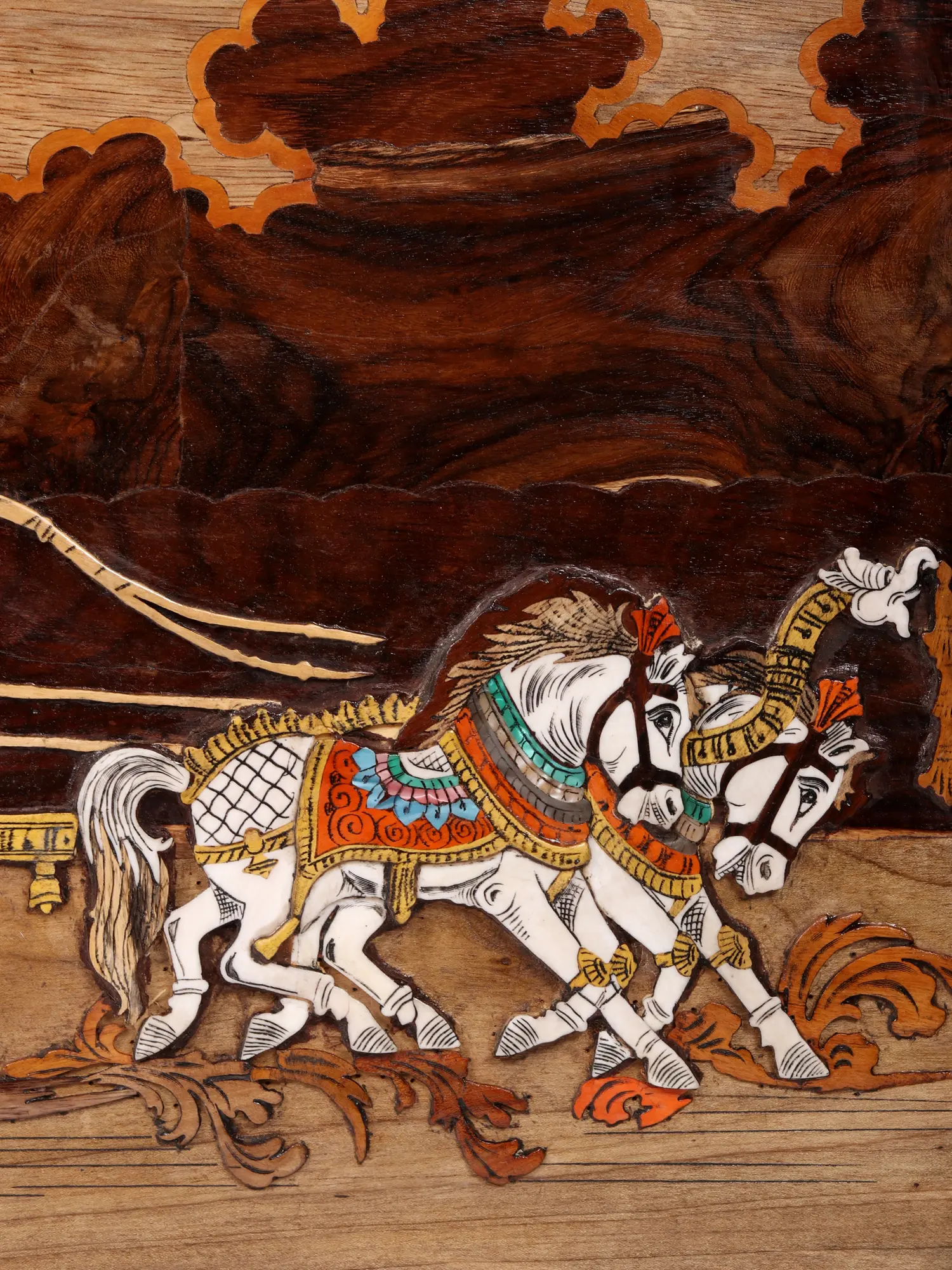 Witness the exceptional skill of artisans who have meticulously sculpted this narrative into existence through the ancient art of wood inlay. Crafted using natural colors on wood, each element is painstakingly shaped and fitted, creating a rich tapestry of texture and detail. The use of fine woods and the delicate inlay work speak to a dedication to preserving traditional techniques, ensuring a piece of enduring beauty and quality.
