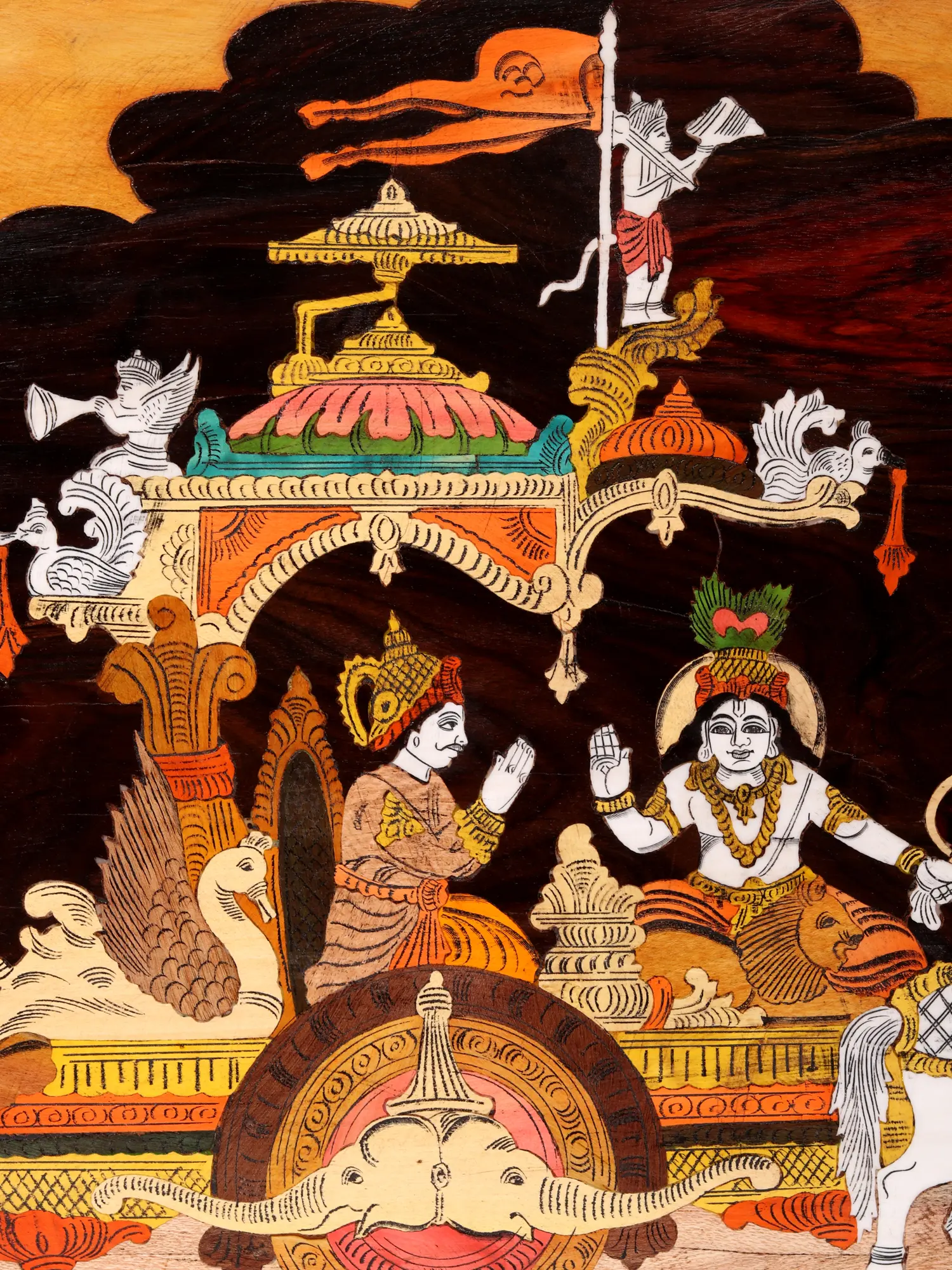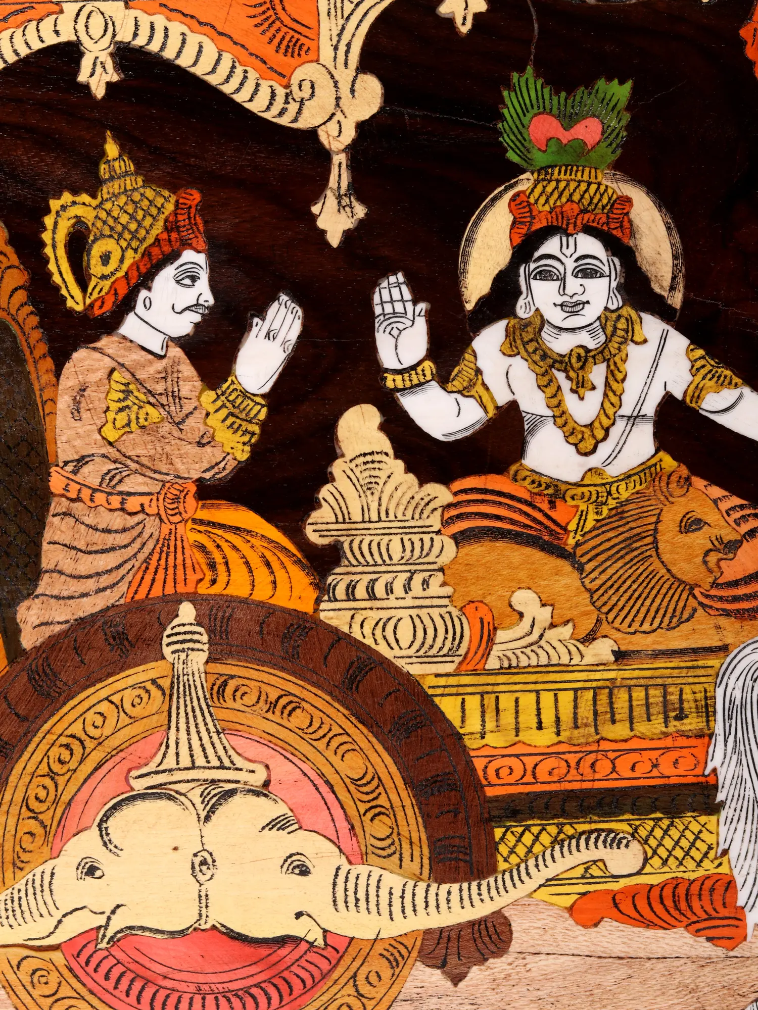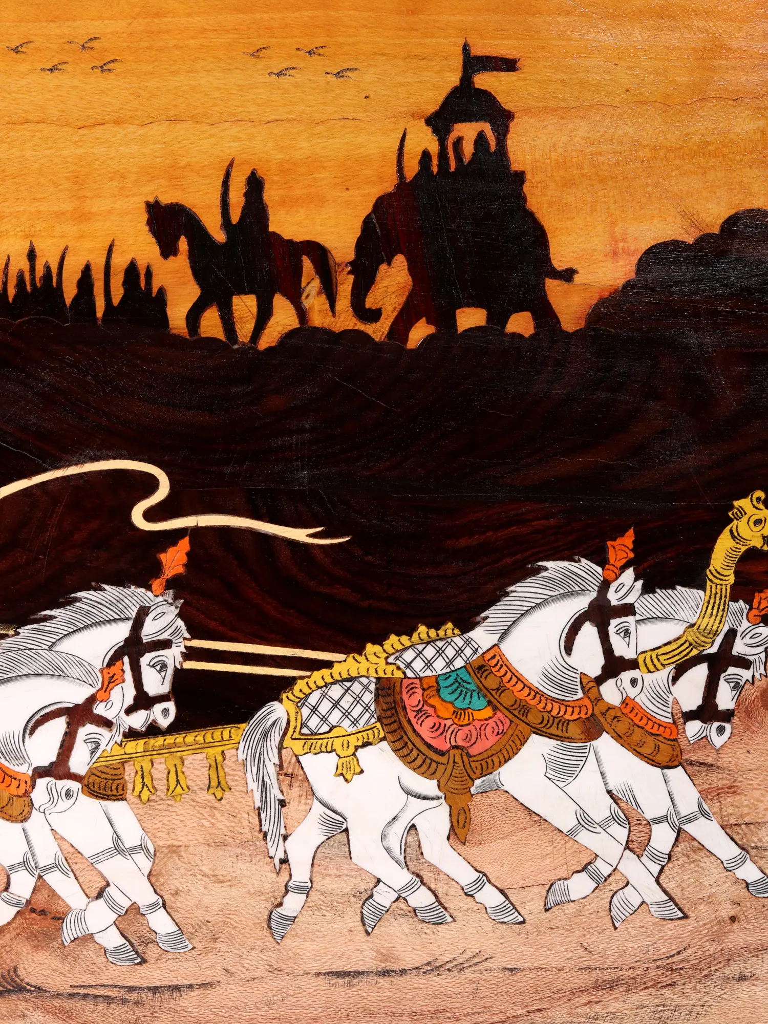The rich wooden canvas, measuring 36 inches in width and 24 inches in height, provides a grand stage for this sacred tableau. You will appreciate the dynamic composition, with the central figures of Lord Krishna and Arjuna commanding attention, their forms rendered with graceful lines and serene expressions. The surrounding details, from the majestic horses drawing the chariot to the distant figures on elephants and horseback, are rendered with a clarity and elegance that draws you deeper into the narrative. The subtle variations in the wood grain further enhance the visual richness, creating a truly captivating and harmonious whole.