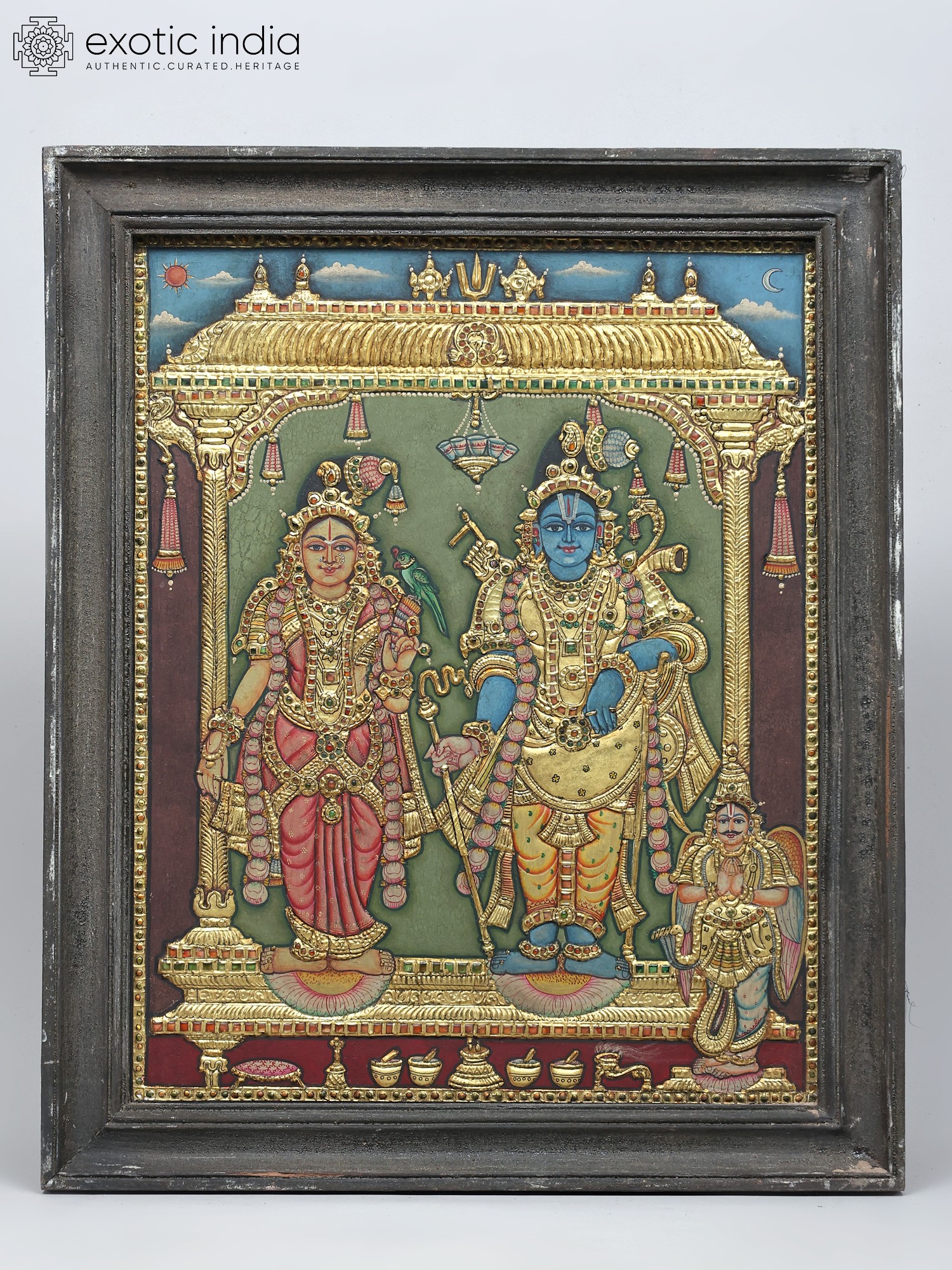 Standing Lord Perumal Tanjore Painting (Vishnu) with Devi Lakshmi | Super Embossed 3D Face Work | With Frame