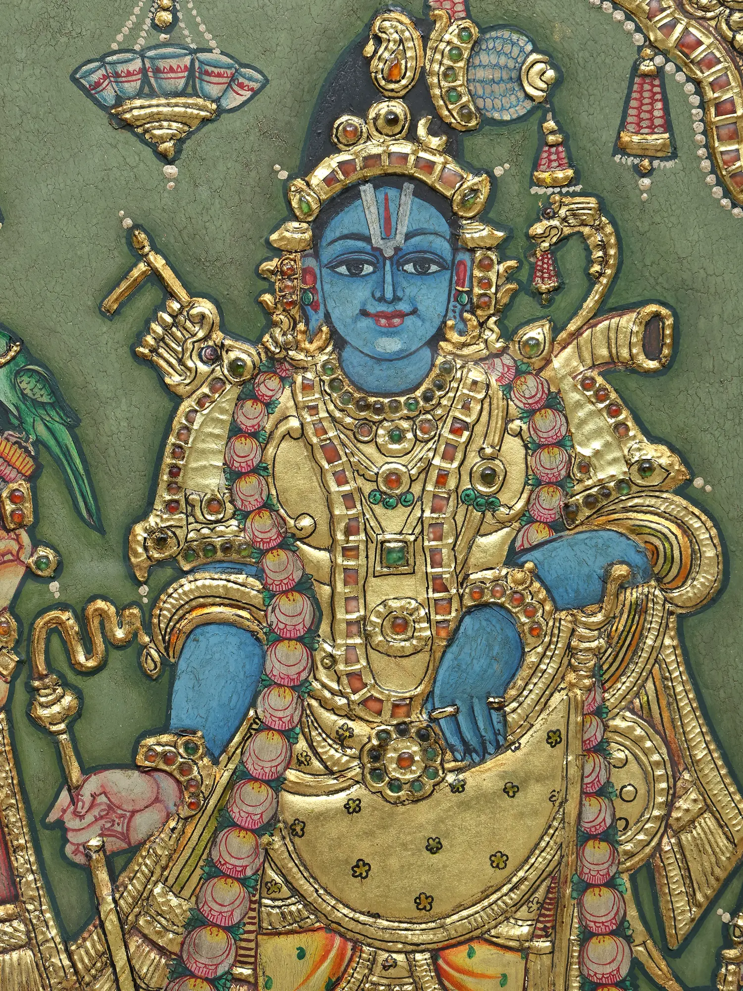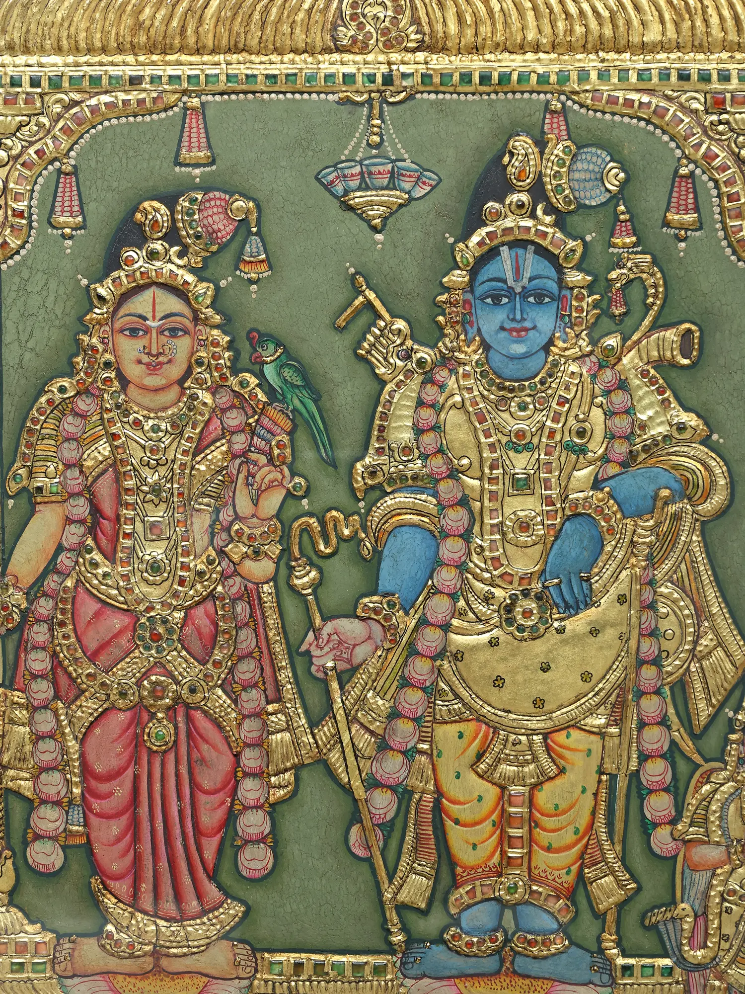 Showcases the traditional Thanjavur style with rich colors and a radiant 24-karat gold inlay.