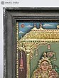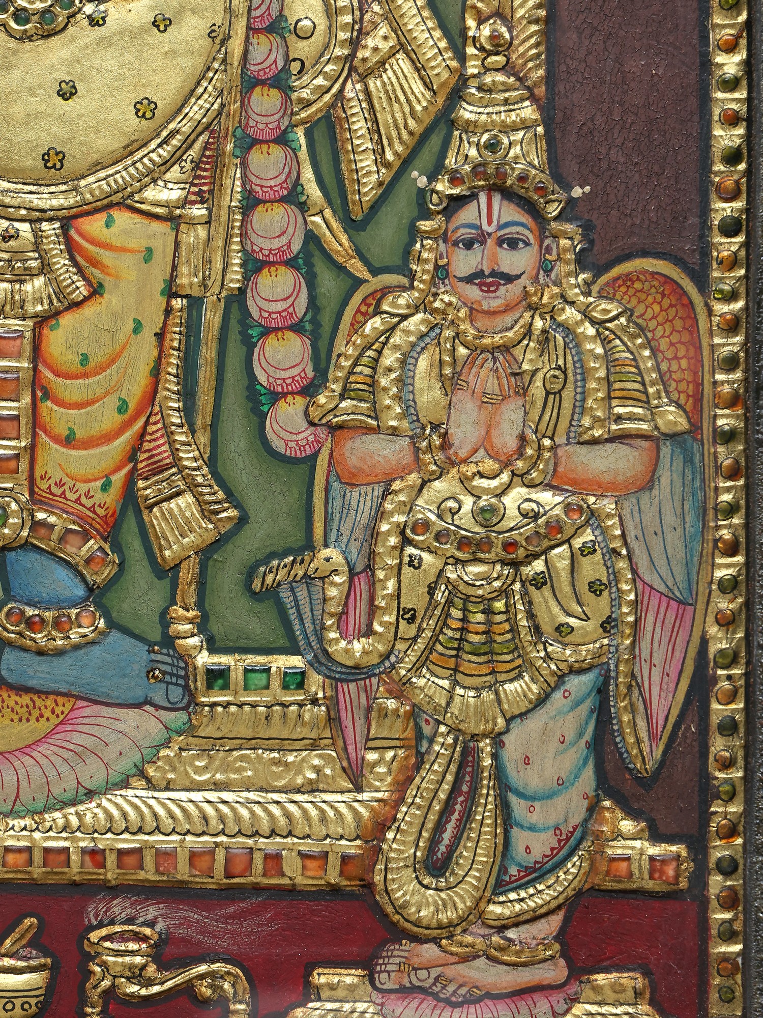 Tanjore paintings, originating from the town of Thanjavur in Tamil Nadu, are renowned for their unique style, characterized by rich colors, intricate detailing, and the generous use of gold foil. These paintings are typically created on a canvas stretched over a wooden plank, with the figures raised from the surface through the application of gesso and other materials, creating a bas-relief effect. Semi-precious stones and glass pieces are often embedded to enhance the ornamentation, though this particular piece focuses on the quintessential application of gold. The use of traditional natural pigments, derived from minerals and plants, contributes to the longevity and vibrance of the colors. The application of 24-karat gold foil imbues the artwork with a divine luminosity, symbolizing prosperity and auspiciousness. The inclusion of a vintage frame adds an element of antique charm and historical depth, making this piece not just a religious artifact but also a collector's item. This artwork is a window into a rich cultural and artistic tradition, offering a tangible connection to India's spiritual and artistic heritage.
