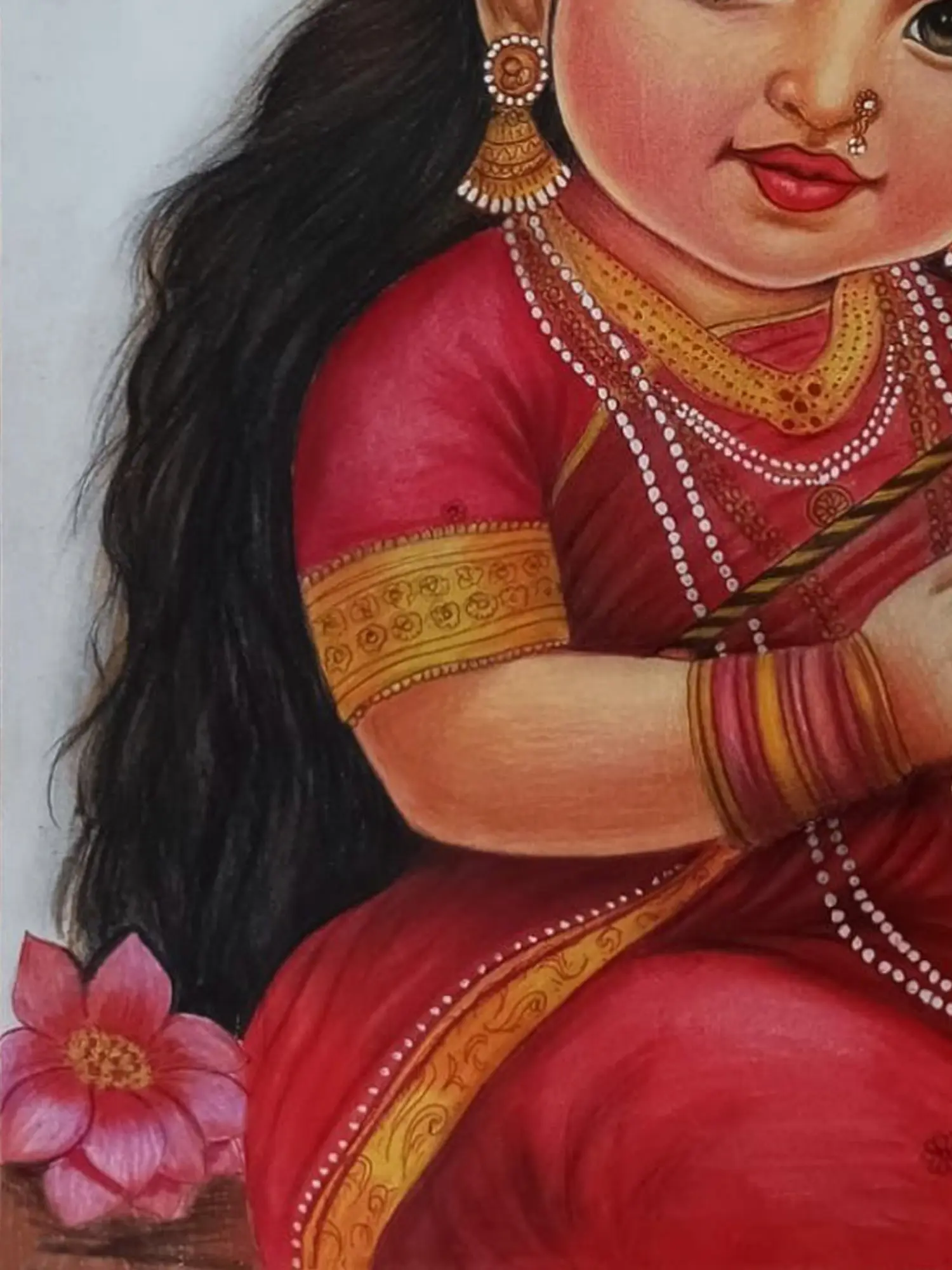 In this mesmerizing artwork, Goddess Durga, the formidable deity, also known as the “Mahisa-Mardini,” takes on the guise of a precious little girl, her innocence juxtaposed with her awe-inspiring power. Adorned with splendor, she cradles a majestic lion in her lap, symbolizing her indomitable spirit and protection over all beings.