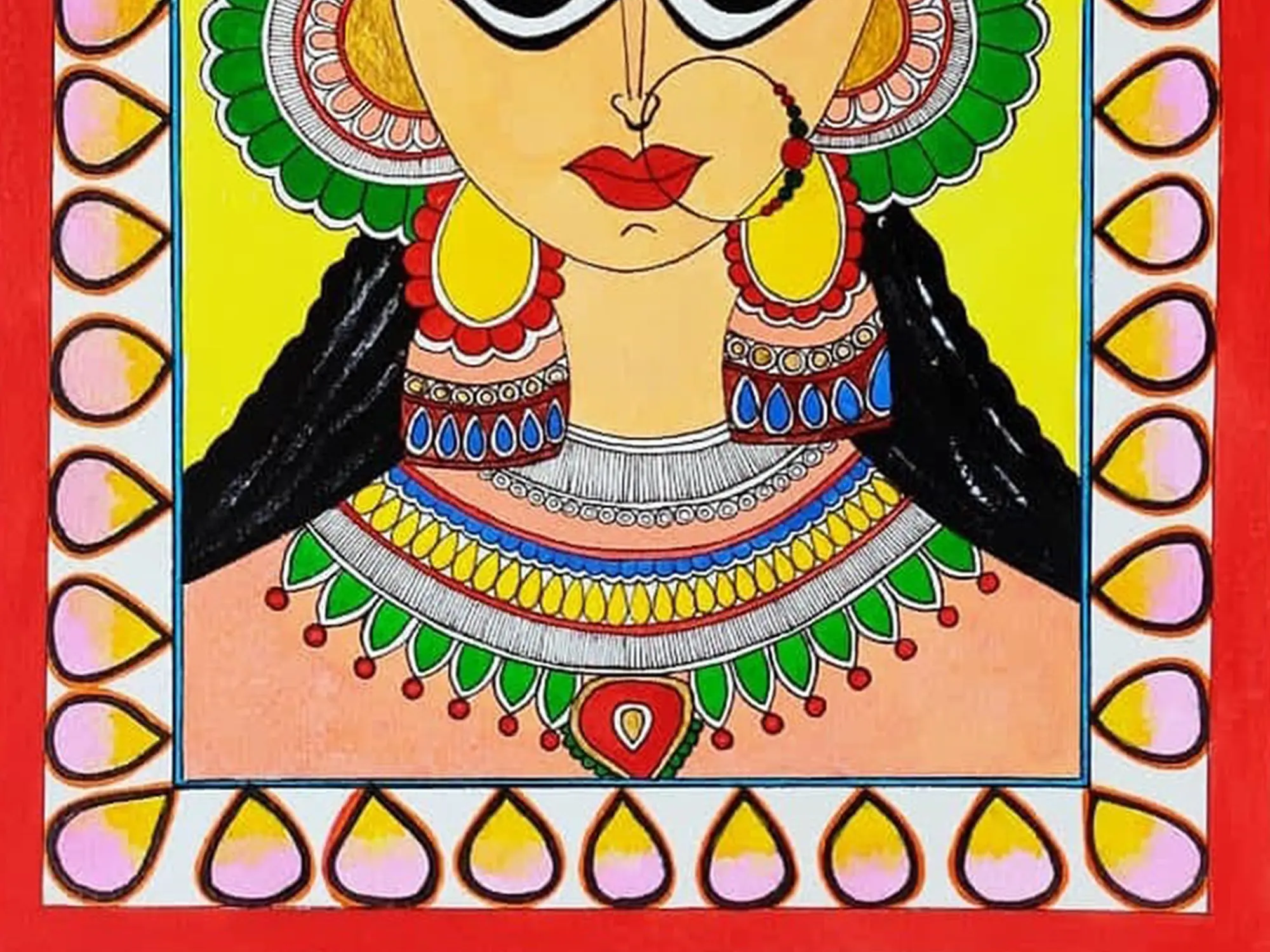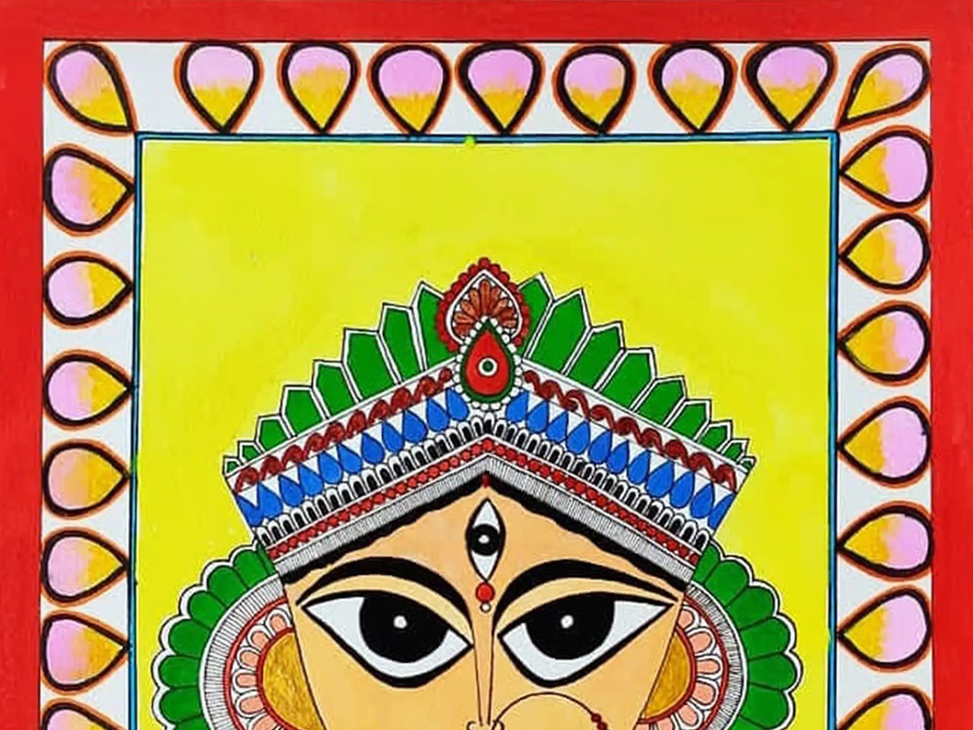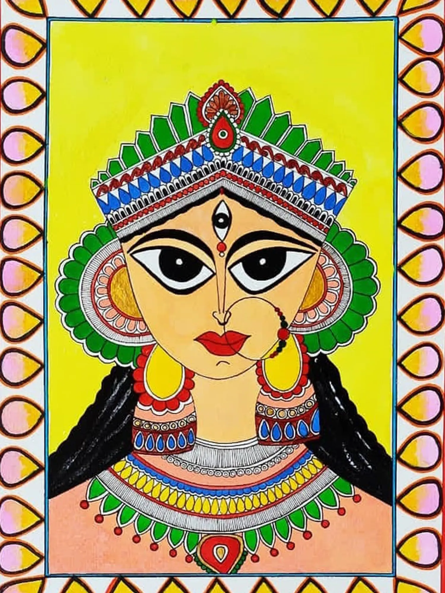 The paper canvas becomes a sacred realm, adorned with traditional motifs and rich cultural storytelling. Tripathi's mastery of Madhubani intricacies pays homage to the divine feminine, creating a visually enchanting portrayal that resonates with both artistic finesse and spiritual reverence. The painting is a testament to the cultural depth embedded in Madhubani tradition.