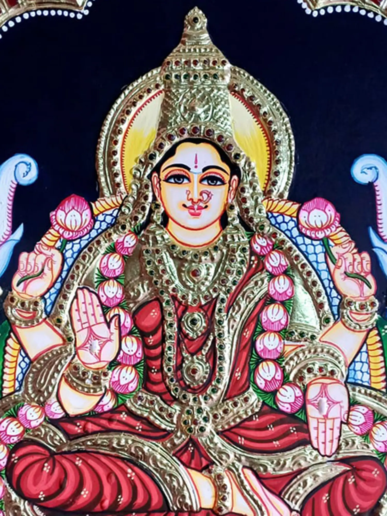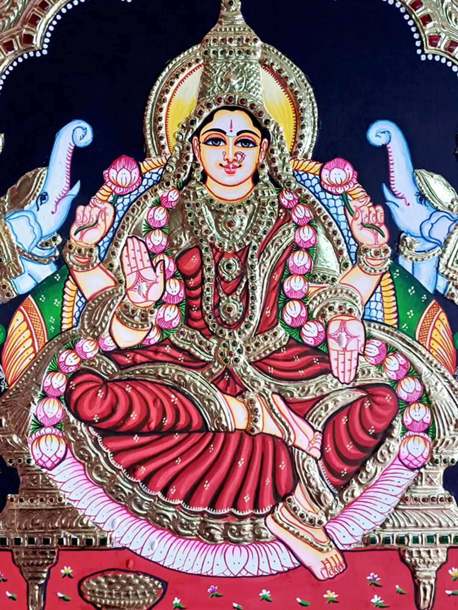 This Tanjore painting uses shading and gold work to bring the regal aura of Gajalakshmi to life.