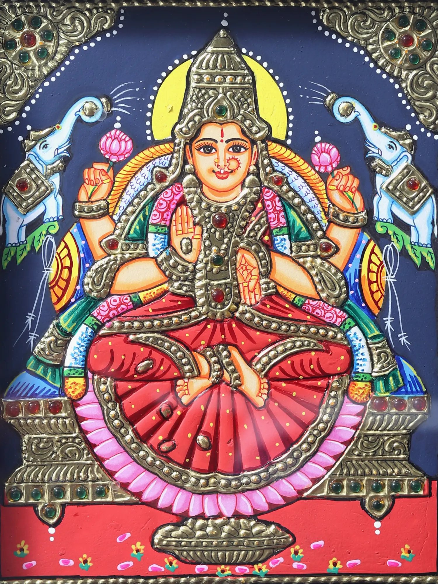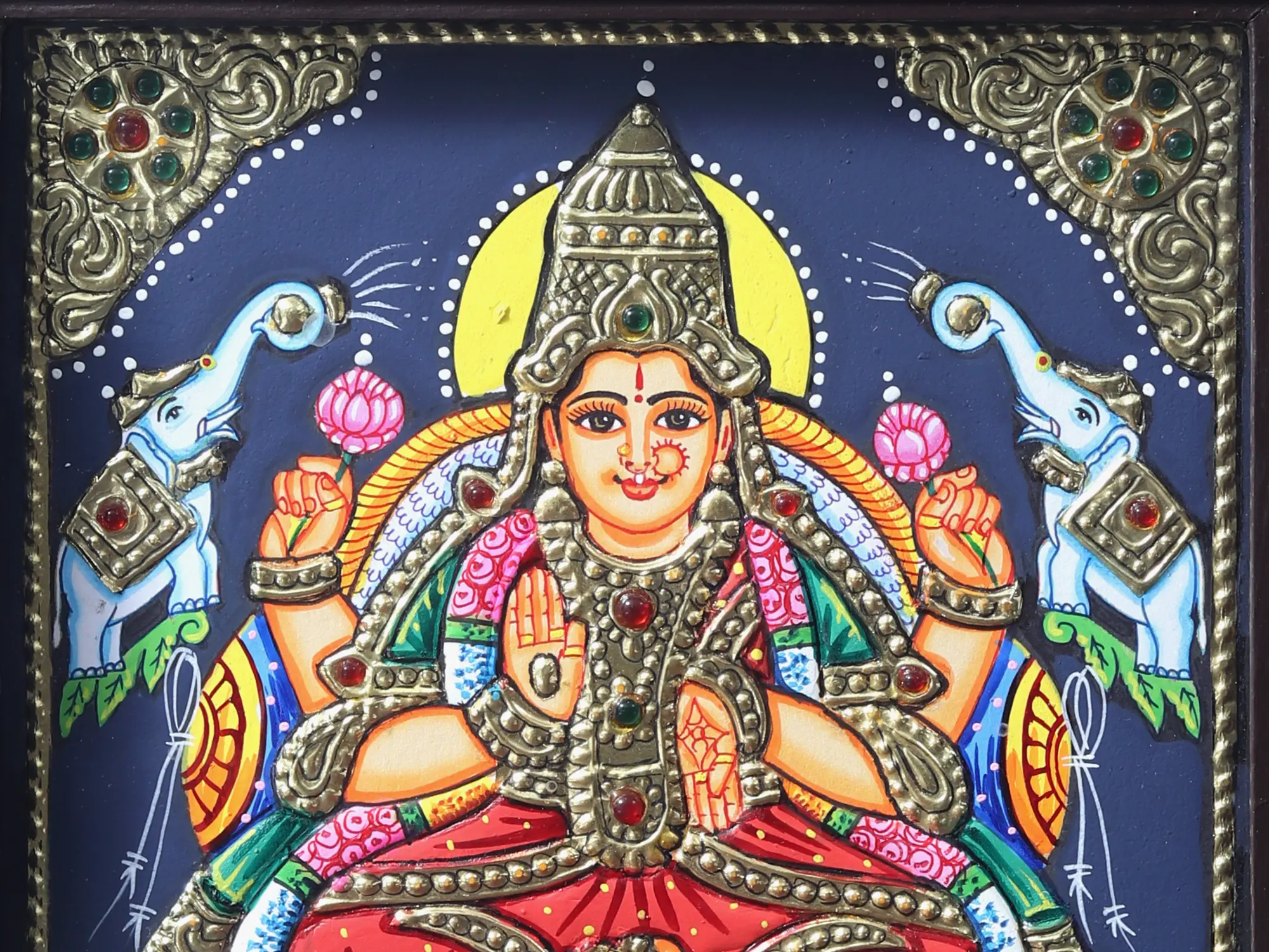 In the durable embrace of a teakwood frame, the divine Goddess Gajalakshmi graces this Tanjore painting. Her presence radiates opulence and abundance, a symbol of prosperity's gentle touch. Adorned with golden embellishments, she sits upon a lotus throne, her six hands bestowing blessings and wealth upon all who seek her grace. With each glance, she showers you with the blessings of wealth, wisdom, and well-being. Invite her into your home and let her effulgent aura fill your space with affluence and harmony.