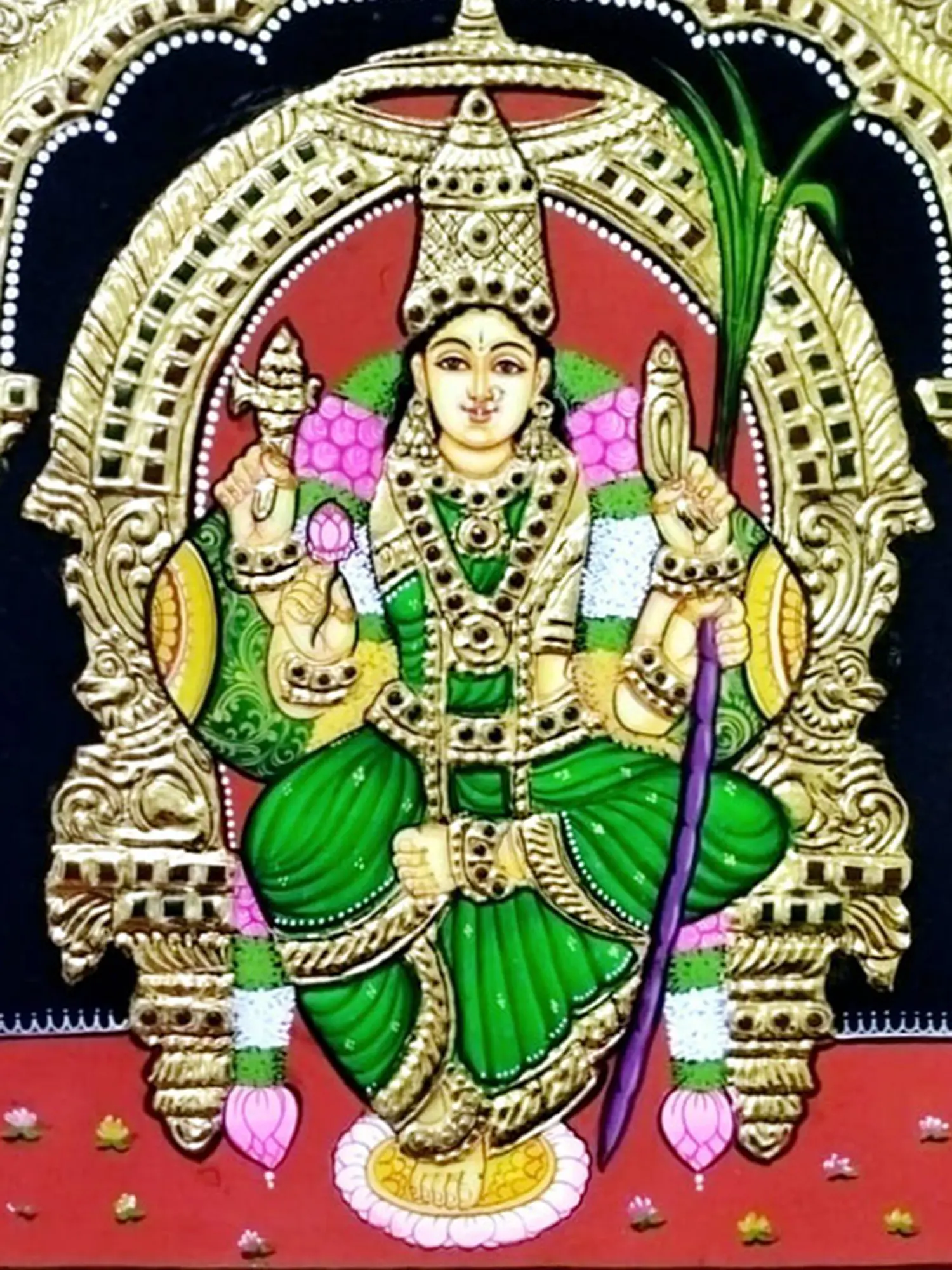 The mighty Hindu goddess is presented in traditional Tanjore iconography, draped in a green saree, the color of fertility and life- virtues associated with Kamakshmi Amman.