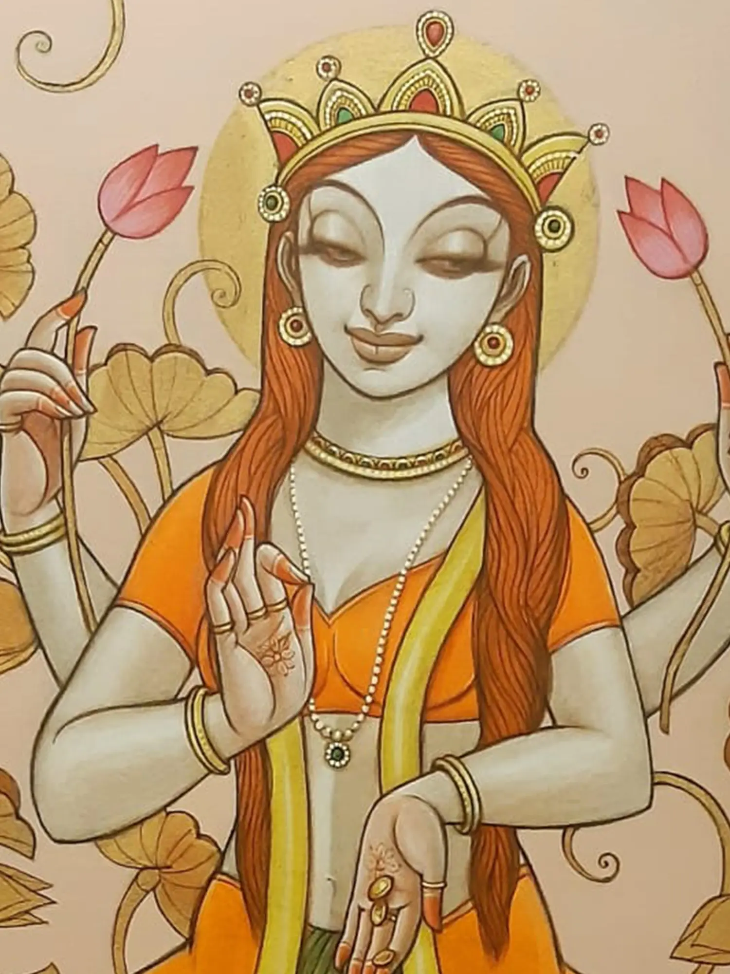 Lakshmi's origins are rooted in ancient Vedic texts, and she is often associated with Vishnu, the preserver of the universe. One of the most well-known tales recounts her emergence from the churning of the cosmic ocean (Samudra Manthan). As the gods and demons churned the ocean in search of Amrita (the nectar of immortality), Lakshmi arose, seated on a lotus, radiating beauty and auspiciousness. She then chose Vishnu as her consort, symbolizing the harmonious balance between material prosperity and spiritual preservation. This painting captures the essence of Lakshmi's divine emergence and her promise of abundance to those who seek her blessings with a pure heart. The figures painted along the hem of her clothing seems to be further telling her story. This painting is not just a decorative piece; it's an invitation to invite prosperity and well-being into your life and home. The mixed media on canvas creates a rich texture and depth, ensuring that this artwork will be a cherished heirloom for generations to come.