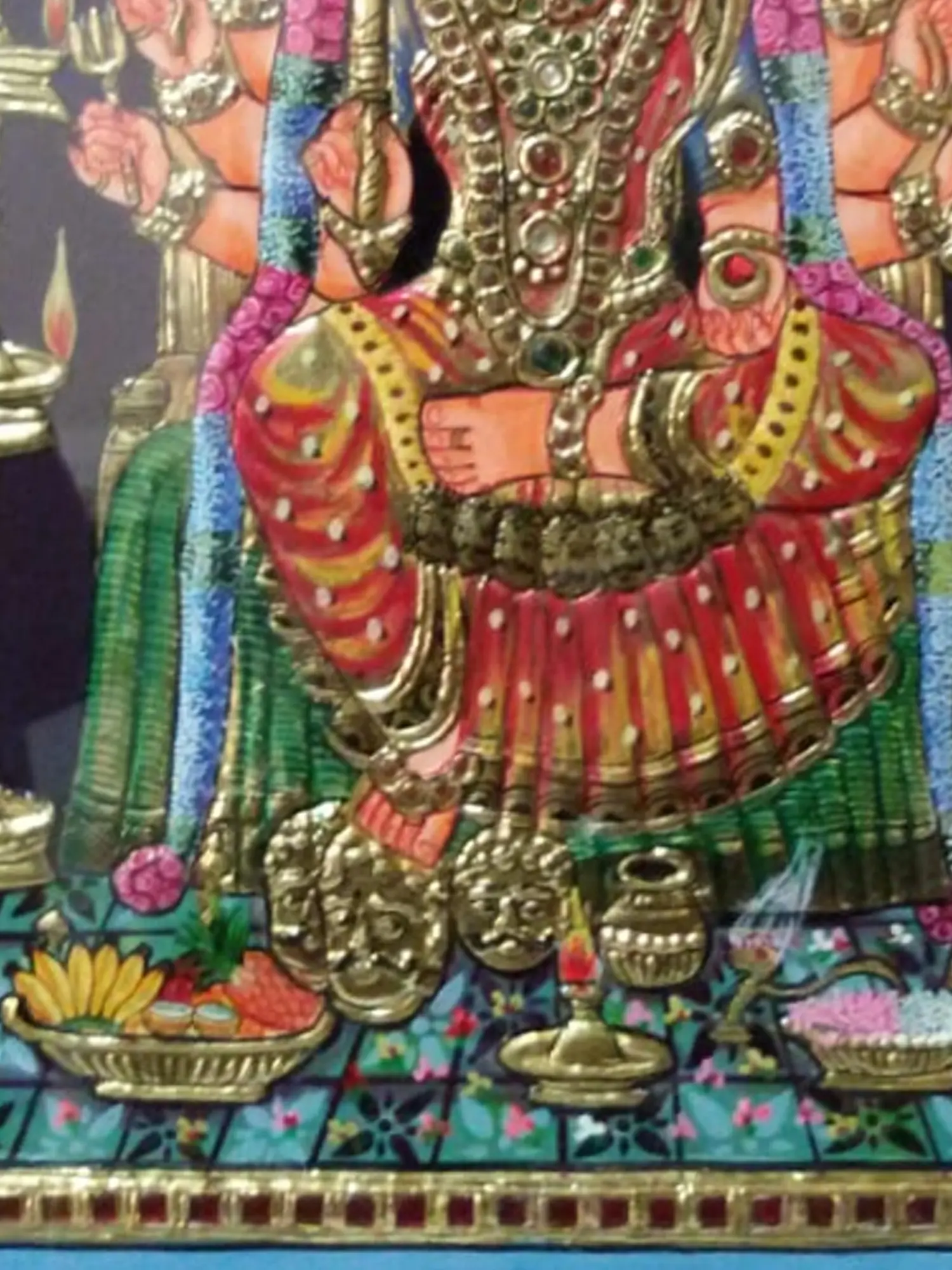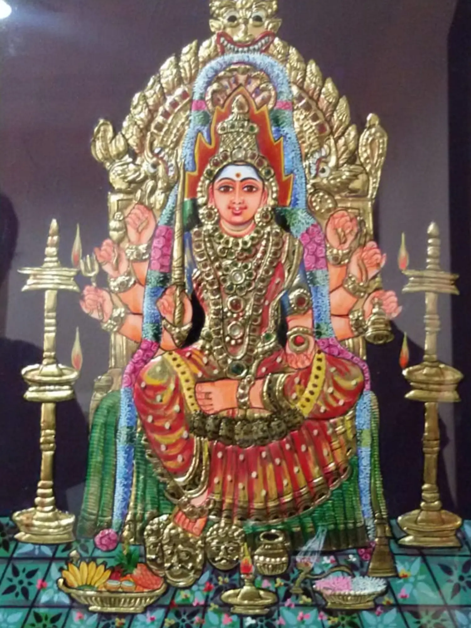 A divine and portable image of the goddess Mariamman, this Tanjore painting brings the nurturing and protecting energies of the mother goddess with its traditional asthetics.