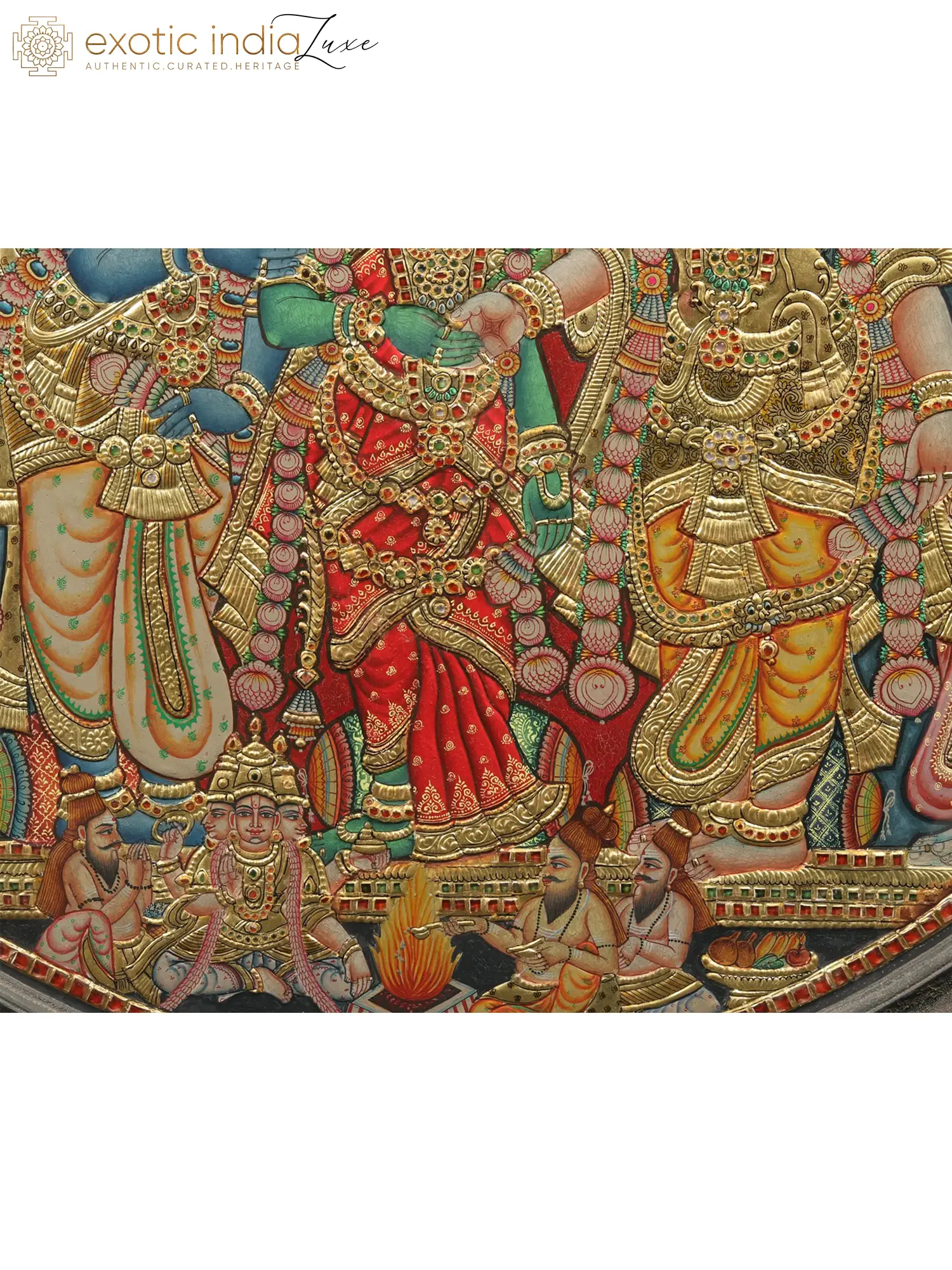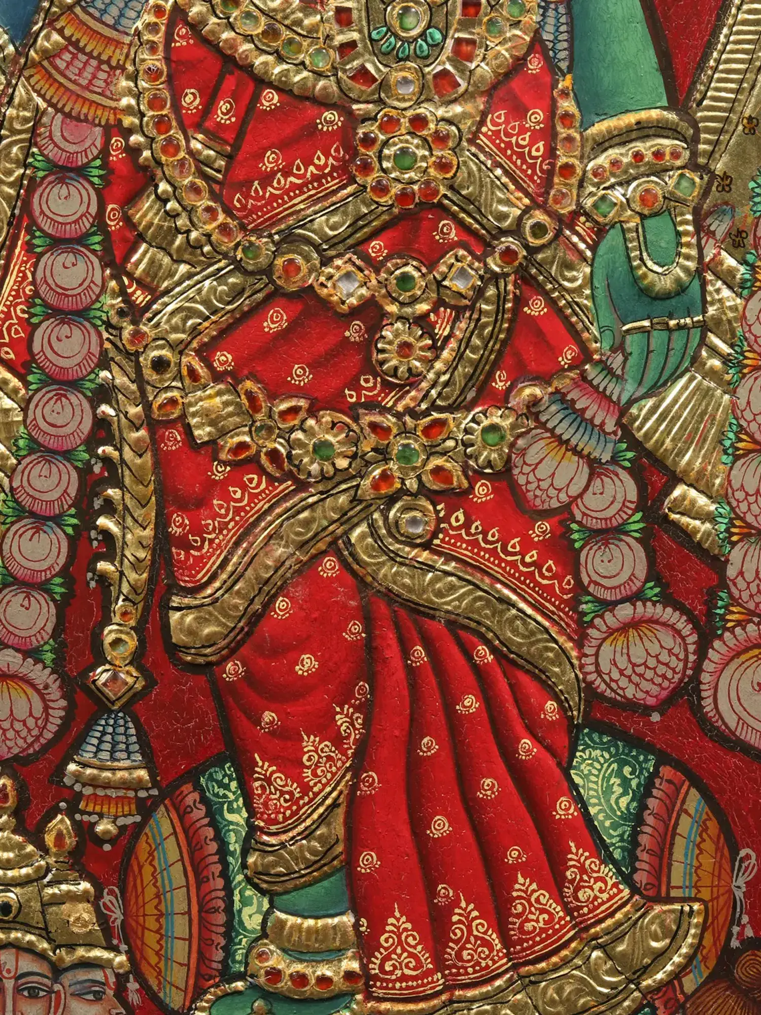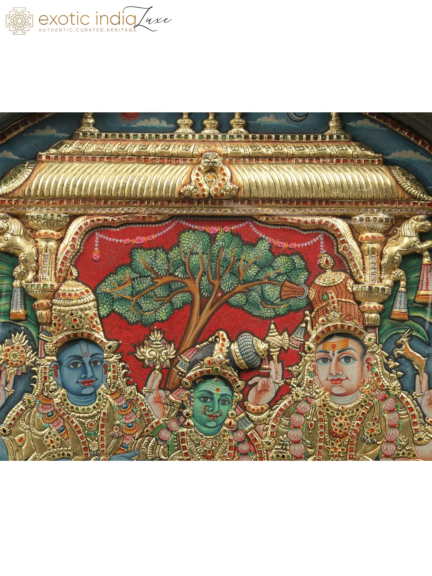 This stunning painting portrays the celestial wedding of Goddess Meenakshi, the embodiment of grace and power, and Lord Sundareswarar. Their divine union, portrayed with intricate detail and devotion, captures the essence of love and devotion, transcending earthly realms. The use of radiant gold work elevates this artwork to a celestial plane. Every delicate touch of gold enhances the Tanjore's splendour, creating an ethereal luminescence that mirrors the divine aura of Goddess Meenakshi and her divine consort.