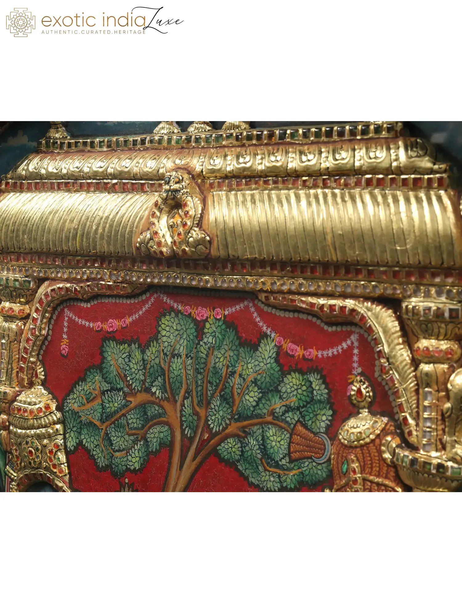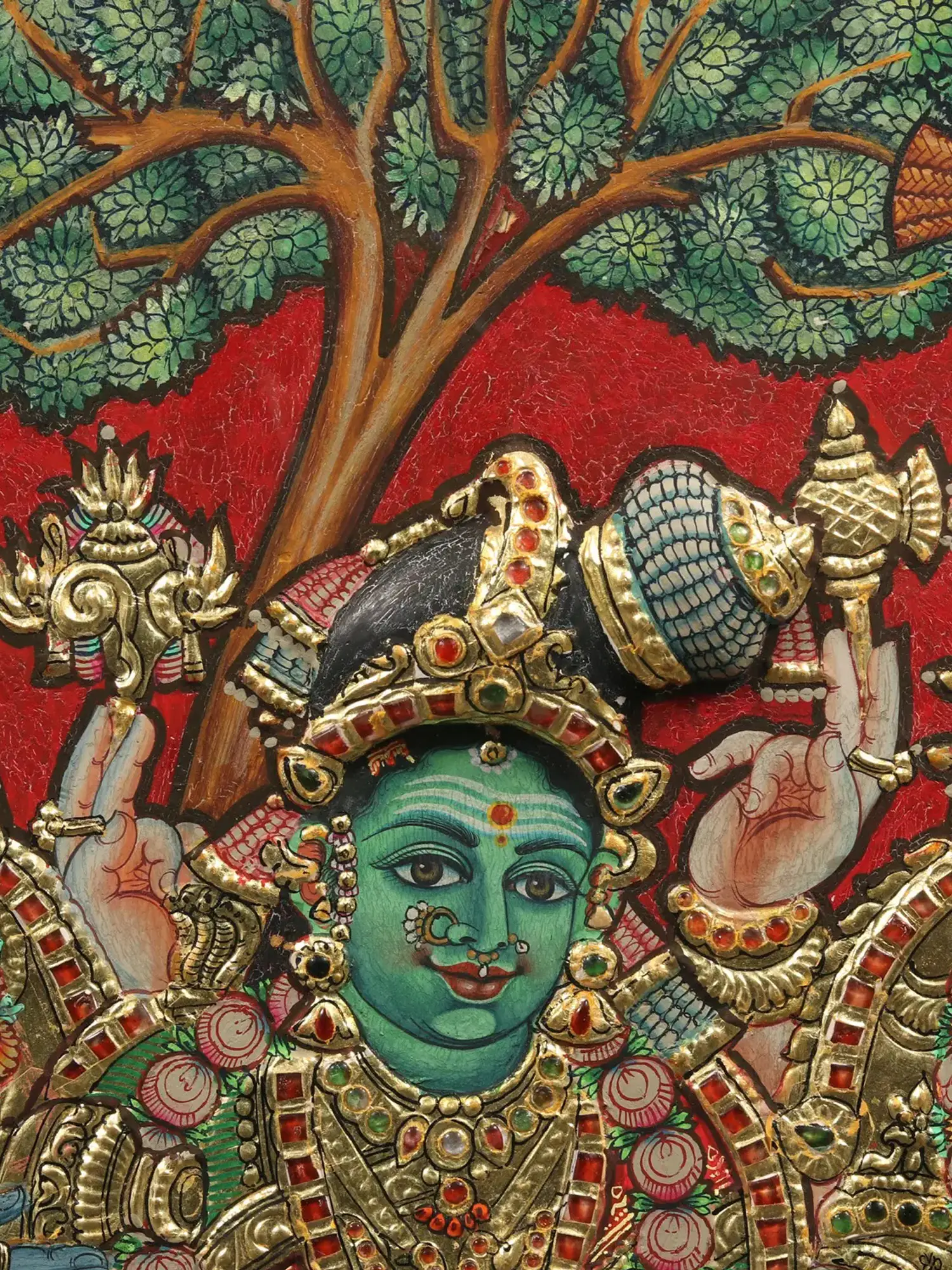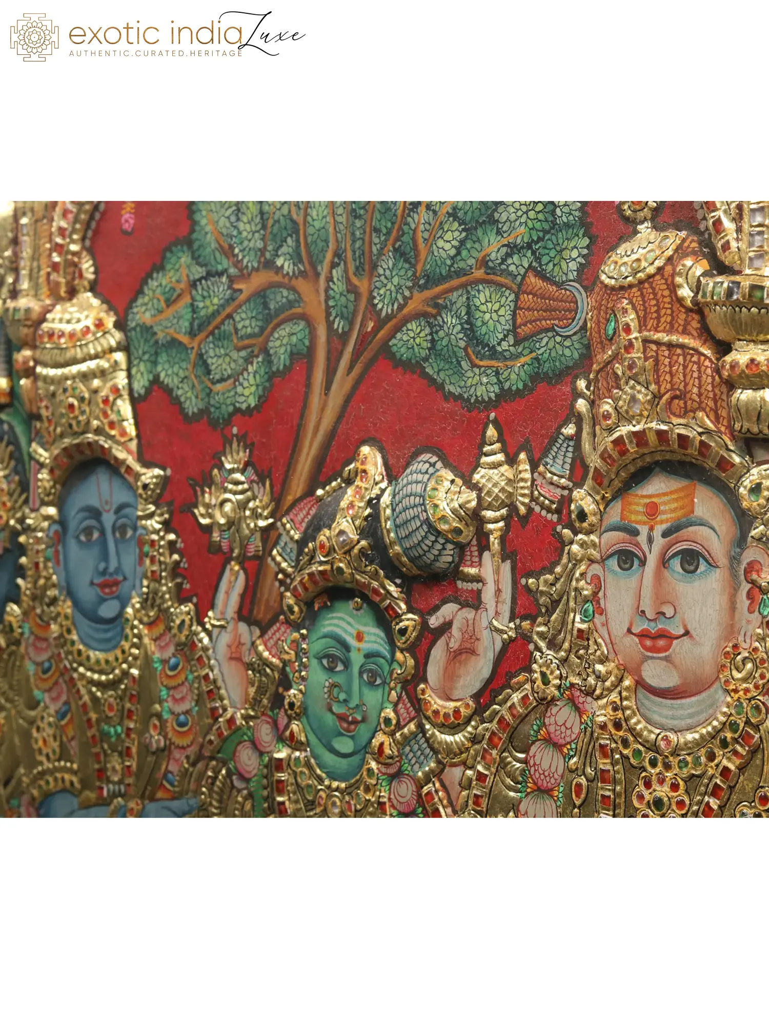 This stunning painting portrays the celestial wedding of Goddess Meenakshi, the embodiment of grace and power, and Lord Sundareswarar. Their divine union, portrayed with intricate detail and devotion, captures the essence of love and devotion, transcending earthly realms. The use of radiant gold work elevates this artwork to a celestial plane. Every delicate touch of gold enhances the Tanjore's splendour, creating an ethereal luminescence that mirrors the divine aura of Goddess Meenakshi and her divine consort.