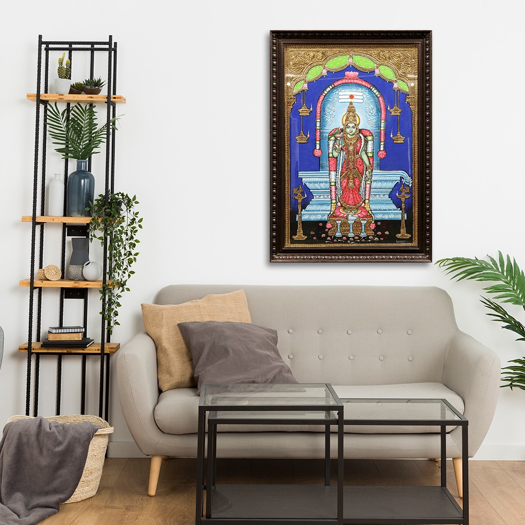This Tanjore artwork carries the stories of devotion, the harmony of divine energies, and the eternal grace of Goddess Meenakshi. Her resplendent form, adorned with intricate detail and devotion, emanates a celestial glow—a reminder that the divine presence is both gentle and all-encompassing. In the backdrop, the sacred Shivlinga stands as a symbol of Lord Shiva, the eternal source of creation and destruction. This divine union between Meenakshi and Shiva signifies the harmonious balance of the feminine and masculine energies, a cosmic dance that sustains the universe.