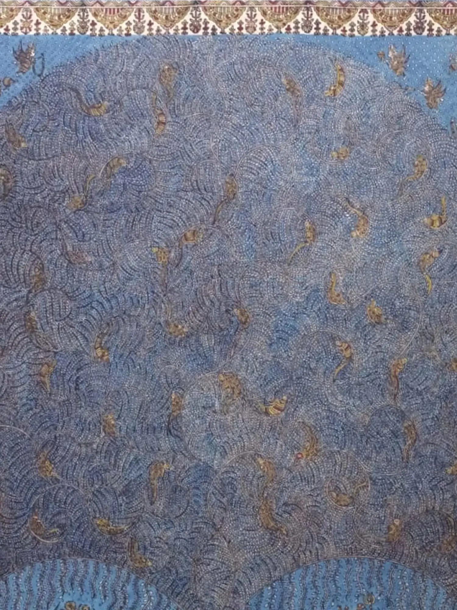 The canvas itself measures an impressive 34 inches in height and 32 inches in width, providing a substantial and captivating presence. A vibrant blue forms the backdrop, creating a serene yet celestial atmosphere. Adorning the edges, you'll discover decorative borders that frame the scene with subtle elegance, hinting at the richness contained within. Within the composition, a magnificent tree dominates, its cascading foliage rendered with an almost ethereal quality.