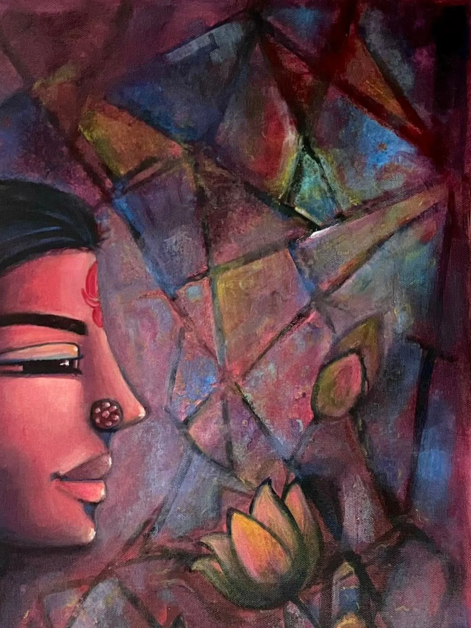 Kangana Vohra’s artistic vision brings a contemporary sensibility to this depiction of Parvati. The composition features bold geometric patterns as a modern take on the traditional. The texture and depth achieved through the acrylic on canvas technique give the artwork a vibrant, three-dimensional quality. The painting is a beautiful fusion of tradition and modernity, making it a perfect addition to any home or sacred space. The strokes of vibrant color used to show Parvati make her all the more lively and captivating. Whether you are a devout follower, an art enthusiast, or simply someone who appreciates beauty, this painting is sure to inspire and uplift.