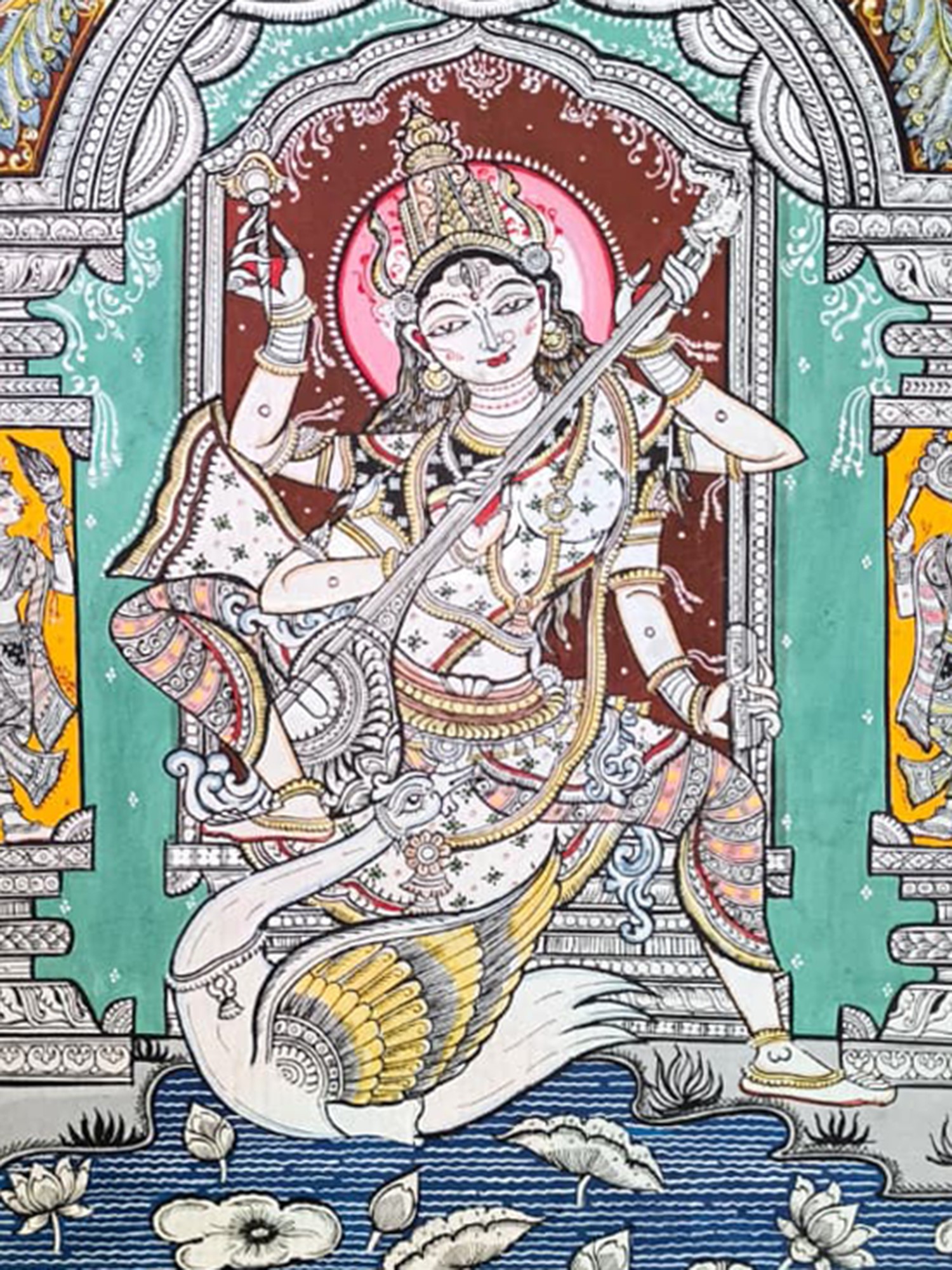 Goddess Saraswati Seated on Swan | Kalamkari Painting